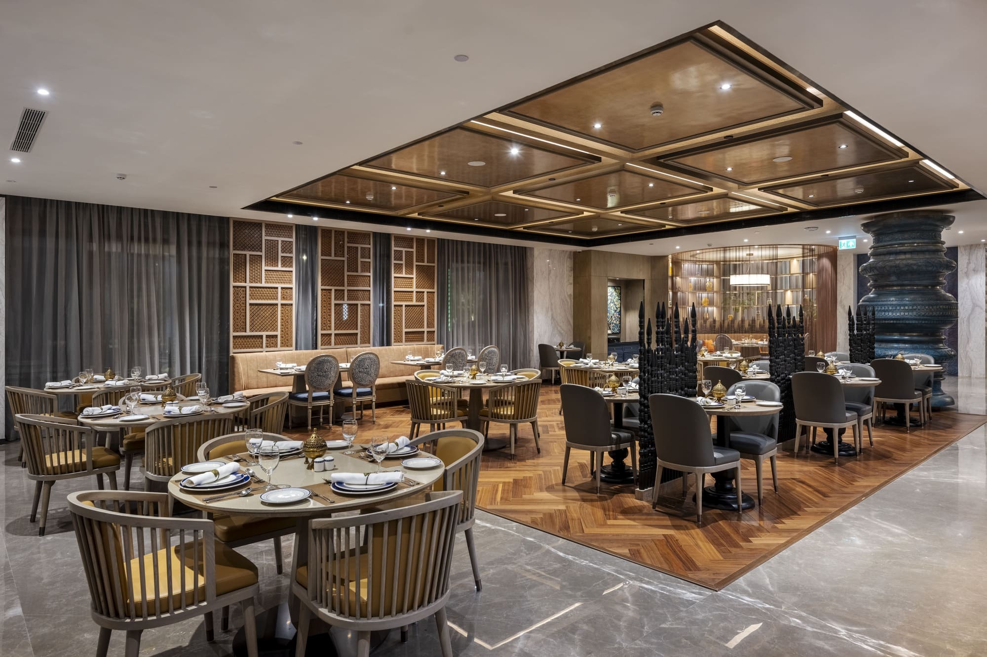 The design draws inspirations from the grandeur of the Nizams through the use of shades of yellow and gold, intricate wall motifs, and hanging lights from the ceilings, all of which reflect the architectural elegance of the time. A hint of modernity can be observed in the use of pearls in wall artworks and contemporary lighting.