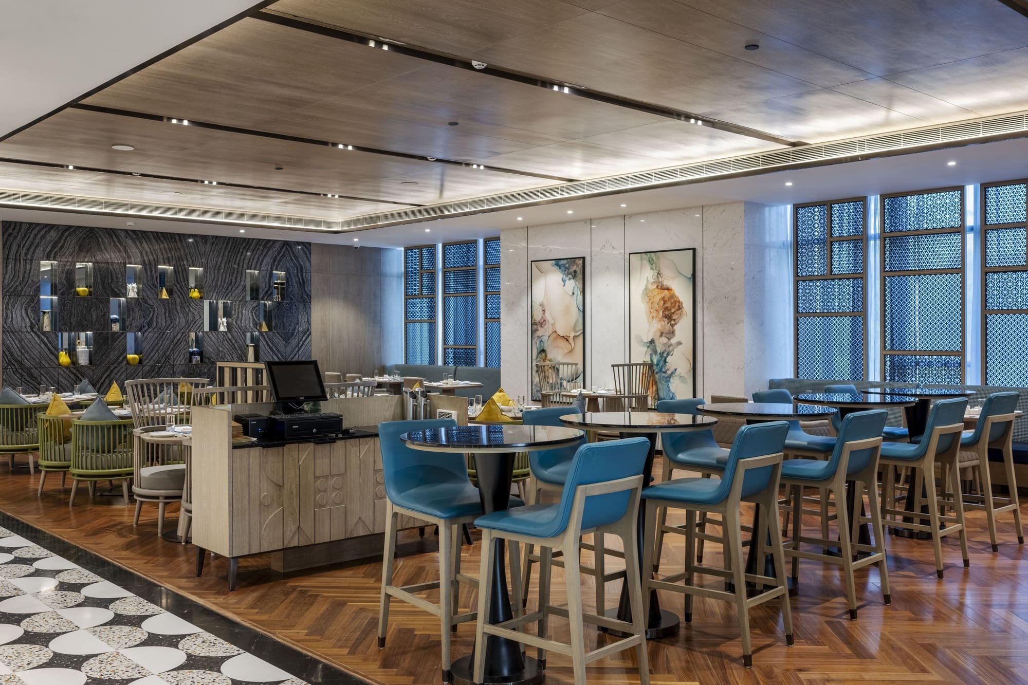 The principal materials used in the design include stone, metal, and glass, each chosen to reflect the club’s ethos of elegance and durability. The thoughtful combination of these materials enhances the club’s aesthetic appeal, making 17 Degrees North Club a landmark of luxury in Hyderabad.