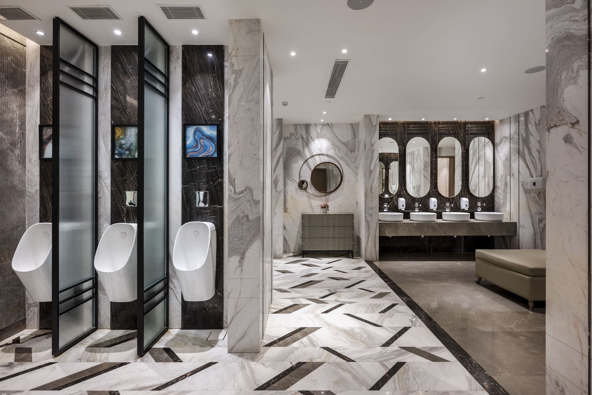 Upon entering the club, guests are greeted at the grand lobby, which features a modern reception desk set against the backdrop of rustic marble. A wonderful parametric crystal chandelier cascades through the double-height space, connecting the reception space with the waiting lounge, symbolising the gem industry that is almost synonymous with Hyderabad.