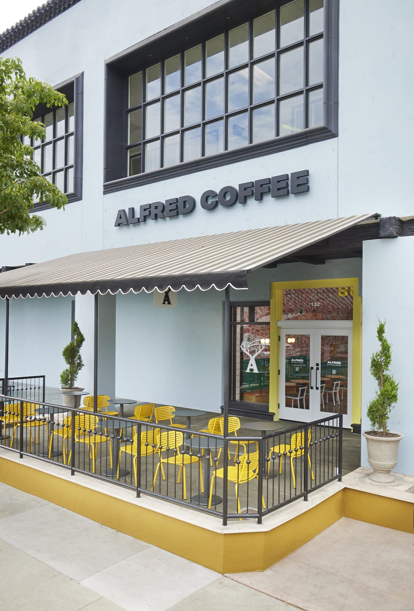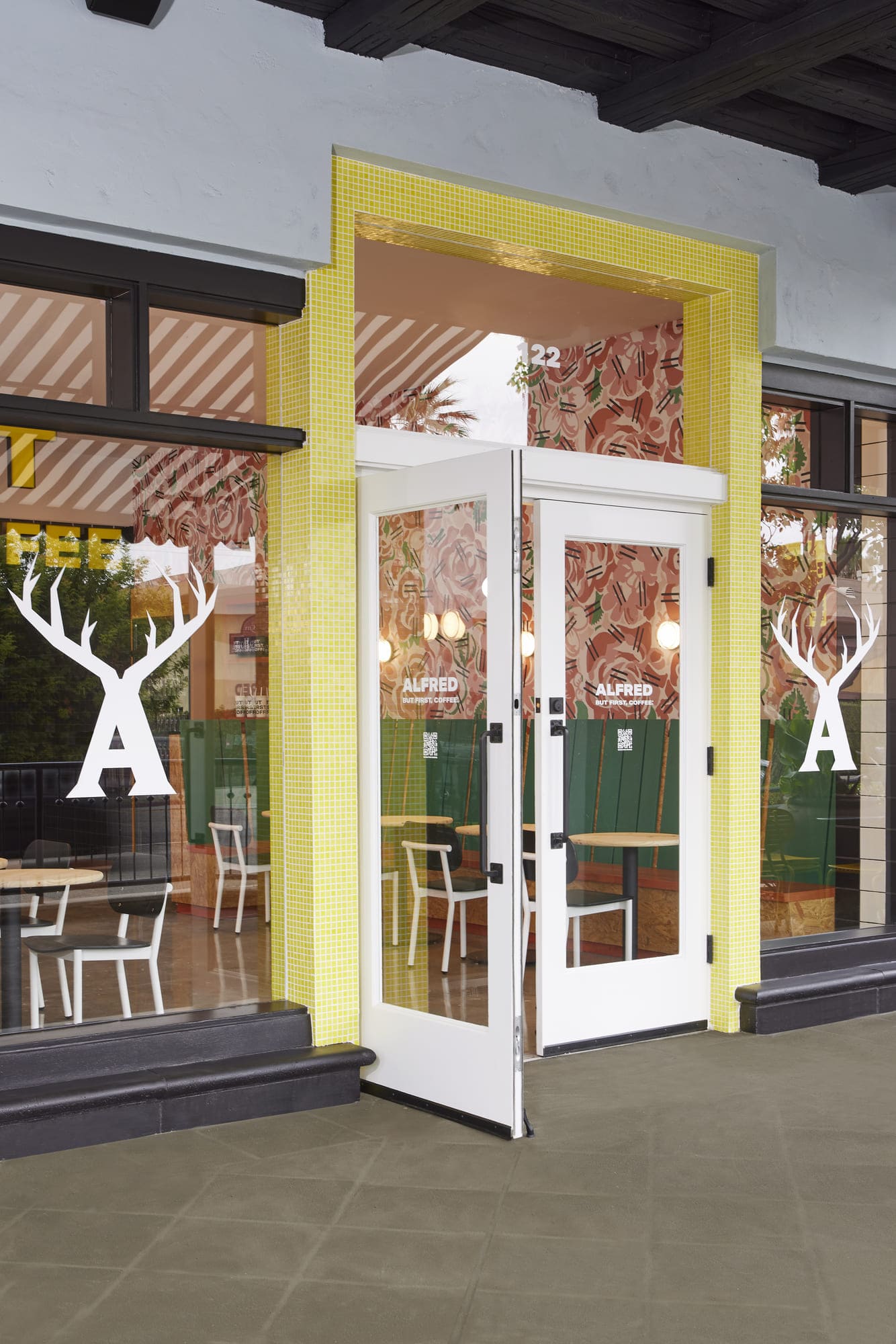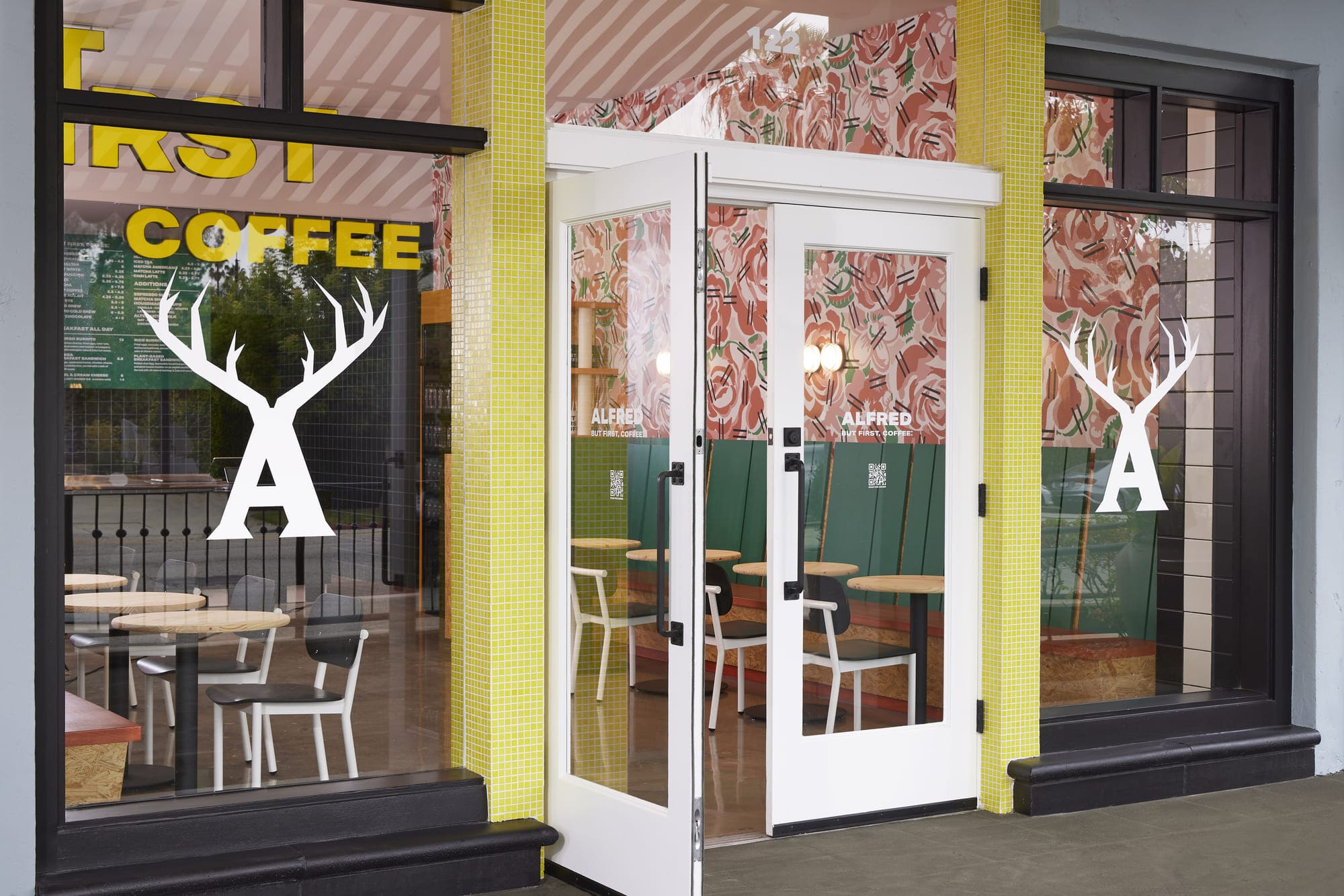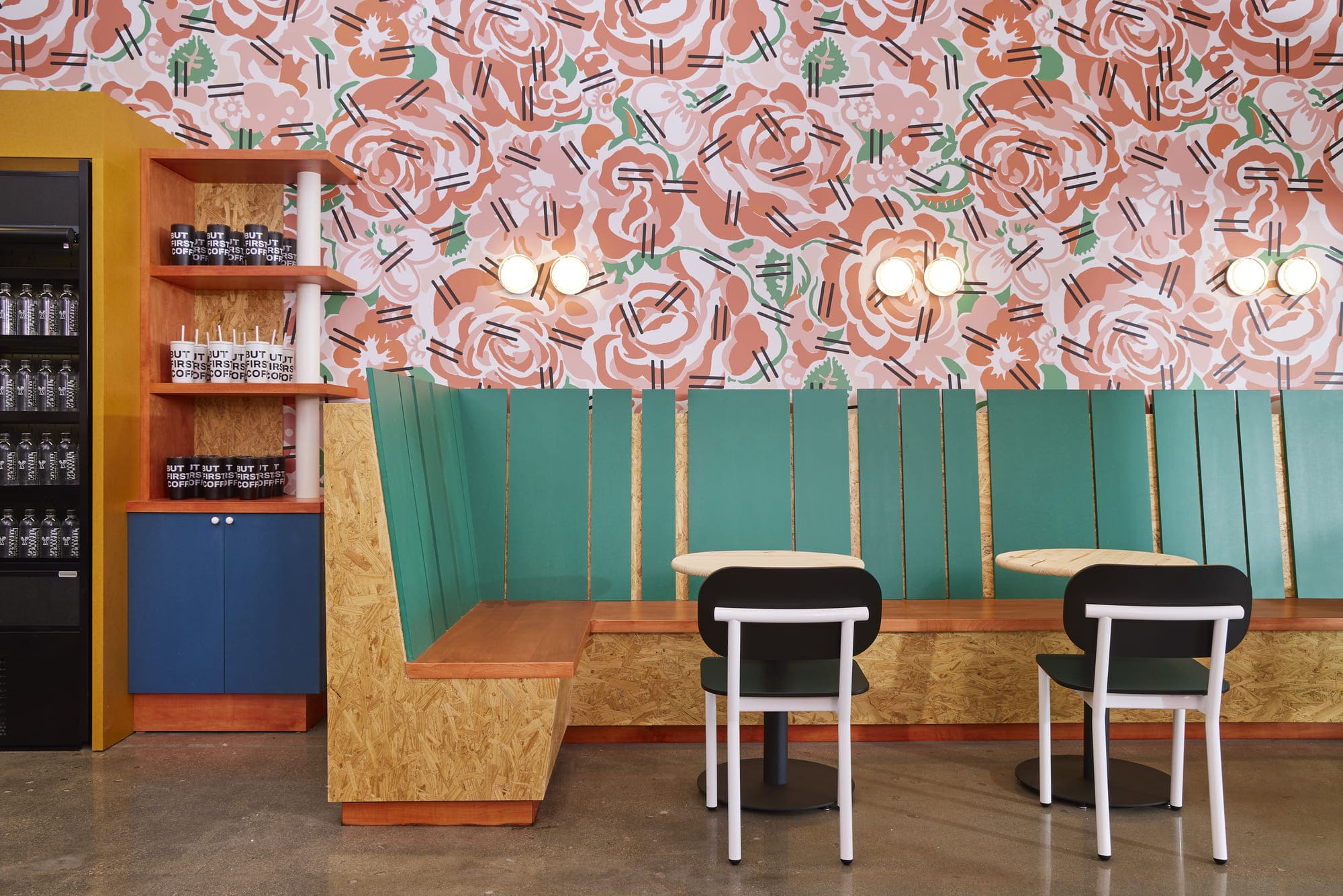 Ten unique locations in, it was time for the collaboration between Studio Sucio and Alfred Coffee to establish a design core for the growing brand. The Sherman Oaks location was built to set the design standard, with flexibility to layer on unique elements as the brand continues it’s trip out into the big wide world. The vibrant base is set with black and white striped awnings, floral wallpaper; a dream collaboration with Venturi Scott Brown who granted license for the classic Grandmother Pattern to be blown up huge, the back painted glass menu in juicy colors, with pairs of glass wall sconce lights, grids of ceramic tile, and the Alfred trademarked motto, “But First, Coffee” landing uniquely in each space. In this case, writ large. Added to the recipe is an eco system of sociable banquette seating and shelving built from non-toxic organic dyed fiberboard, raw chipboard, and chairs made in the USA from the Grand Rapids Chair Company. A slam of energetic style to suit the caffeine suppliers of Los Angeles, and soon, the world.