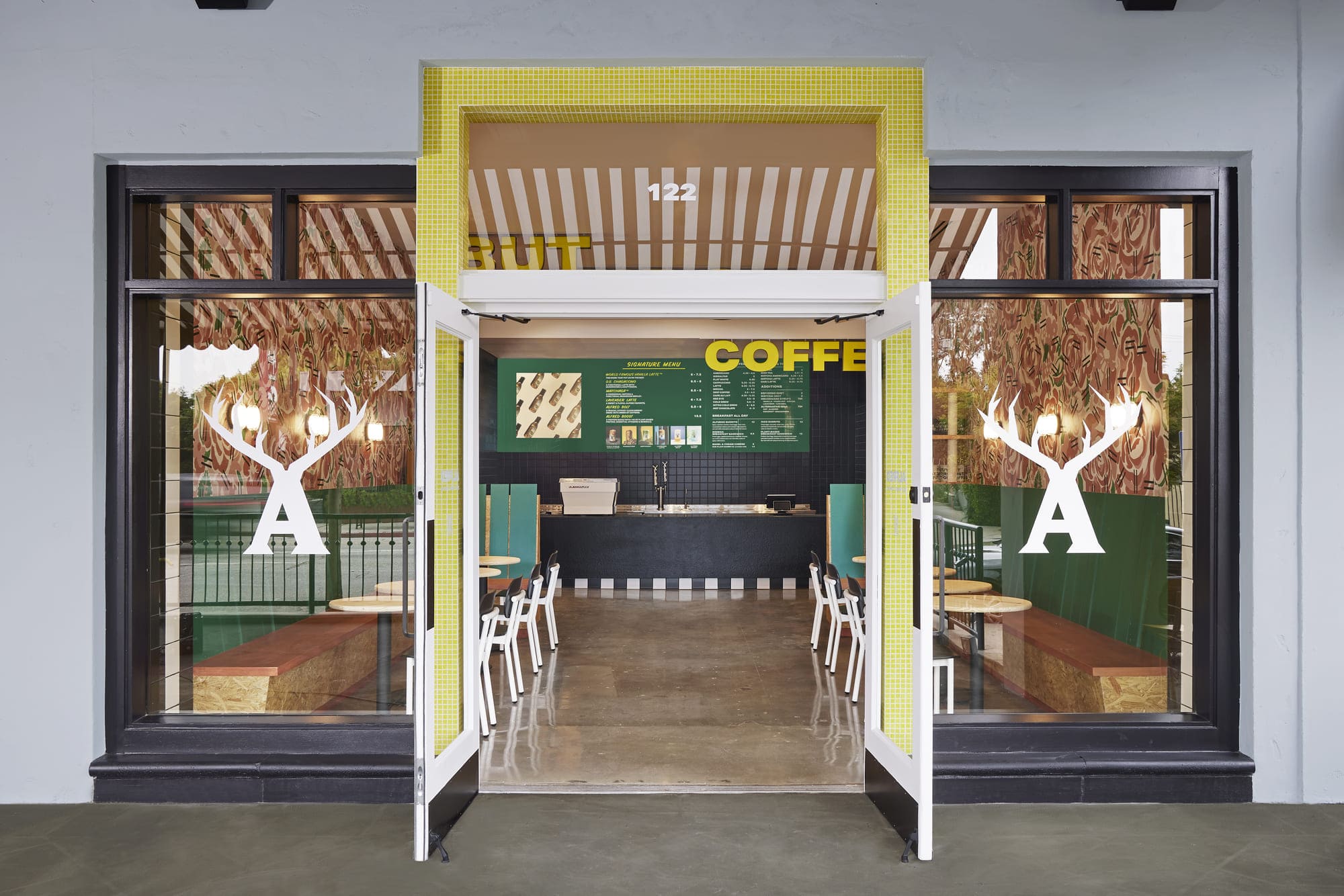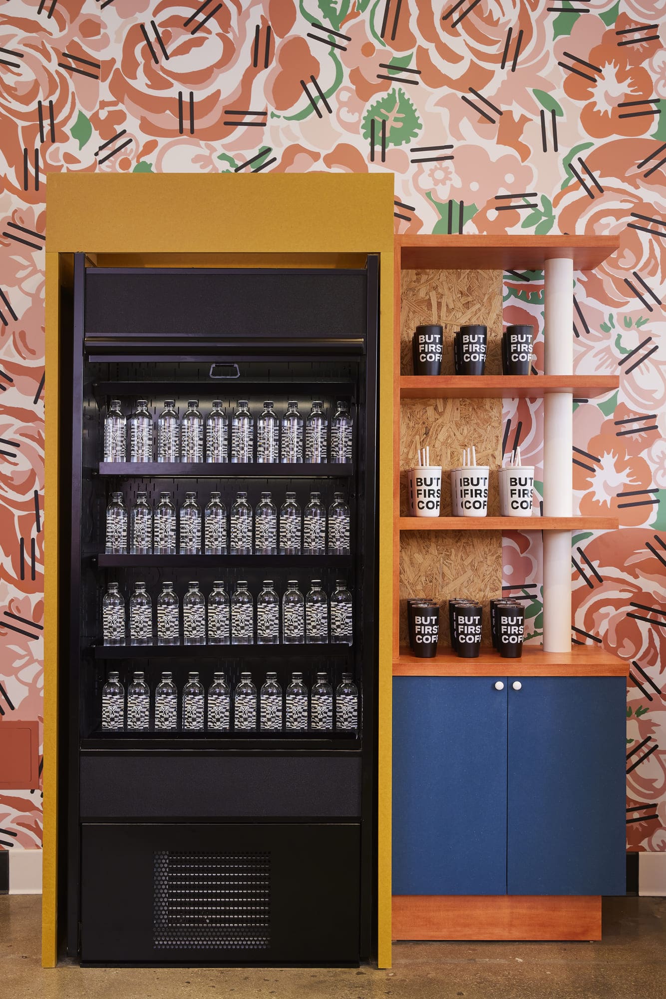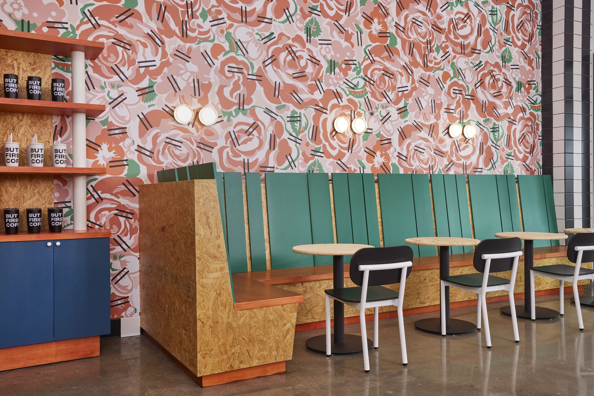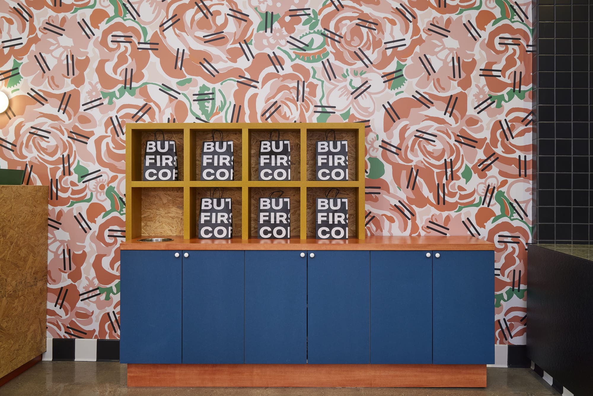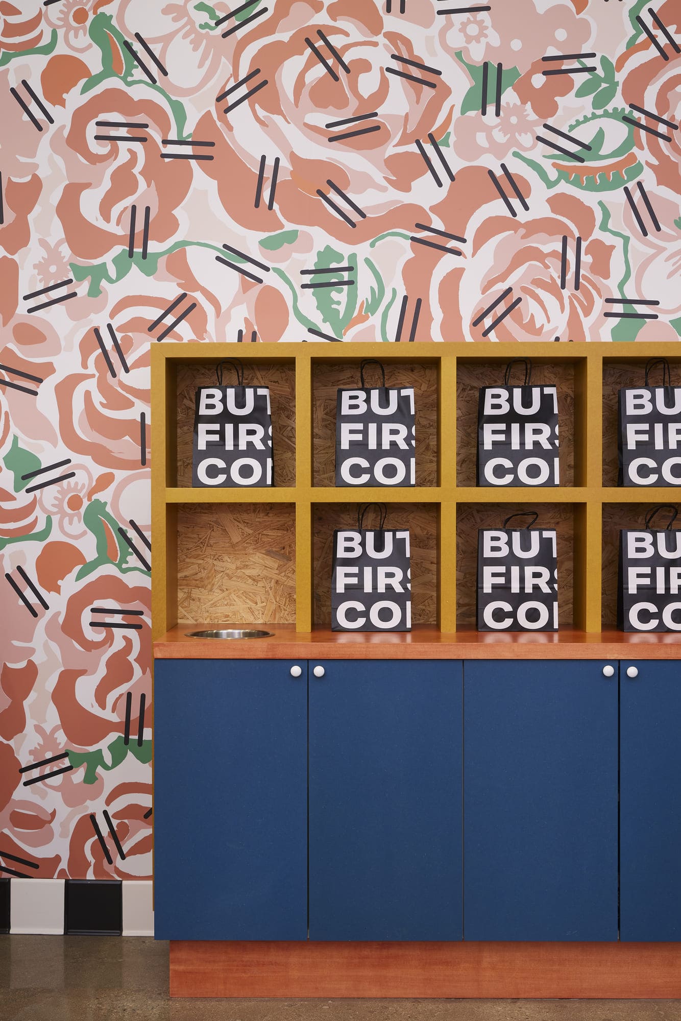 Ten unique locations in, it was time for the collaboration between Studio Sucio and Alfred Coffee to establish a design core for the growing brand. The Sherman Oaks location was built to set the design standard, with flexibility to layer on unique elements as the brand continues it’s trip out into the big wide world. The vibrant base is set with black and white striped awnings, floral wallpaper; a dream collaboration with Venturi Scott Brown who granted license for the classic Grandmother Pattern to be blown up huge, the back painted glass menu in juicy colors, with pairs of glass wall sconce lights, grids of ceramic tile, and the Alfred trademarked motto, “But First, Coffee” landing uniquely in each space. In this case, writ large. Added to the recipe is an eco system of sociable banquette seating and shelving built from non-toxic organic dyed fiberboard, raw chipboard, and chairs made in the USA from the Grand Rapids Chair Company. A slam of energetic style to suit the caffeine suppliers of Los Angeles, and soon, the world.