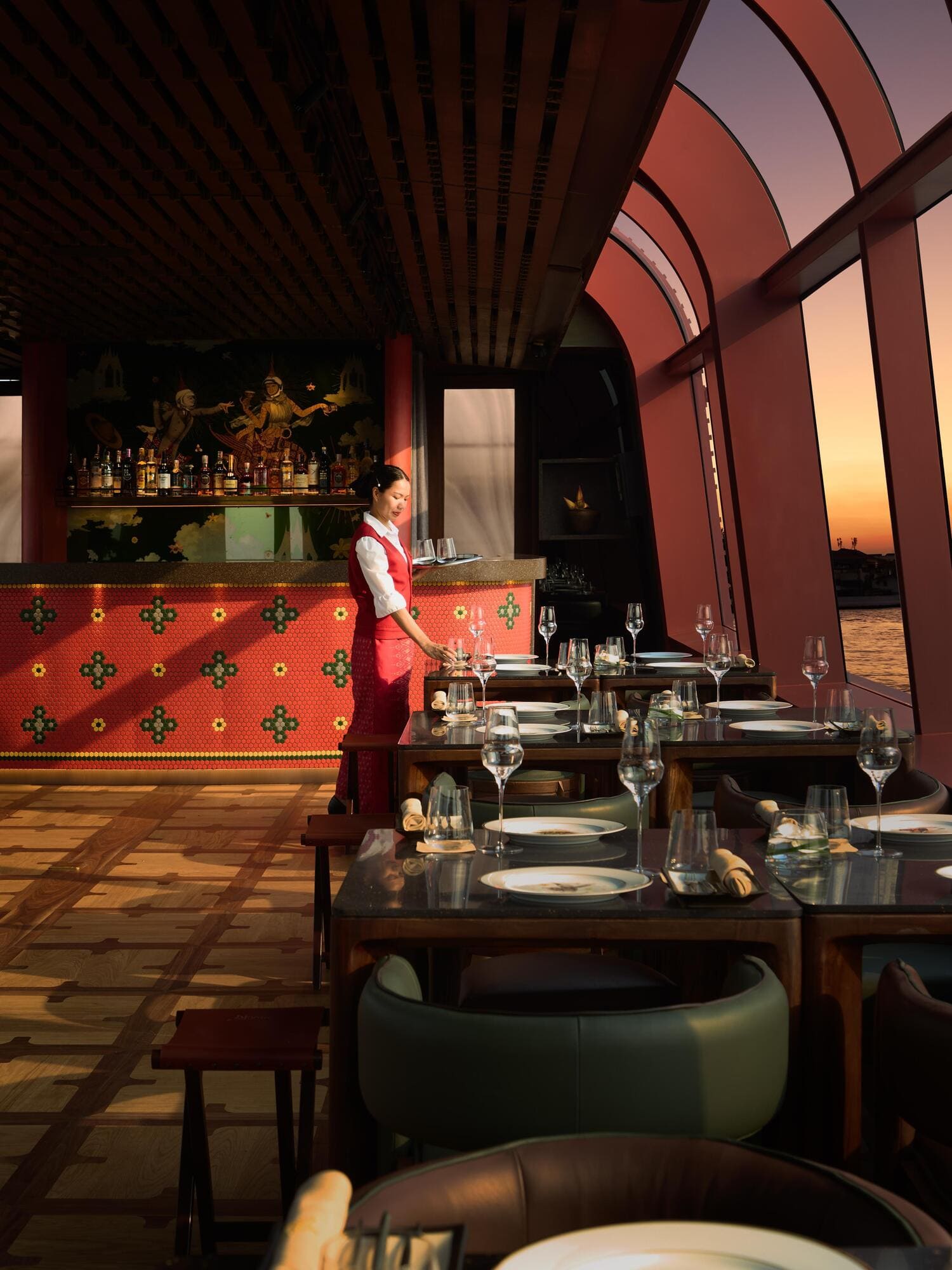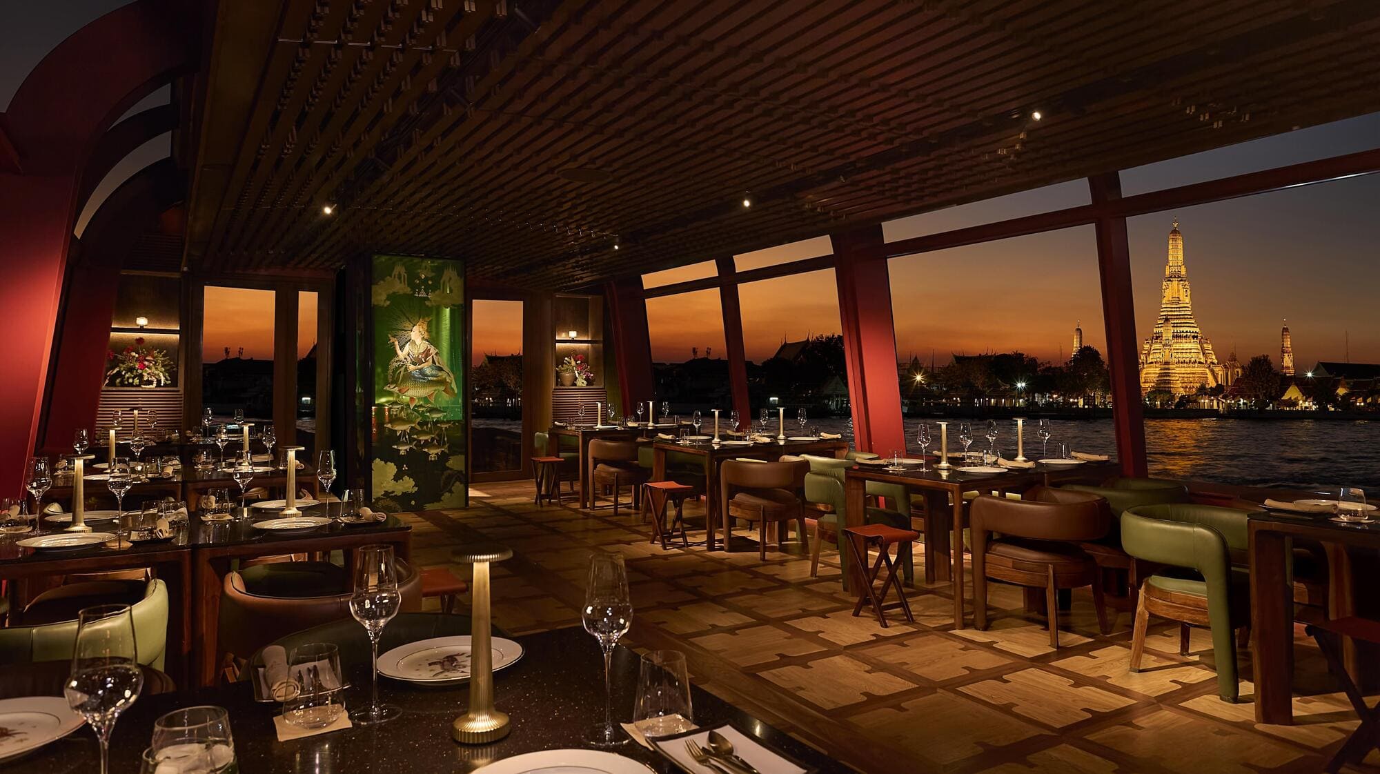 Sharing the main dining deck are a beverage bar and a wheelhouse—disguised within a decorative green-tinted glass booth—featuring glass wall murals portraying the stories of the Rice Goddess and other mythical deities associated with agricultural abundance, redefined in modern narratives by a collage illustrator Nakrob Moonmanas.