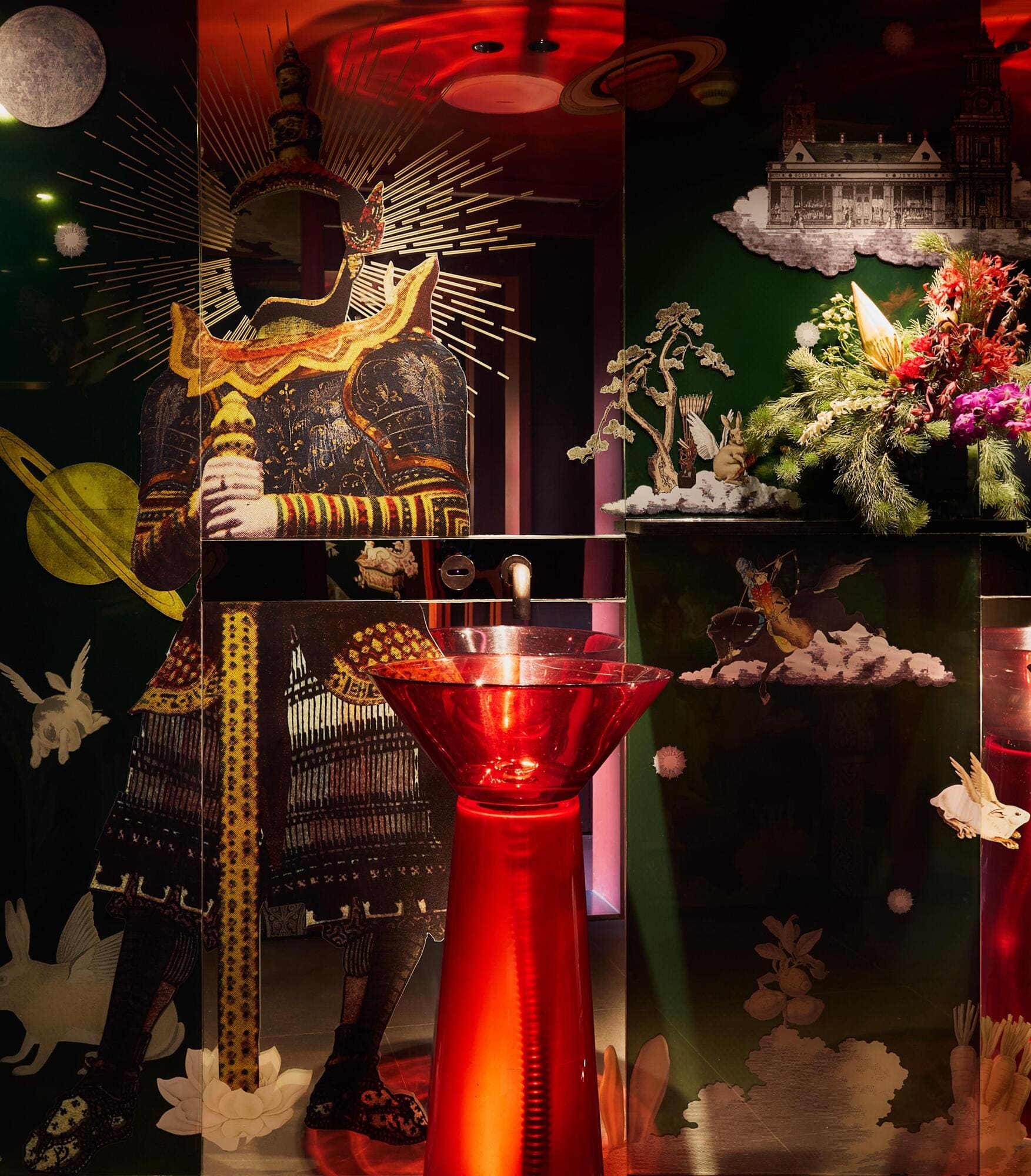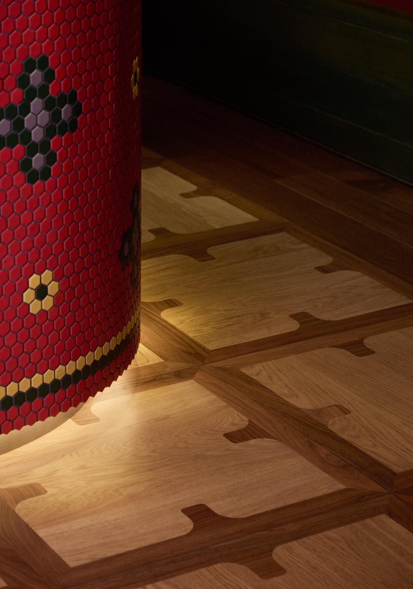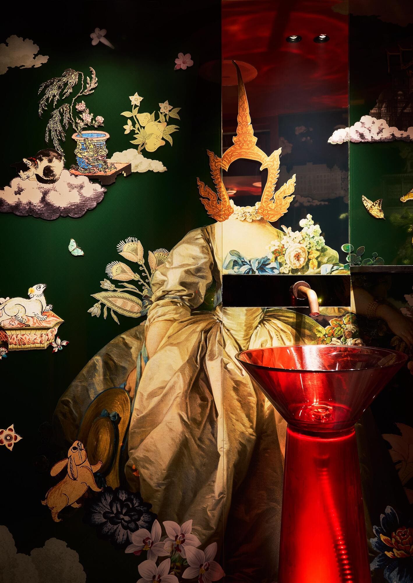 Evocative elements of Thai fine arts and architecture—such as wall murals reinterpreting Buddhist legends, auspicious Prajamyam floral motifs believed to offer protection and good fortune, and historical color palettes from glazed terracotta roof tiles on Thai temples—are reflected through fresh execution on contemporary materials, including mirror, mosaic tiles, and wooden beads.