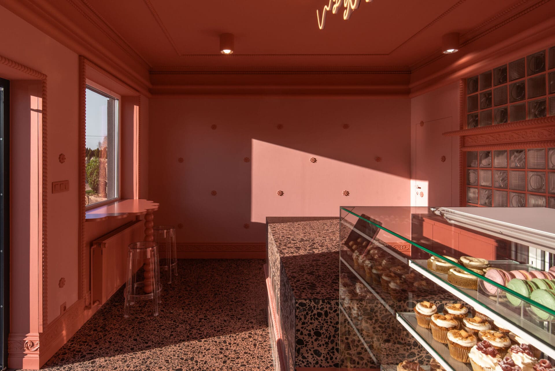 The starting point for the project was the world of sweets. The designer deconstructed a cake into its basic components, translating piped cream borders, frosting and jellies into a design language. These motifs return in the interior as the rhythm of cornices, rounded profiles and repeated details.