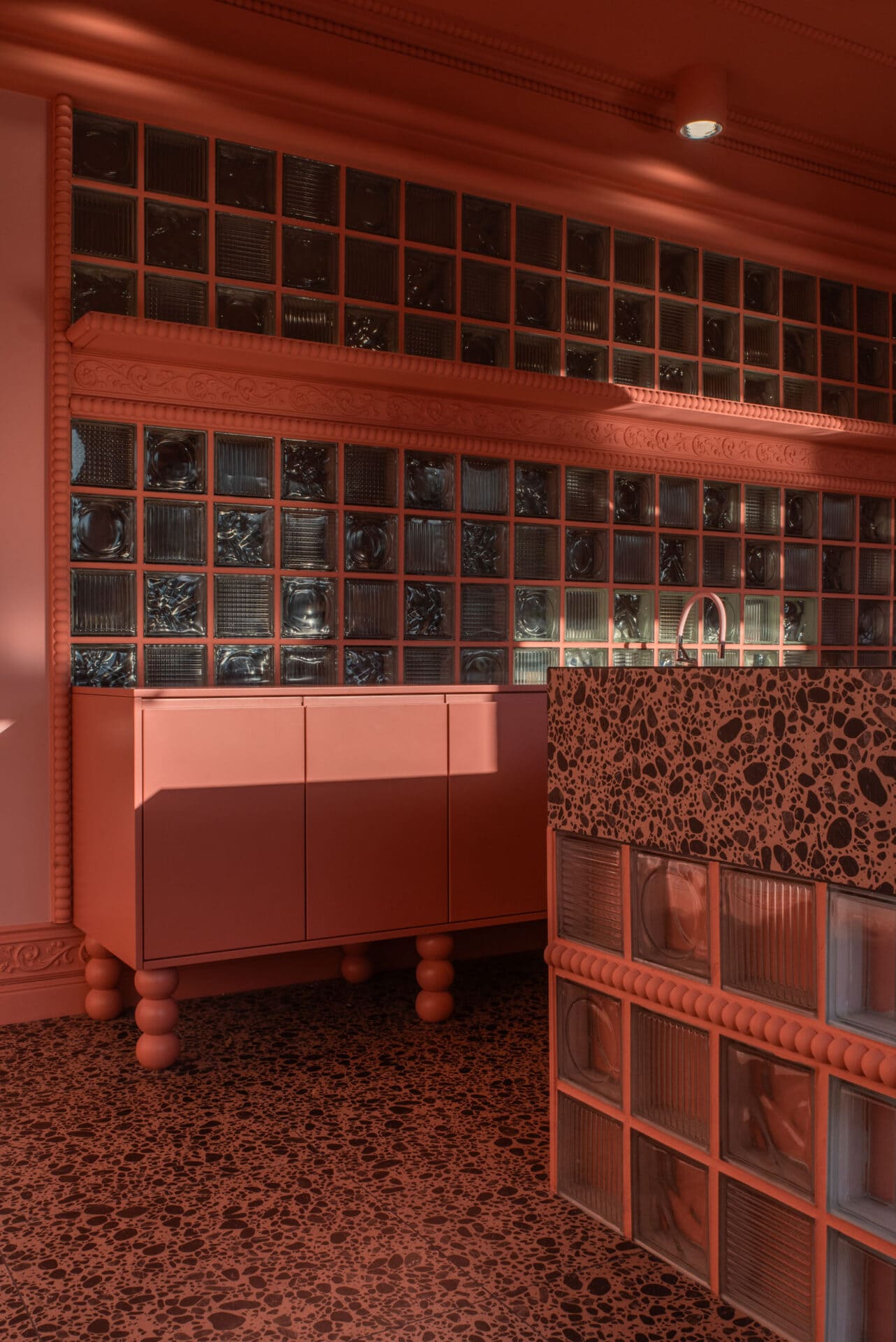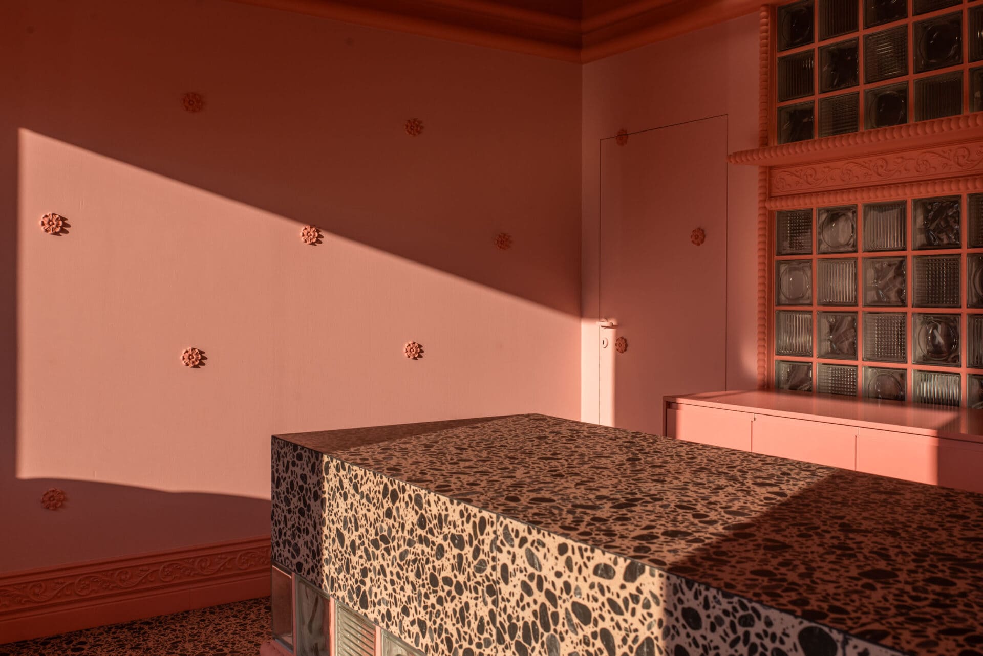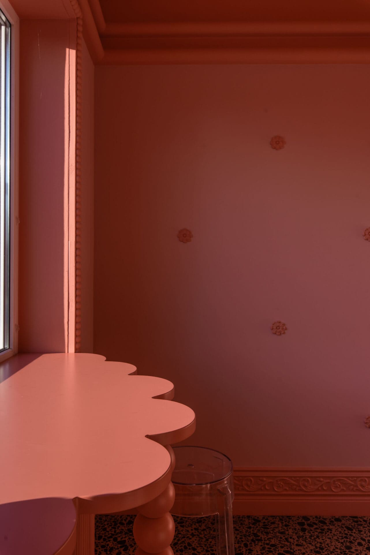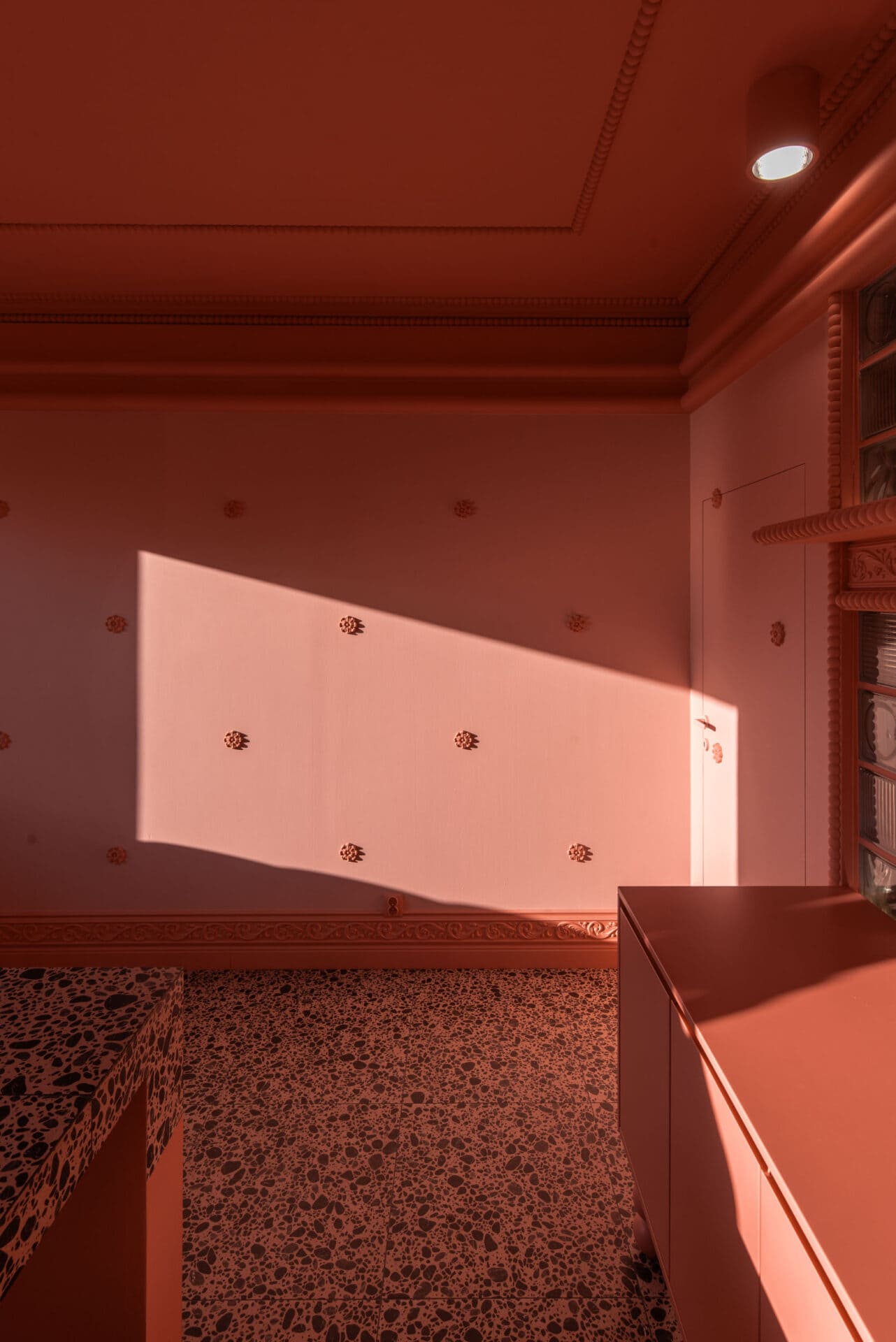 The whole space is immersed in a single warm shade of pink. This monochromatic gesture organises the interior and allows focus on textures and proportions.