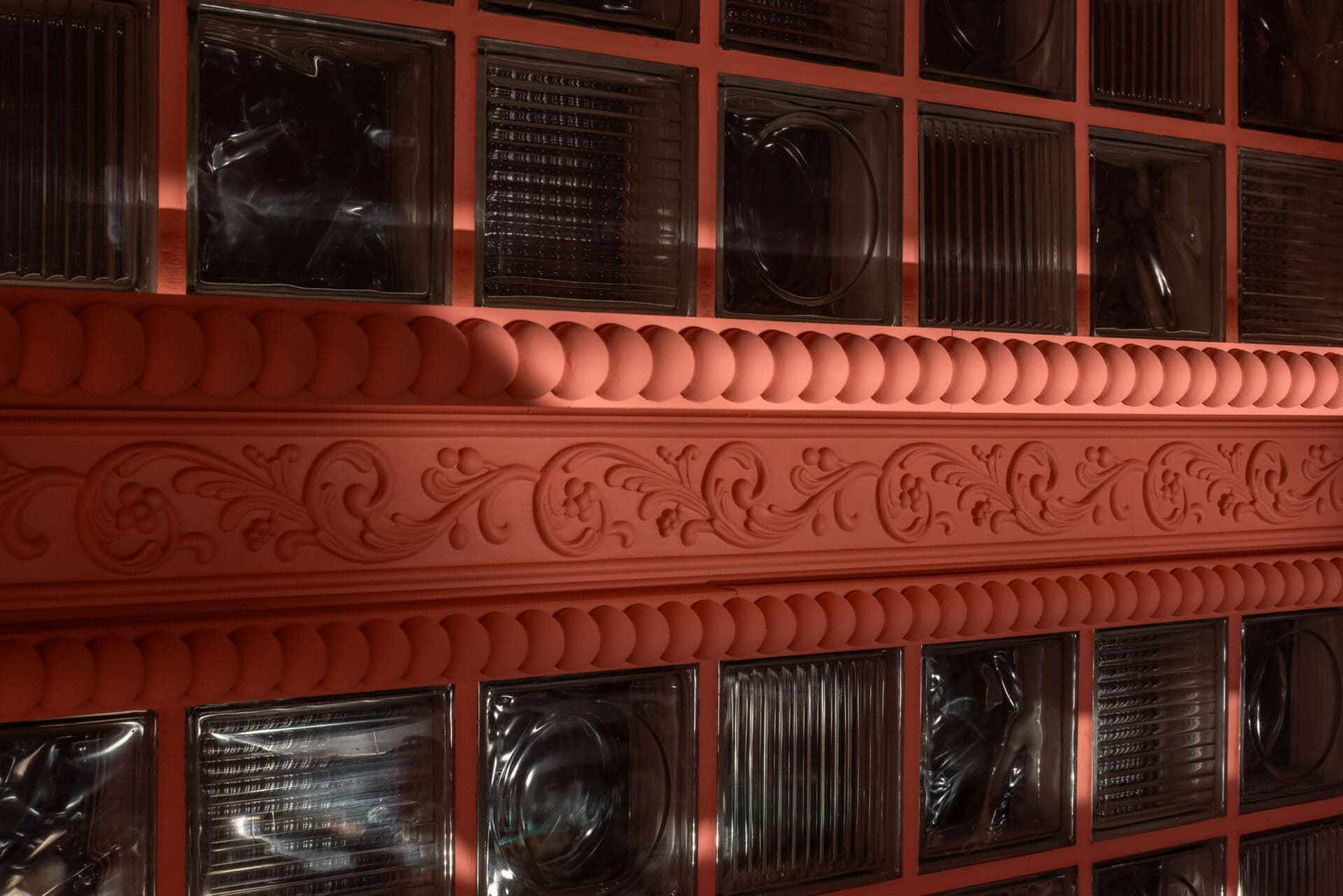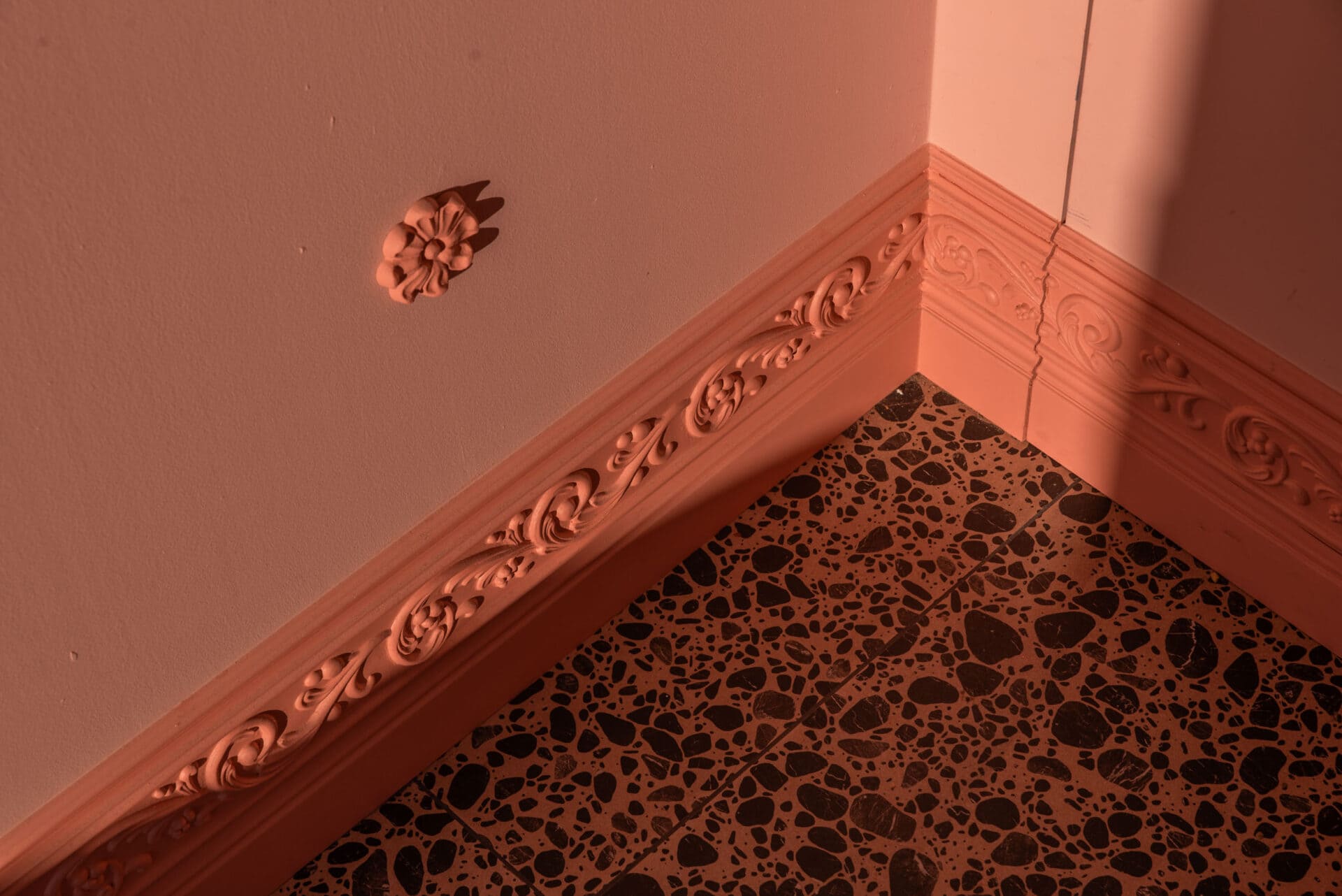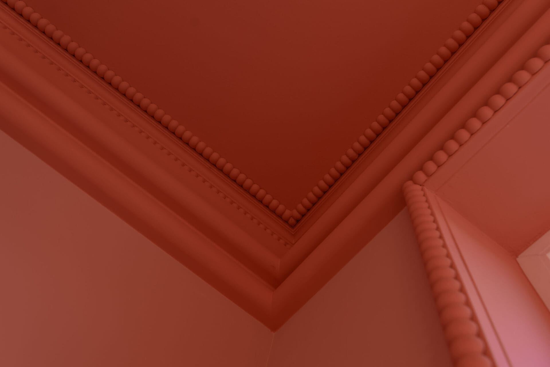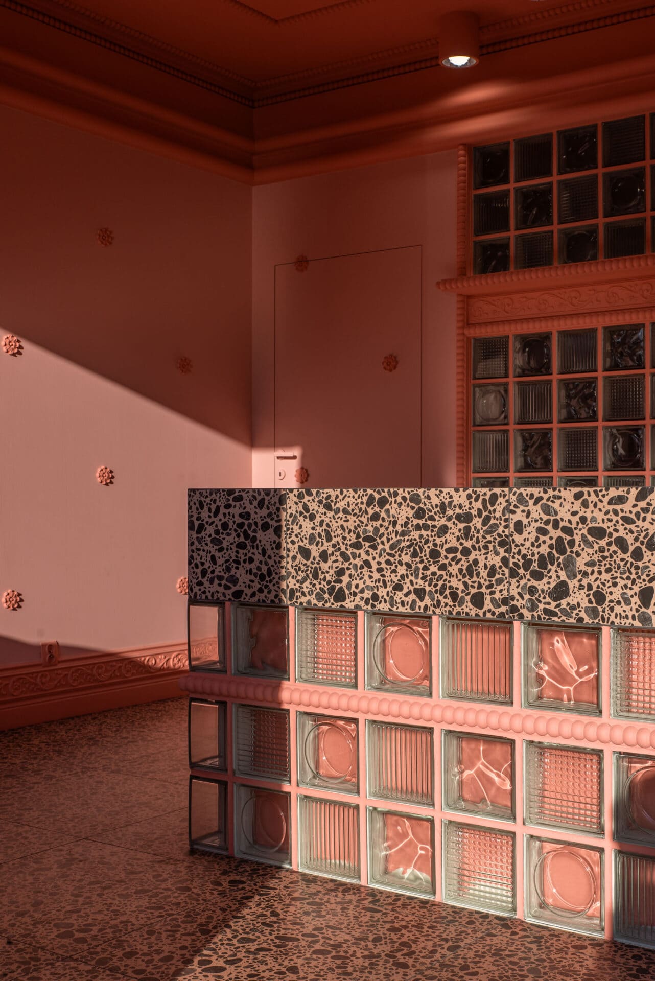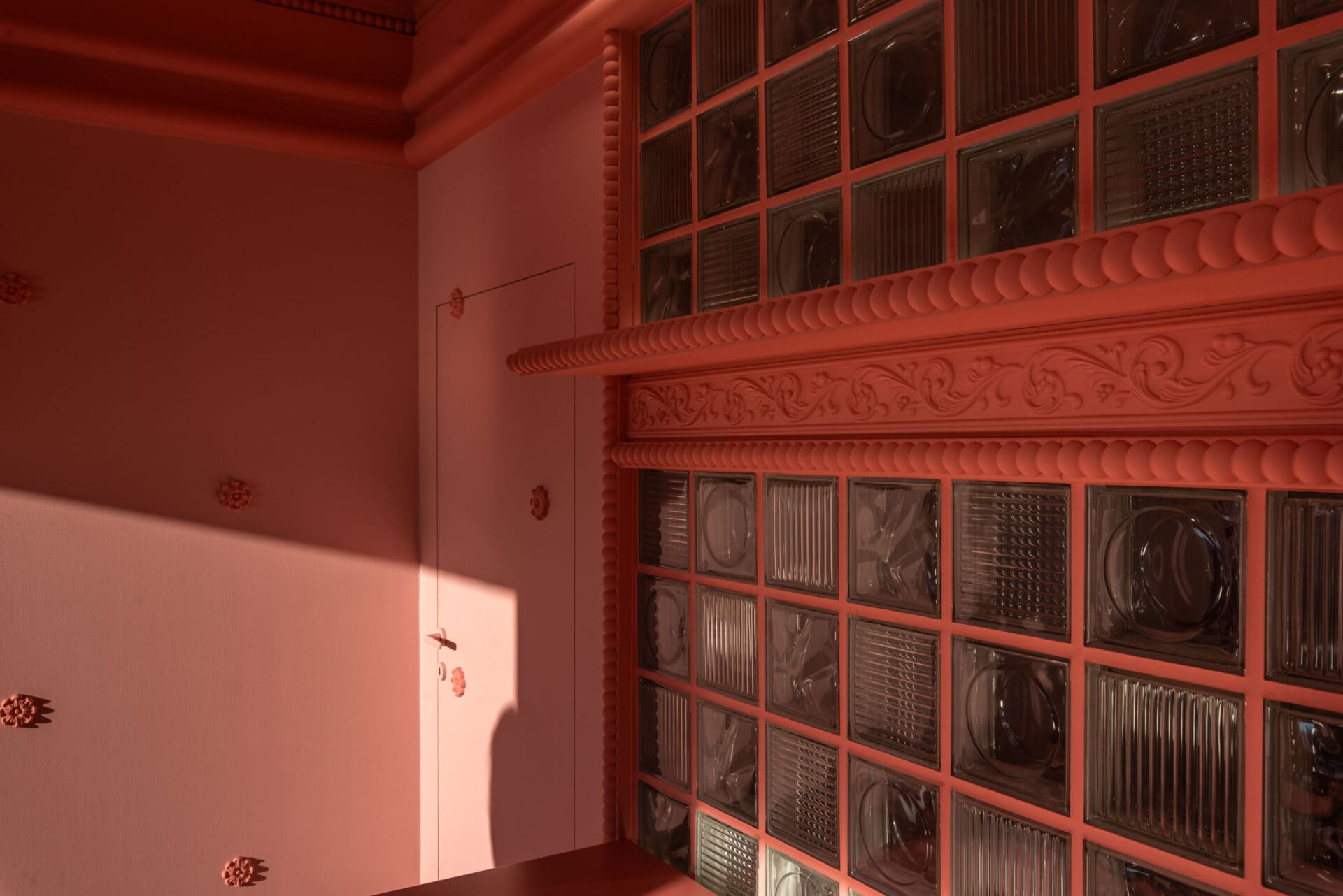 The whole space is immersed in a single warm shade of pink. This monochromatic gesture organises the interior and allows focus on textures and proportions.
