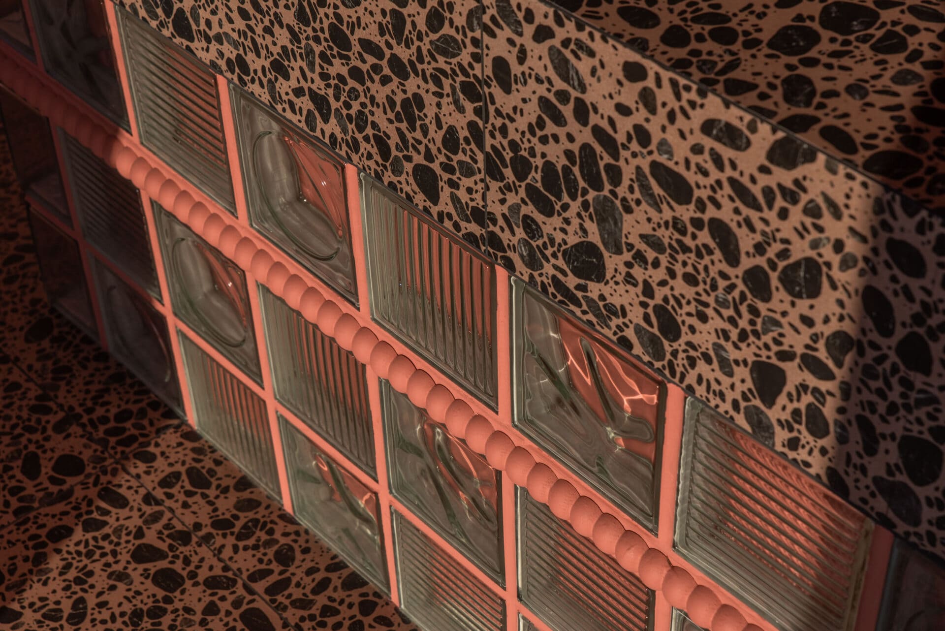 The countertop and floor are finished with tiles featuring a strong, irregular pattern reminiscent of crumbled chocolate. This graphic surface balances the colour of the walls and ceiling, adding depth to the interior while remaining a practical material, resistant to intensive use.