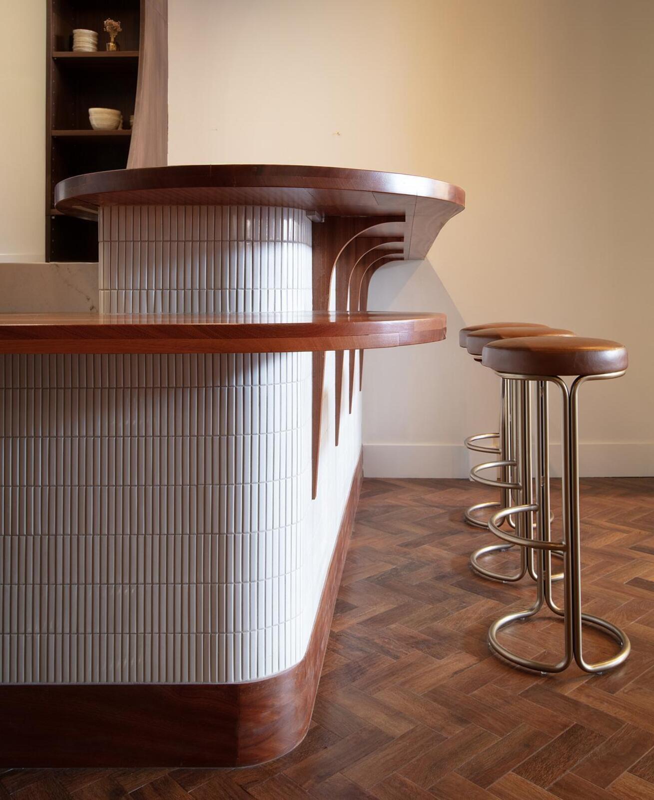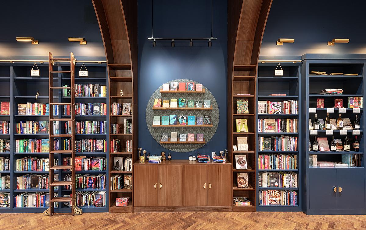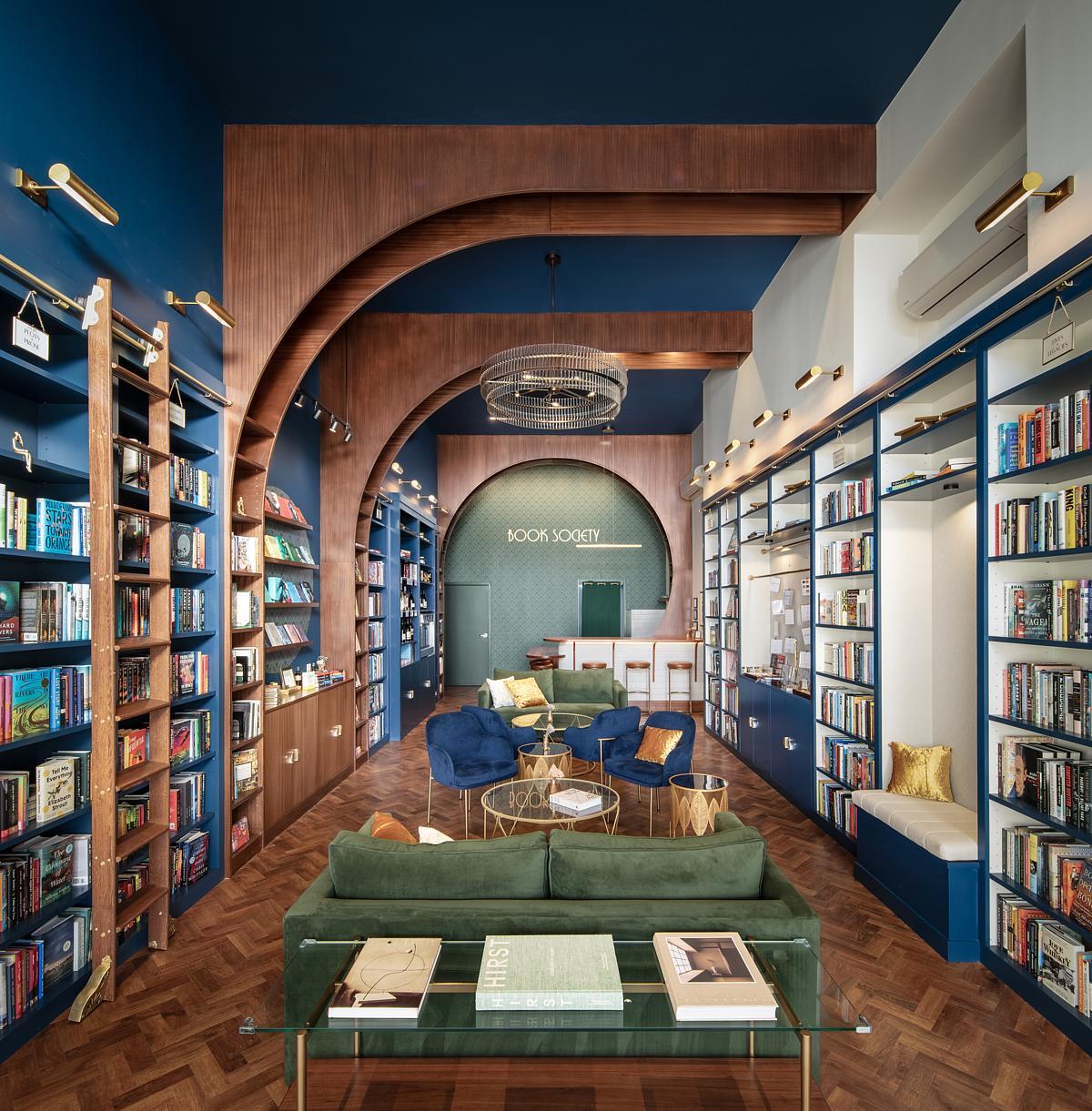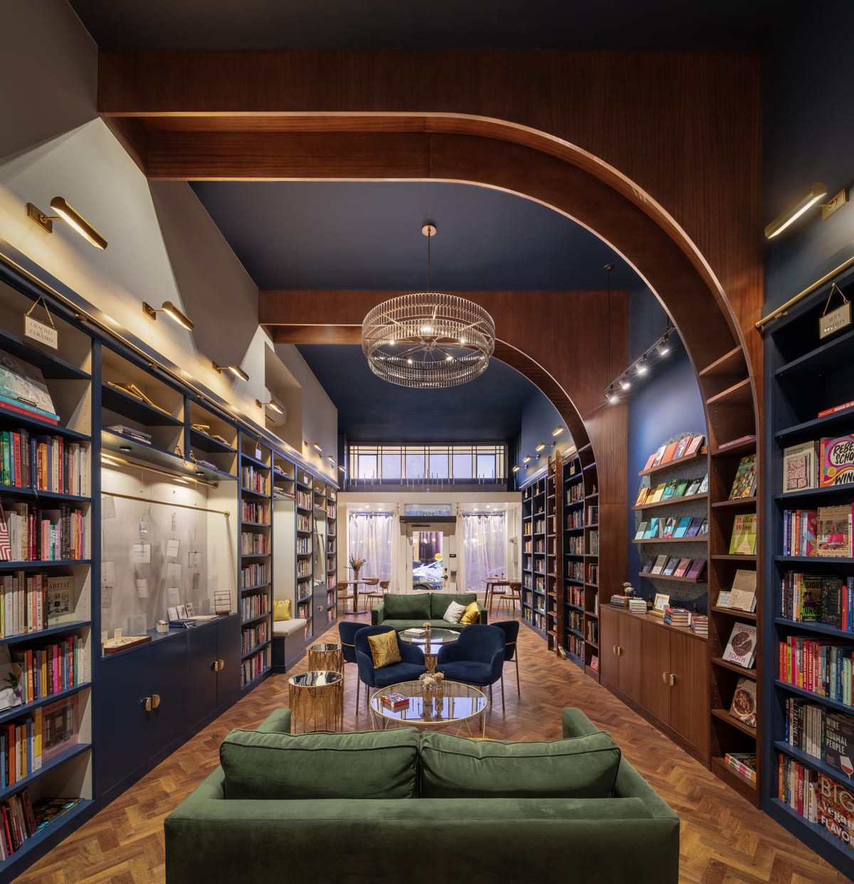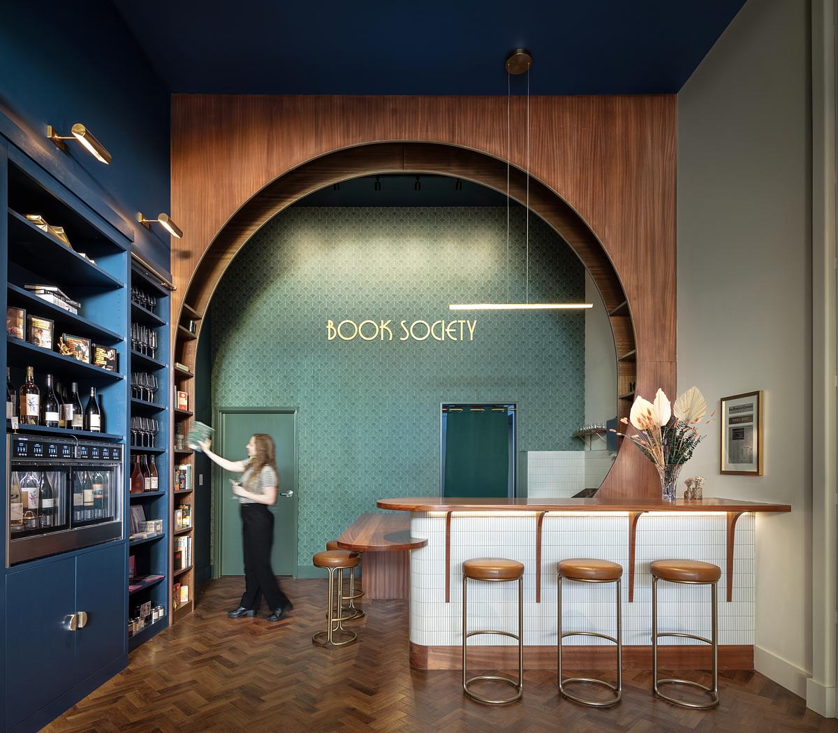 A key architectural element within Book Society is the repetition of elegant arches, which add a rhythmic and harmonious flow to the space. These arches extend outward from the bar, creating a natural visual path that subtly directs guests through different sections of the bookstore. The interplay of these curved frames enhances the sense of warmth and intimacy, reinforcing the idea of the space as a welcoming retreat. The circular form of the bar, complemented by the framed archways, evokes the feeling of a hearth—a central gathering place where people come together to share stories, ideas, and experiences.