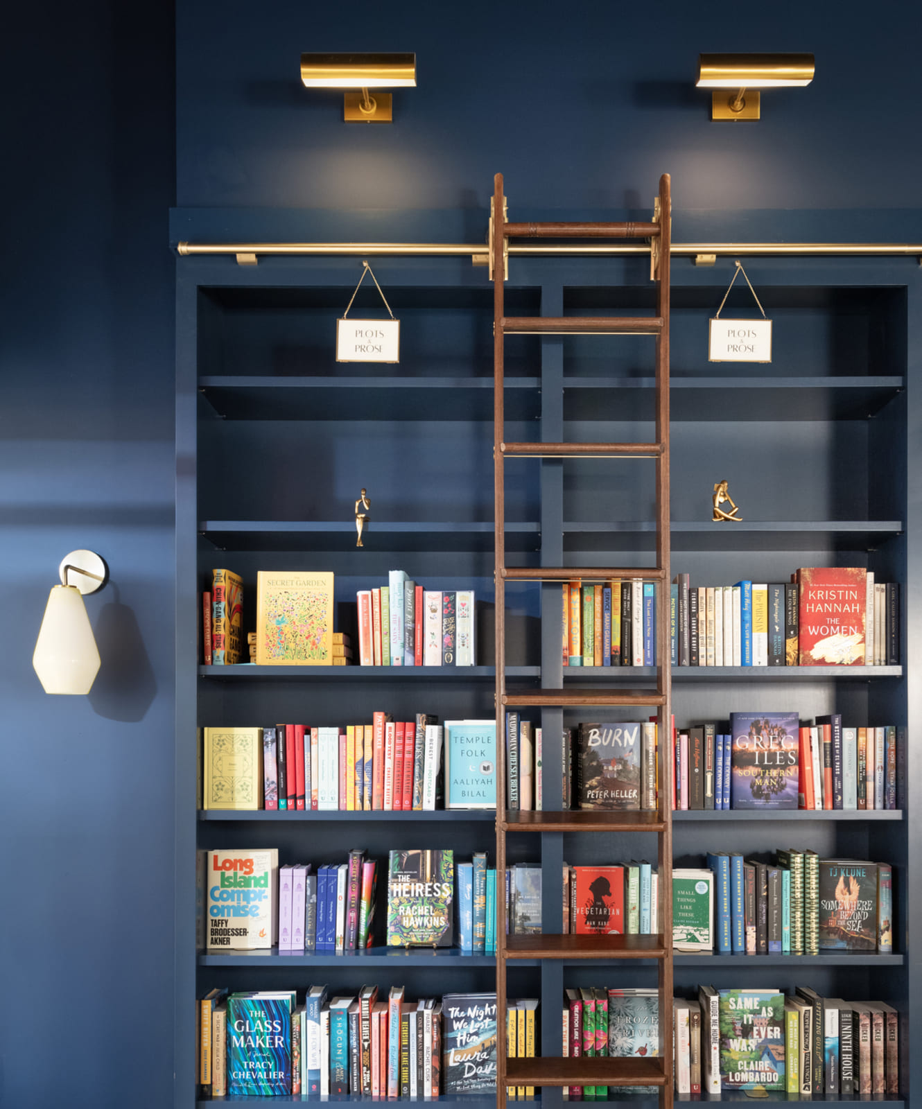 Taking cues from the mystery and allure of a speakeasy, the entrance of Book Society is designed to intrigue and invite curiosity. Windows at the storefront offer passersby a glimpse of the cozy world inside, enticing them to step in and explore. Inside, small framed vignettes nestled among the bookshelves create points of interest, subtly encouraging movement through the space. At the heart of it all, the bar stands as a focal point, framed by a dramatic circular cutout that immediately draws the eye from the entrance. This tunnel-like perspective guides visitors deeper into the space, creating a sense of journey and discovery.