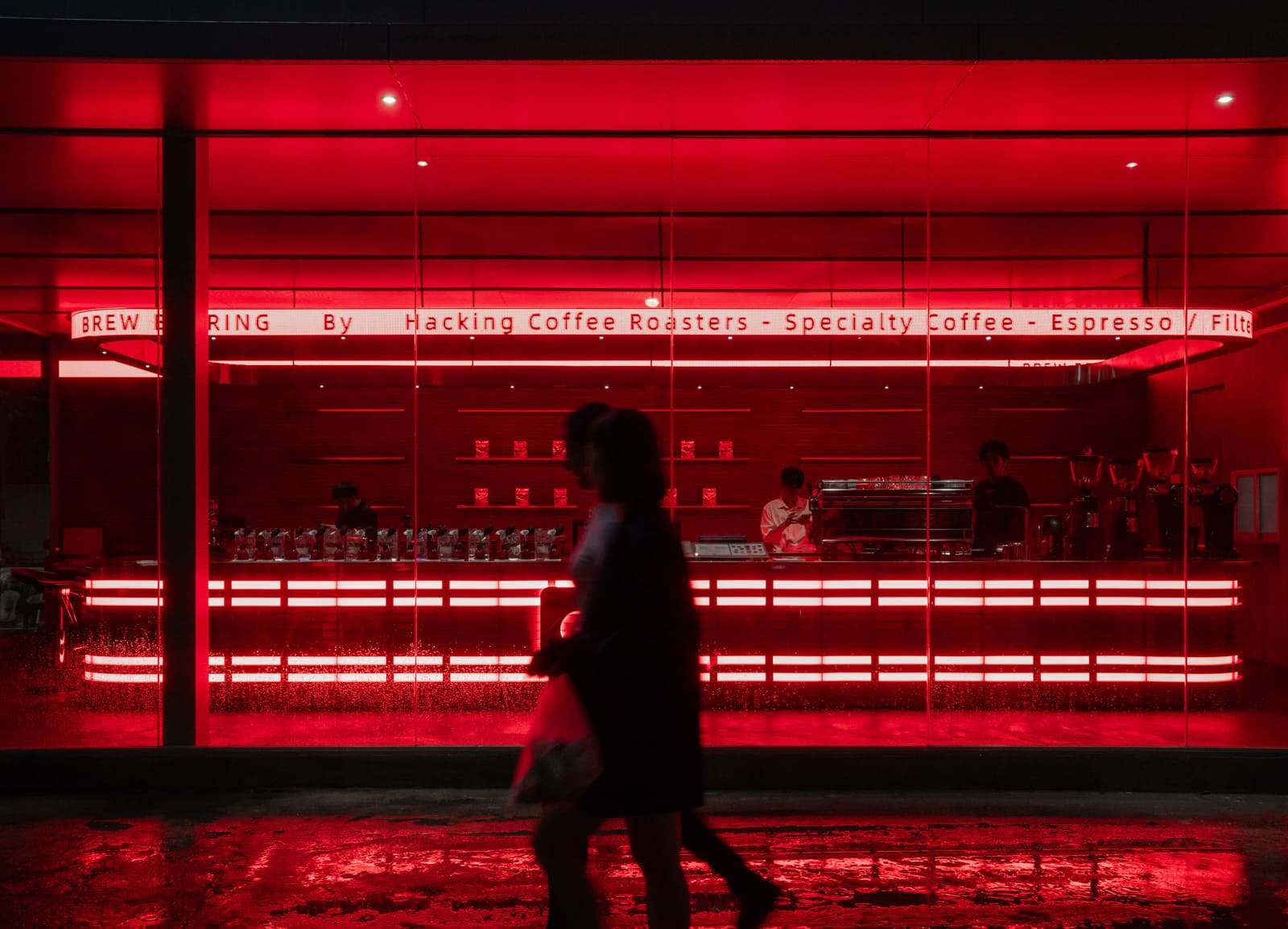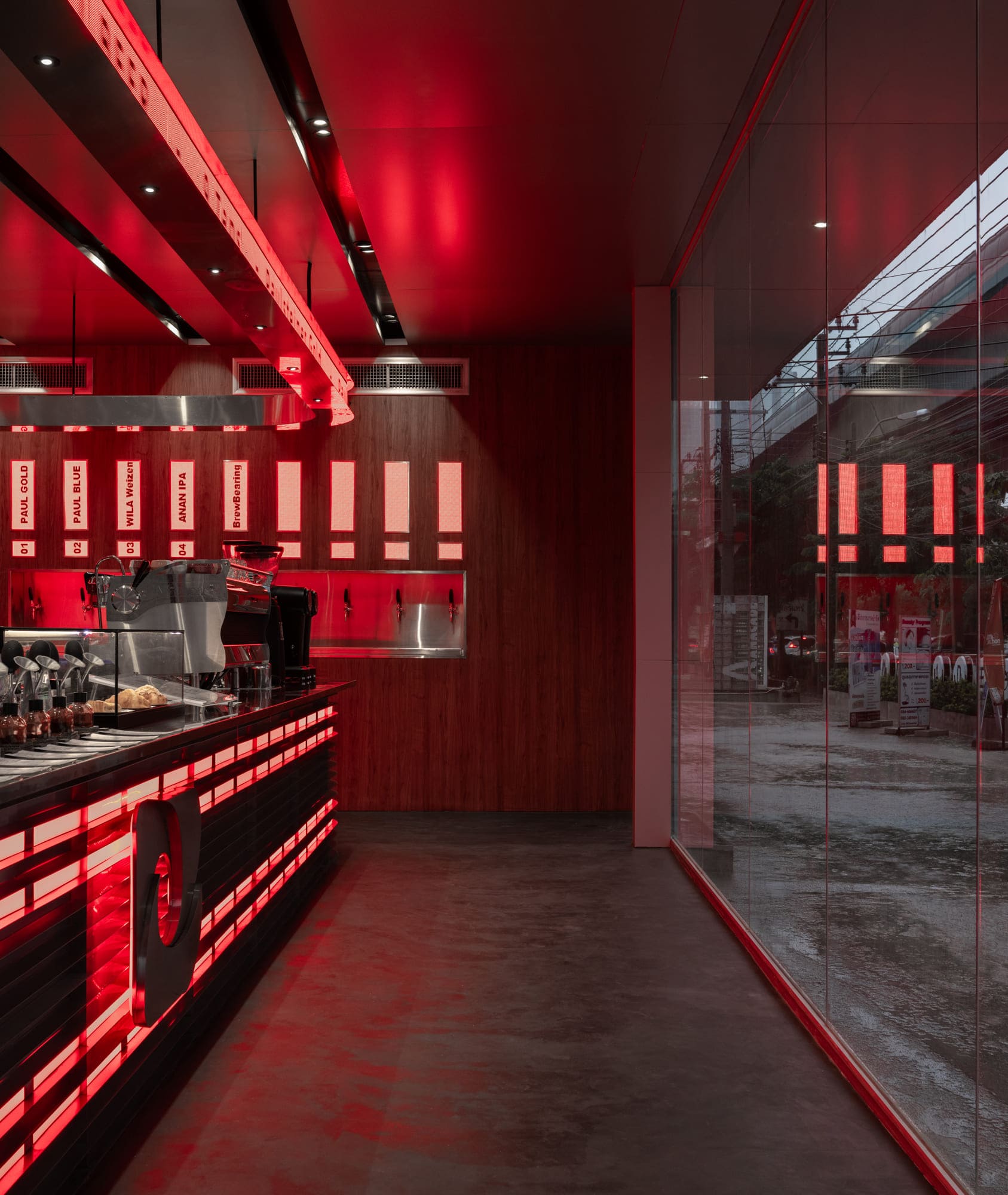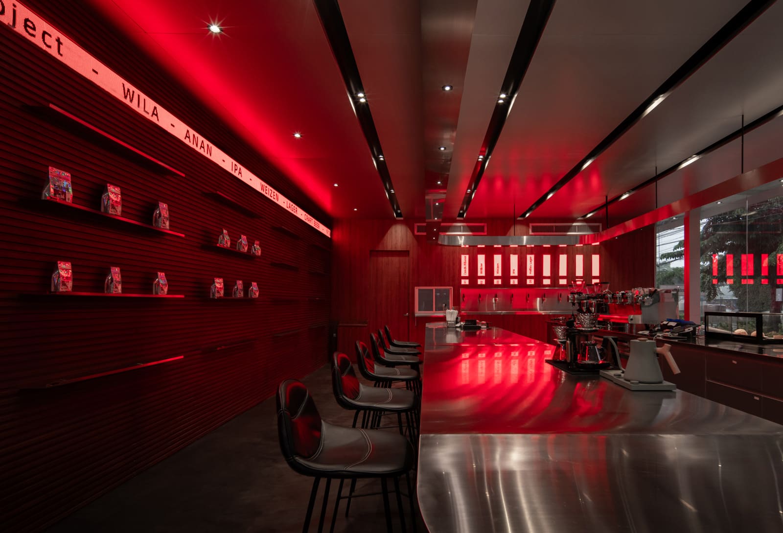 The stainless steel center counter also performed as a futuristic digital clock where the red bars of light runs from empty to full according to the time of the day. Creating different atmosphere between day and night. Seems like a futuristic machine/instrument that synchronize with the beat of the neighborhood. The materials of the exterior and interior space are inspired by the concept of Japanese cyberpunk but being more settle like Bauhaus Retro futuristic sound system where wood stainless and technology combine seamlessly.