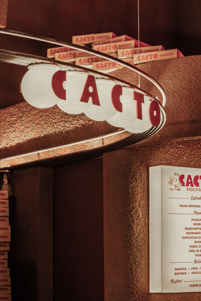 From experimentation and the search to achieve curvatures from bricks, a large leading piece was manufactured that expands its diameter as it grows in height. Through the gaps in the brick’s texture, a lighting game simulates the fire of the oven where the pizzas are made. The original premises had a vaulted ceiling that was restored and enhanced. For the sidewalk, brick tiles were used to generate continuity between the horizontal and vertical planes of the facade.