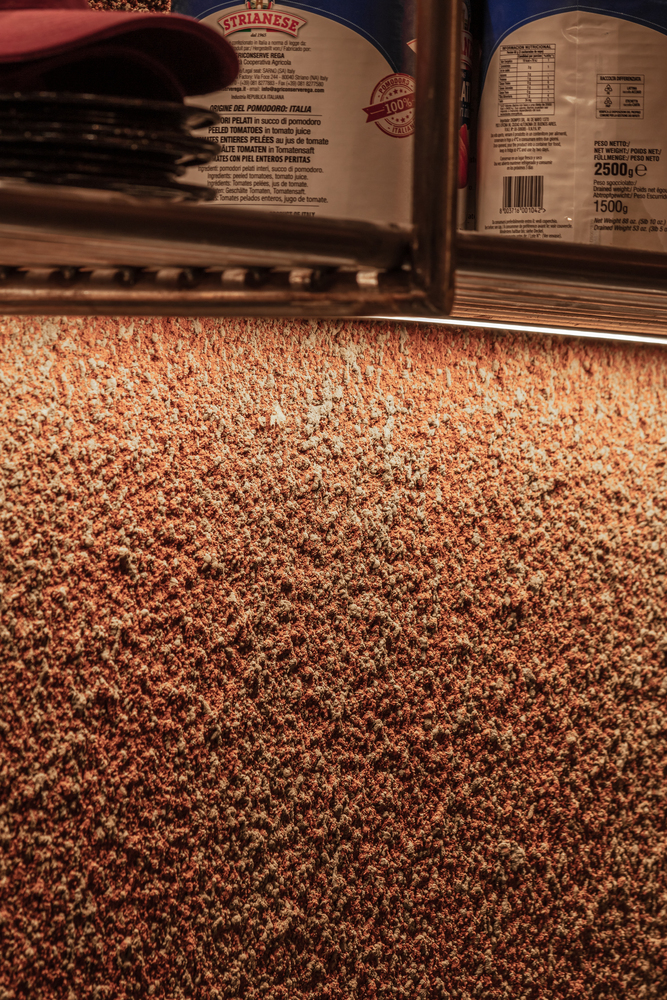 To achieve continuity between the floor and the front of the bar, a hydrowashed cement and stone-based material manufactured on site was used, which allowed the generation of a curve between planes.