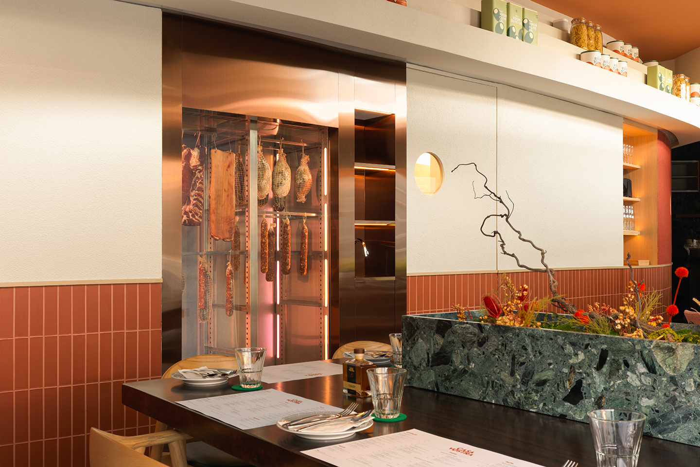 Casa Vostra is a casual pizza restaurant that is all about the joy of dining together. Situated in a curvilinear shop unit on the ground floor of Raffles City, n open pizza kitchen greets the visitor as they enter the space with lines designed to draw the eye all the way in. A communal table segments the dining area into two sections with a drinks and dessert bar capping the other end of the journey. Daylight floods into the space through the windows along the facade, animating the palette of natural materials and vibrant colours and textures, that echo the ingredient-focused approach of the restaurant’s menu.