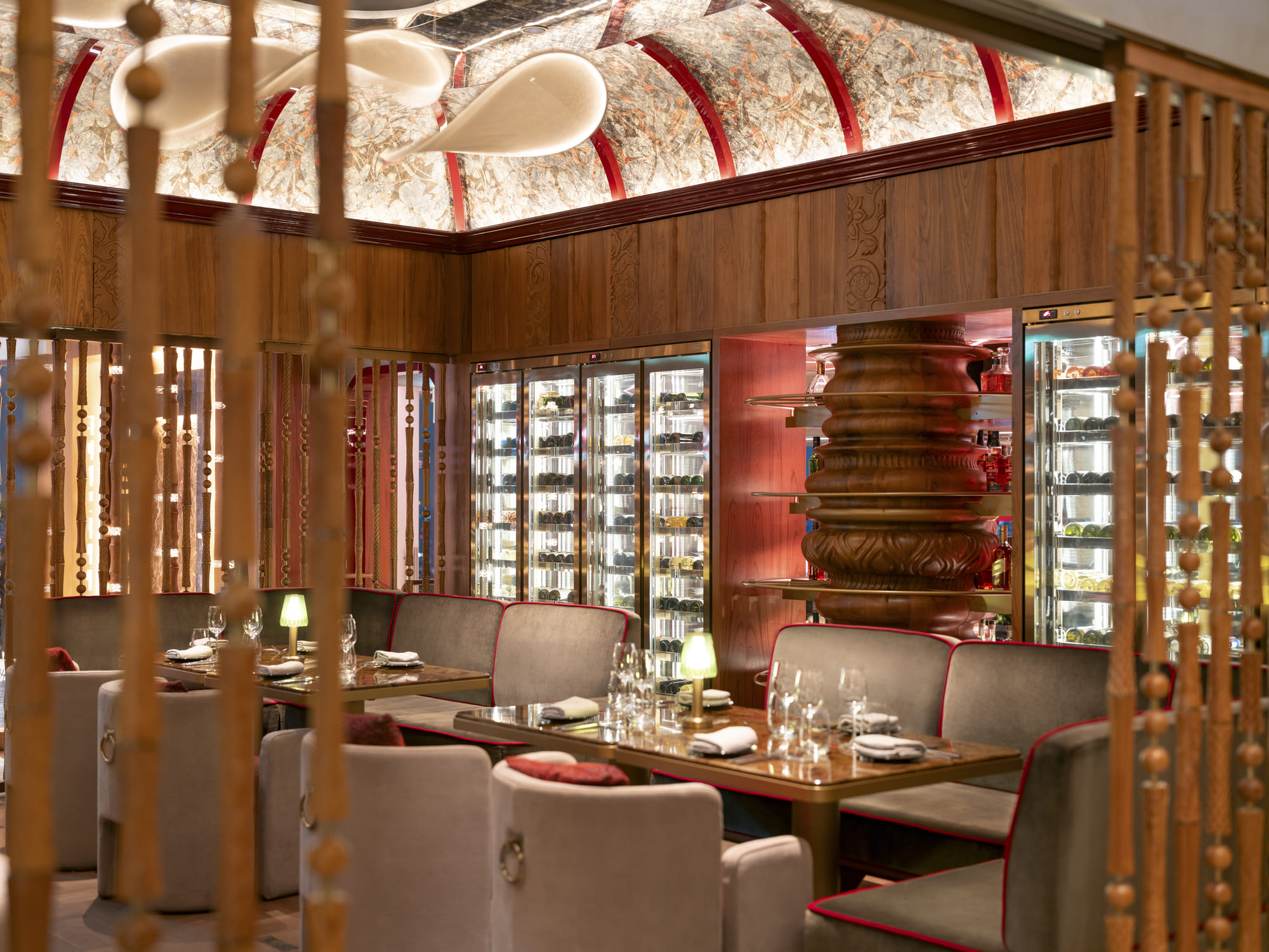 The room first captivates with an expansive ceiling adorned in botanical wallpaper and accented with brass detailing, soft, plush seating wrapped around warm marble-accented tables adds an inviting touch, while on the left, an elaborate built-in wine cellar glows, spotlighting a collection of top-shelf serves. On the right, design takes an eclectic turn: wooden panels are intricately carved with Southeast Asian motifs and playfully interrupted by bold, vibrant wallpaper cut-outs assembled like elegant, abstract mosaics. Anchoring the space opposite is one half of the sizable carved wooden pillar, grounding the space with Southeast Asian heritage.