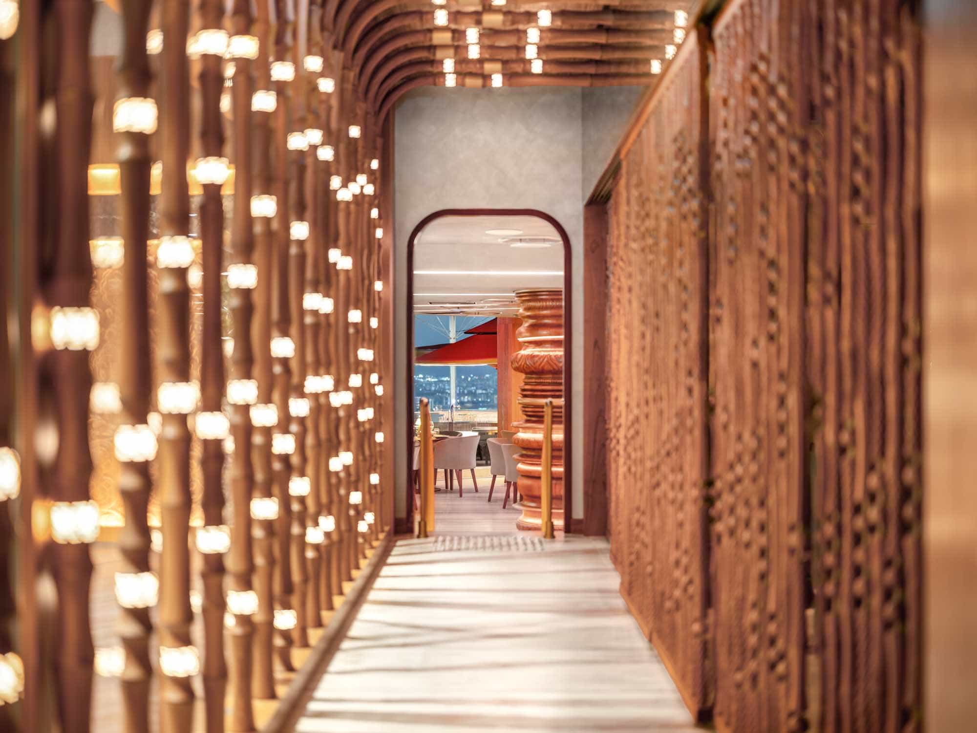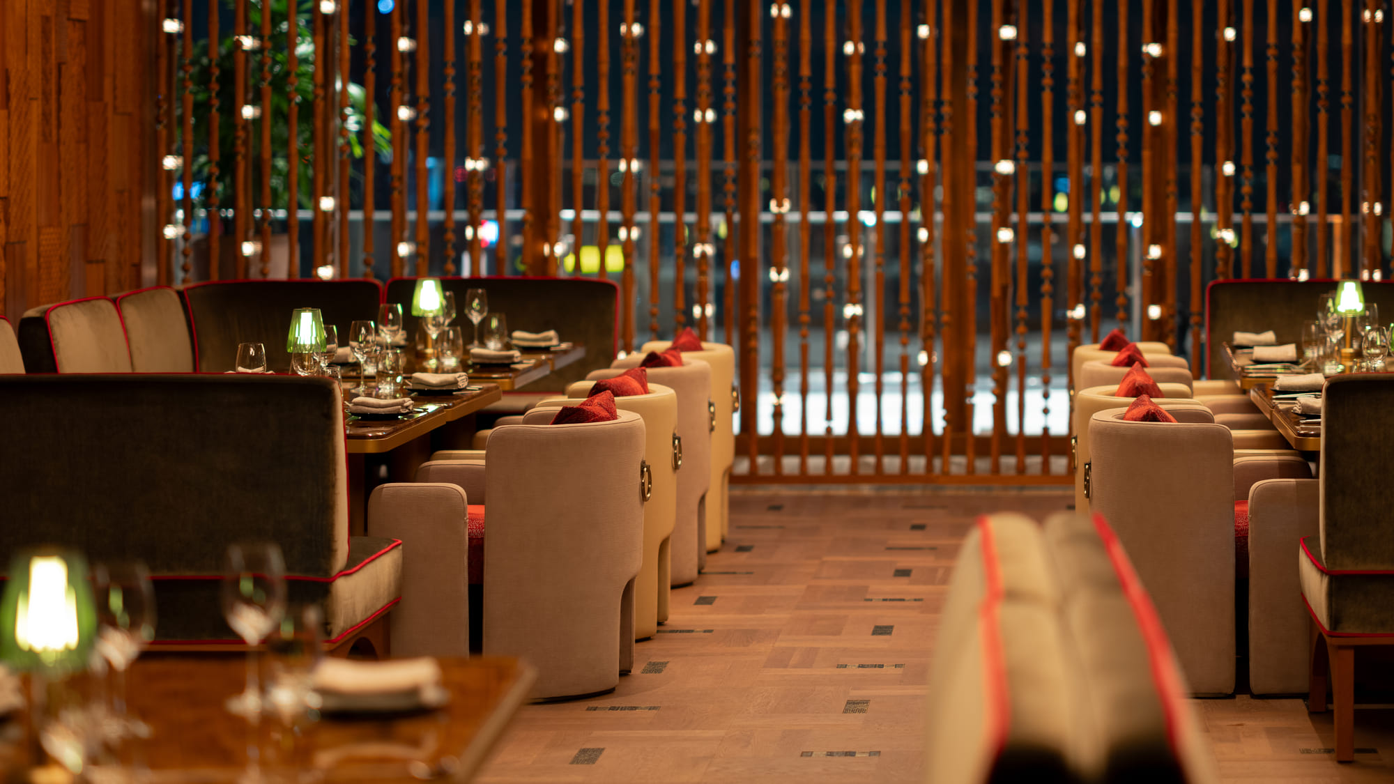 The main dining room invites guests into a theatrical interplay where style meets edge. A mirror-stretched ceiling brightens the space, reflecting the rhythm of the city skyline by day and enhancing state-of-the-art lighting by night; a feature that’s ingeniously integrated into wooden panel slivers. This immersive lighting casts a dynamic and luminous display that seamlessly energizes the ambience as sunset becomes dusk. Burgundy-stained wood and rich textures guide guests through the warmth of the space, accented by bamboo pillars that subtly honor Southeast Asian craft.