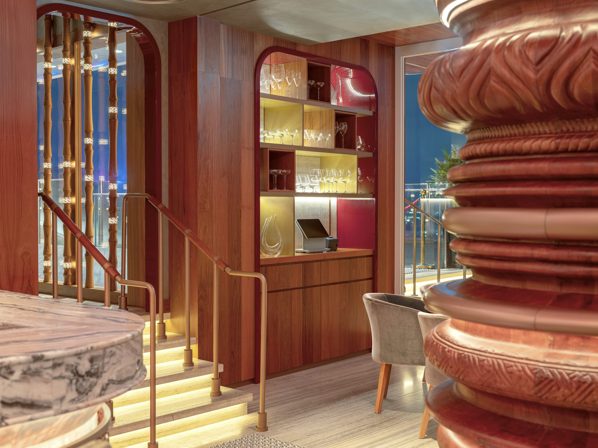 The onyx stone bar stands proud – a vibrant centerpiece where cocktails and conversations converge; framed by a dramatic sculptural wooden column backdrop, and softly lit panels showcasing a selection of premium spirits. Wooden engravings are inspired from Singaporean cultural patterns.