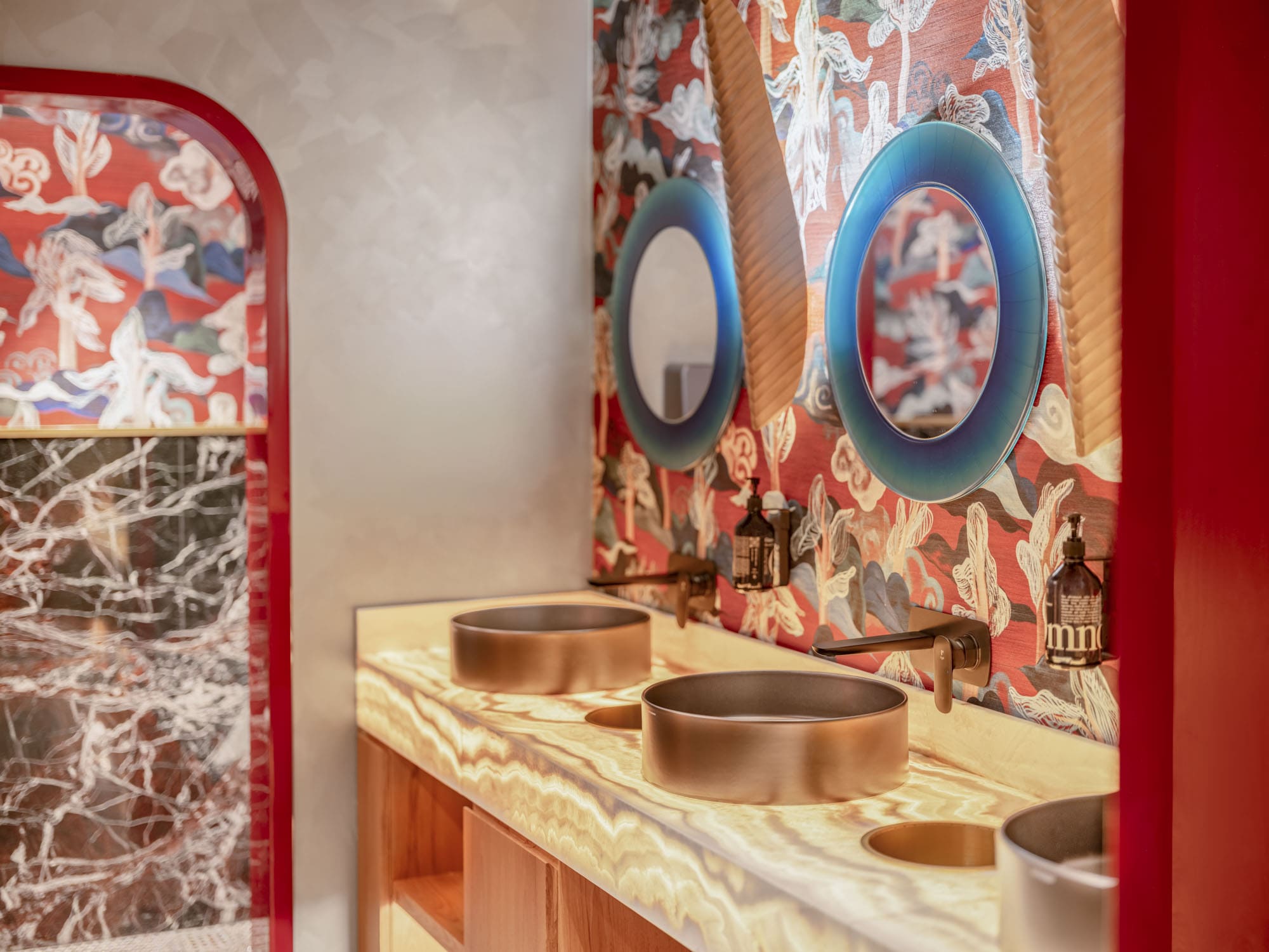 The washroom design aesthetics are line with the brand DNA while introducing some eye-catching design elements such as the teal blue mirrors and surrounding wallcoverings.