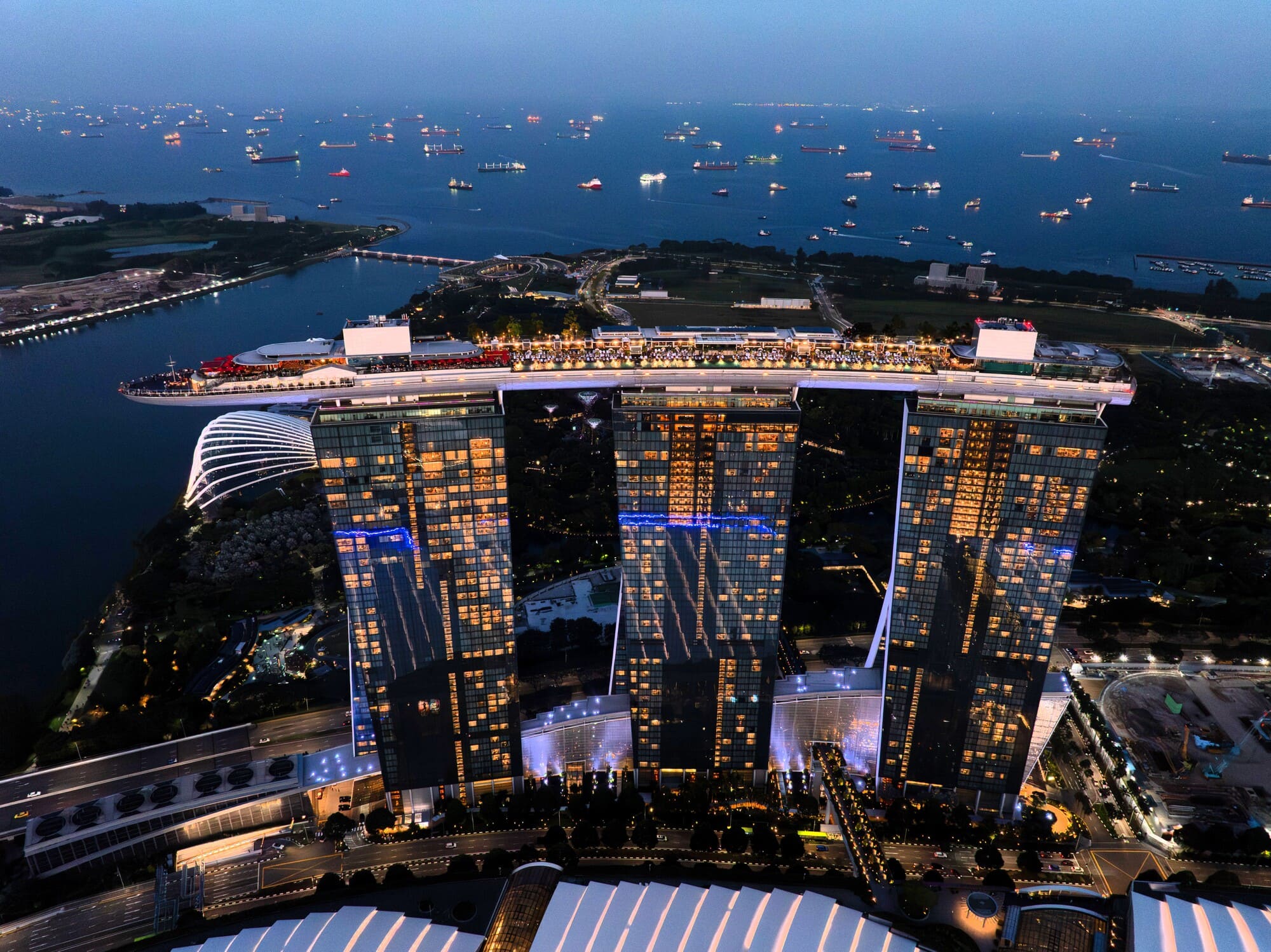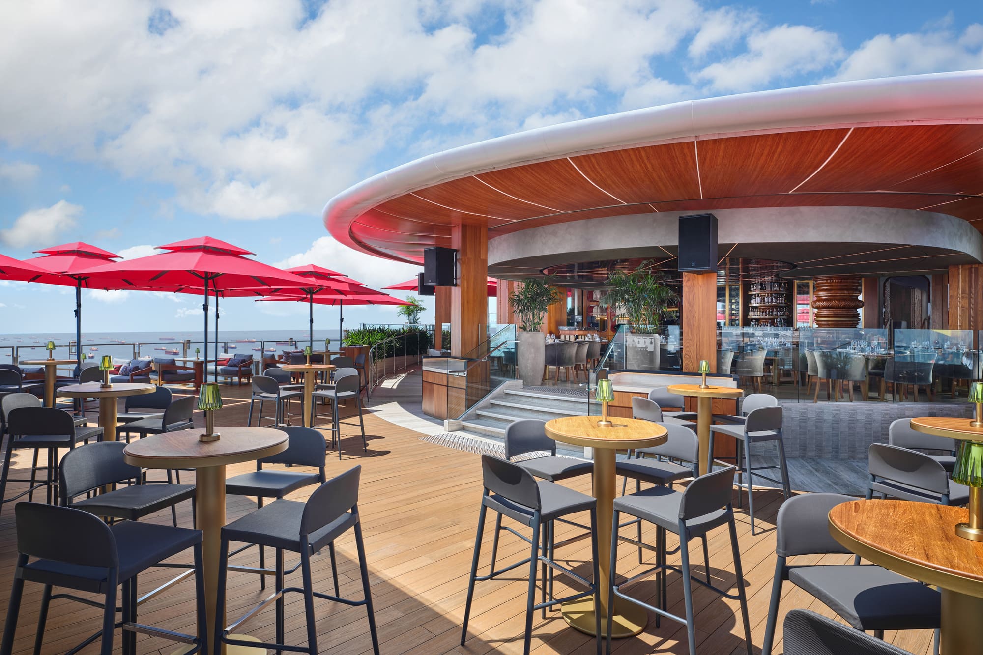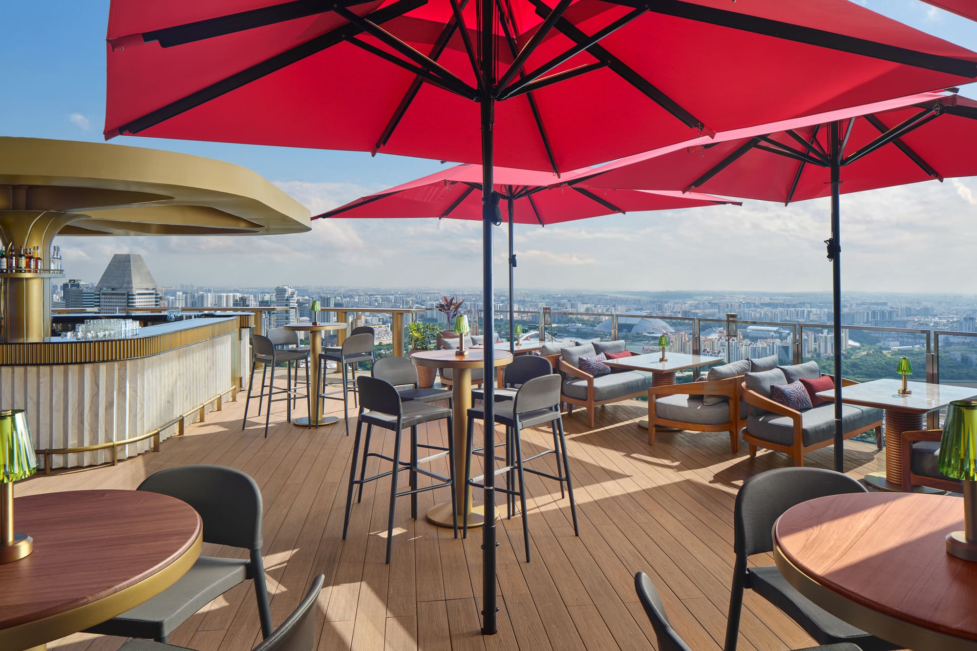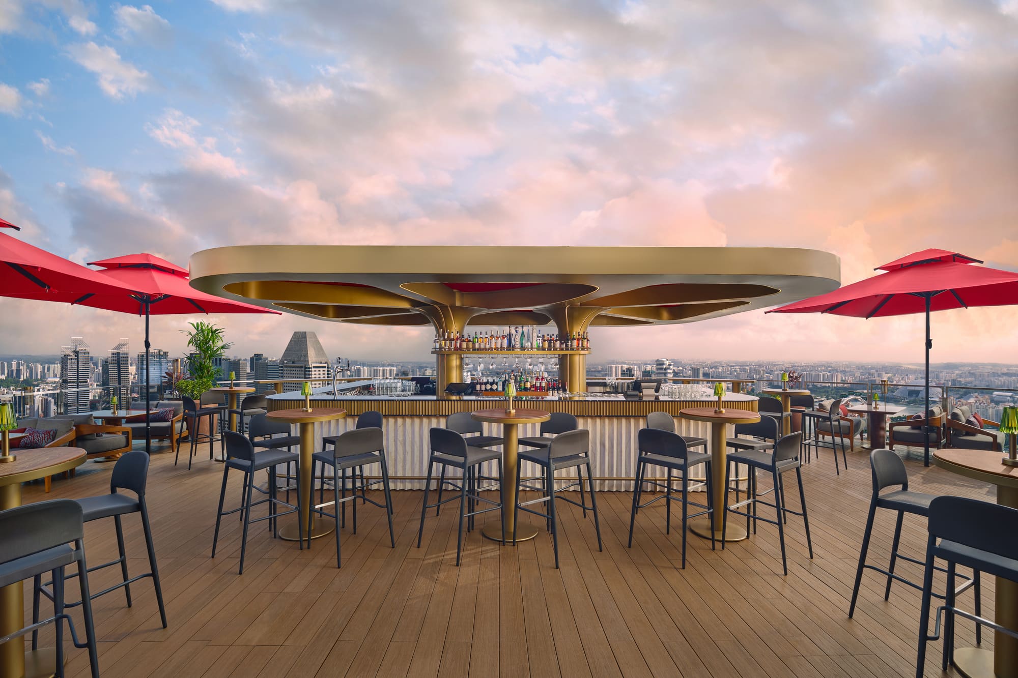 Outdoors, the rooftop terrace and Ocean View seats stretch gracefully along Marina Bay Sands balustrade, now reimagined with soft ambient lighting, textured flooring and uninterrupted sea views. A key design feature is the central bar and its bespoke canopy with the shape of the national flower in Singapore the Vanda Miss Joaquim (pronounced Joe-ah-Kim).
