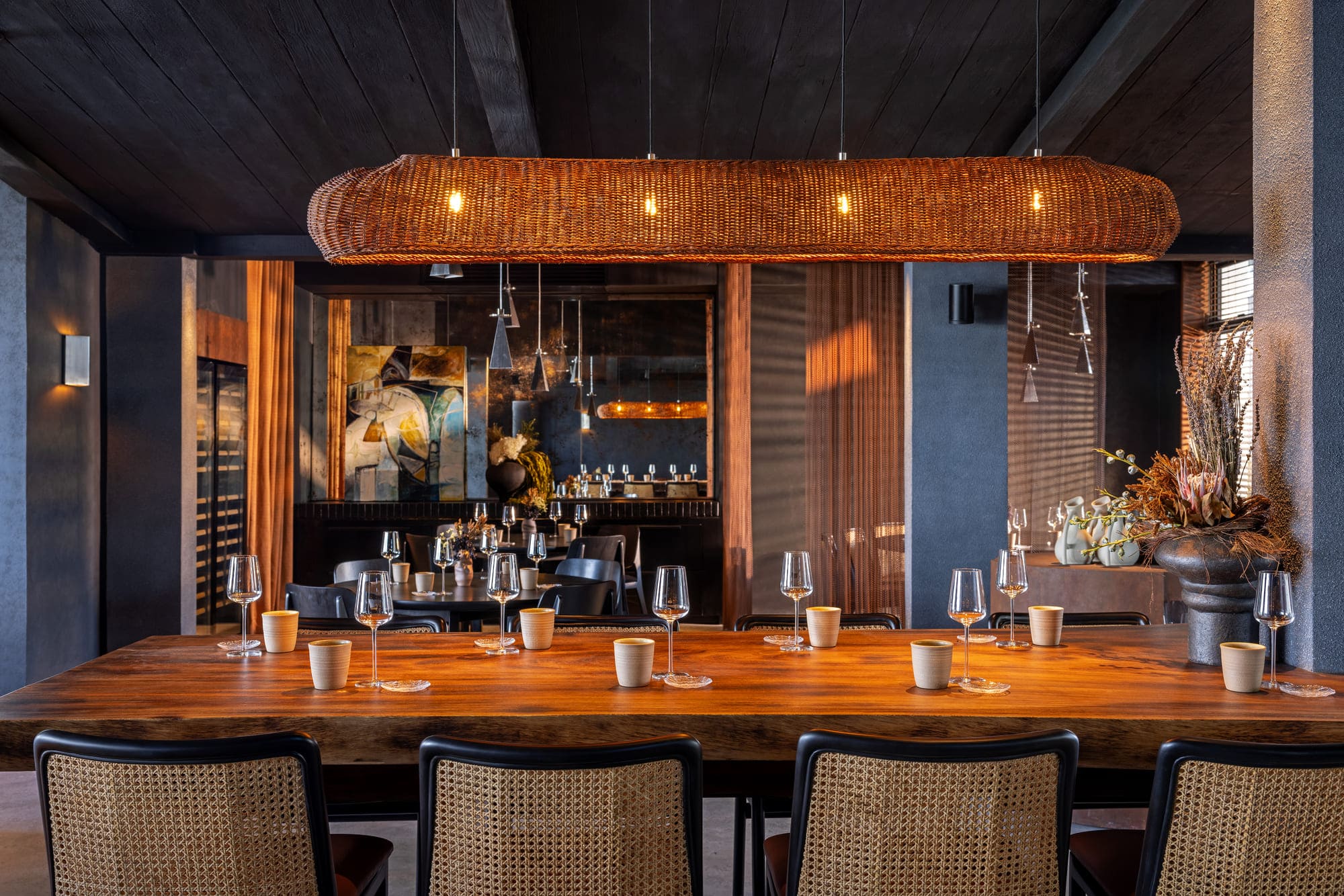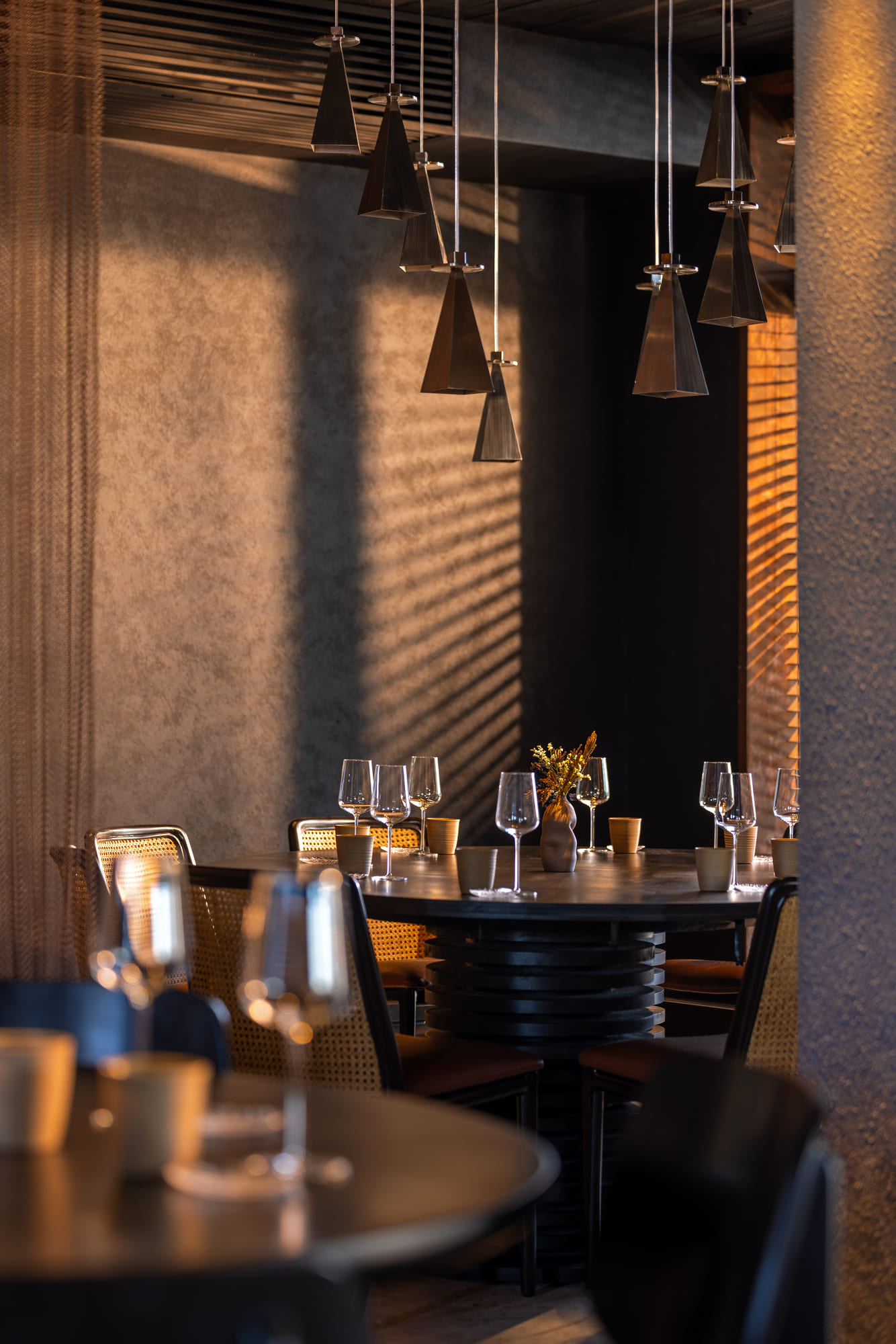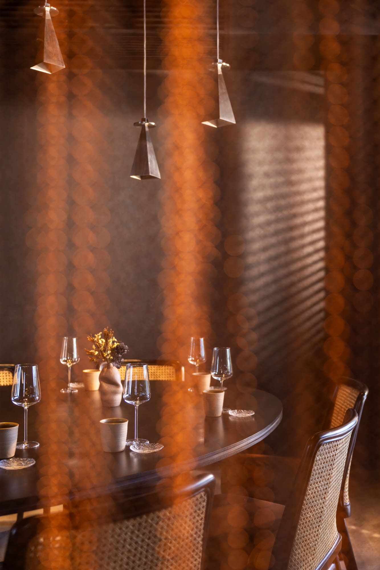 material elements, enhancing the atmosphere with a warm, dynamic glow. Features like the community table and intimate seating reinforce the sense of openness and warmth, making Celera an approachable yet distinctive and worldly dining experience in Manila.
