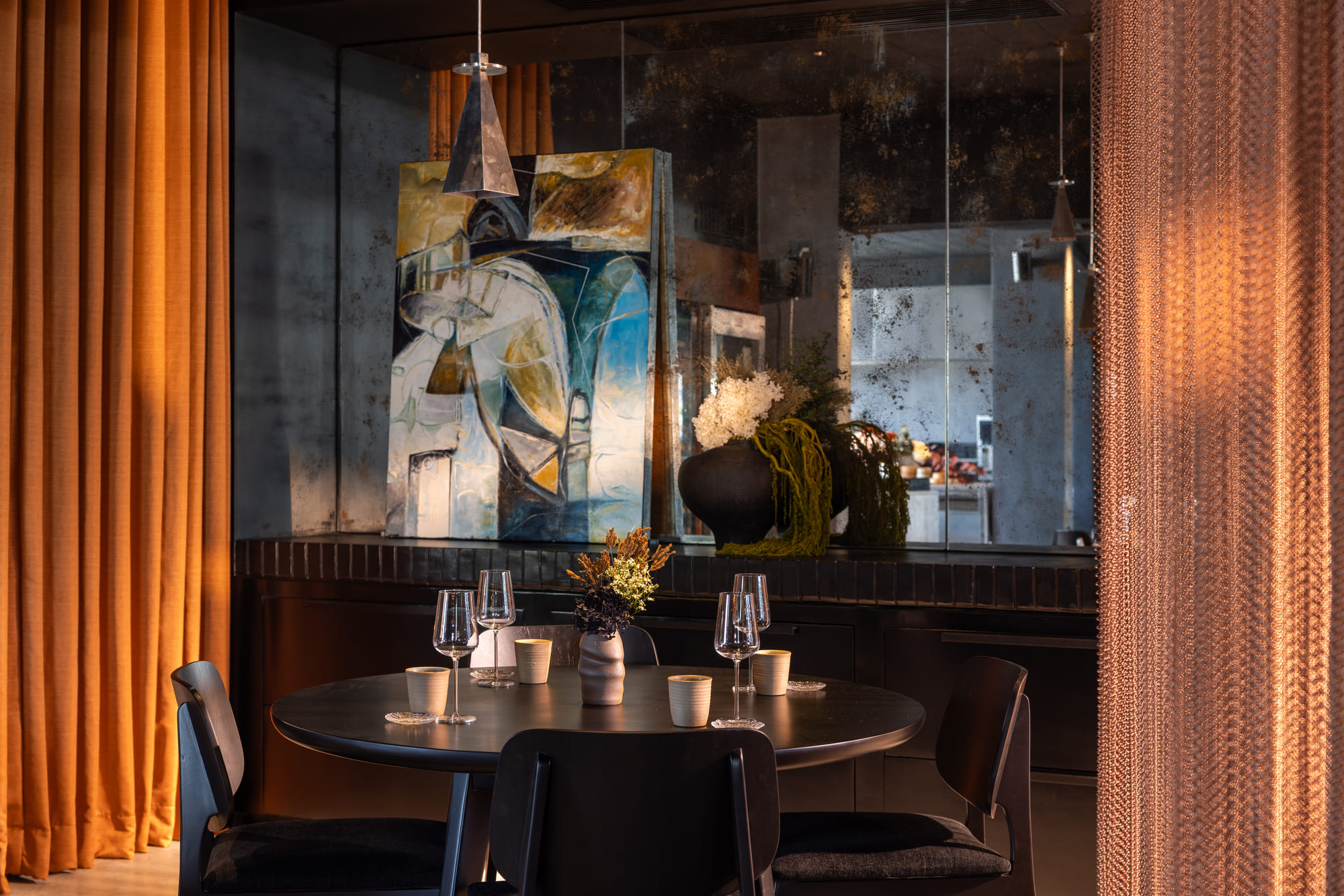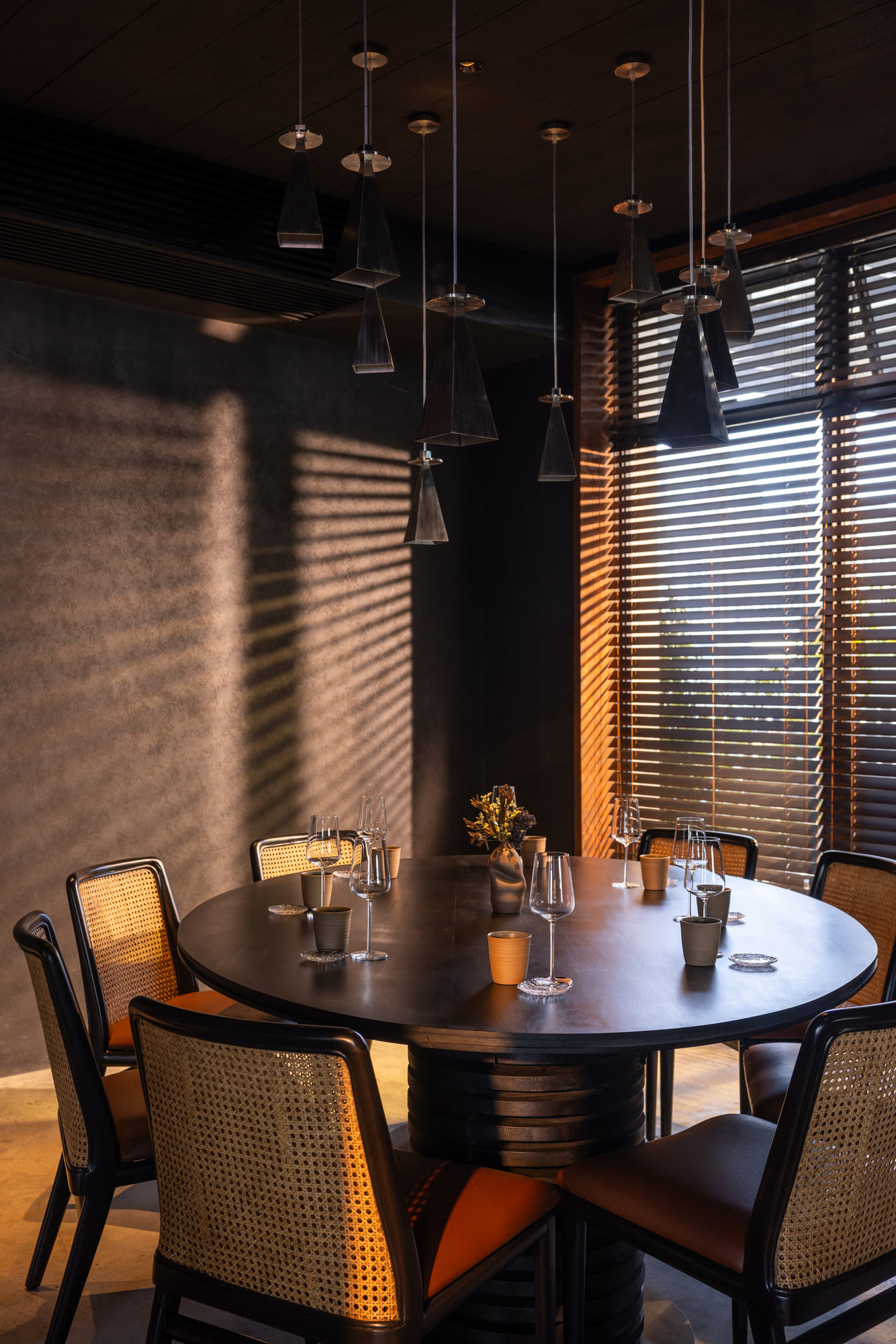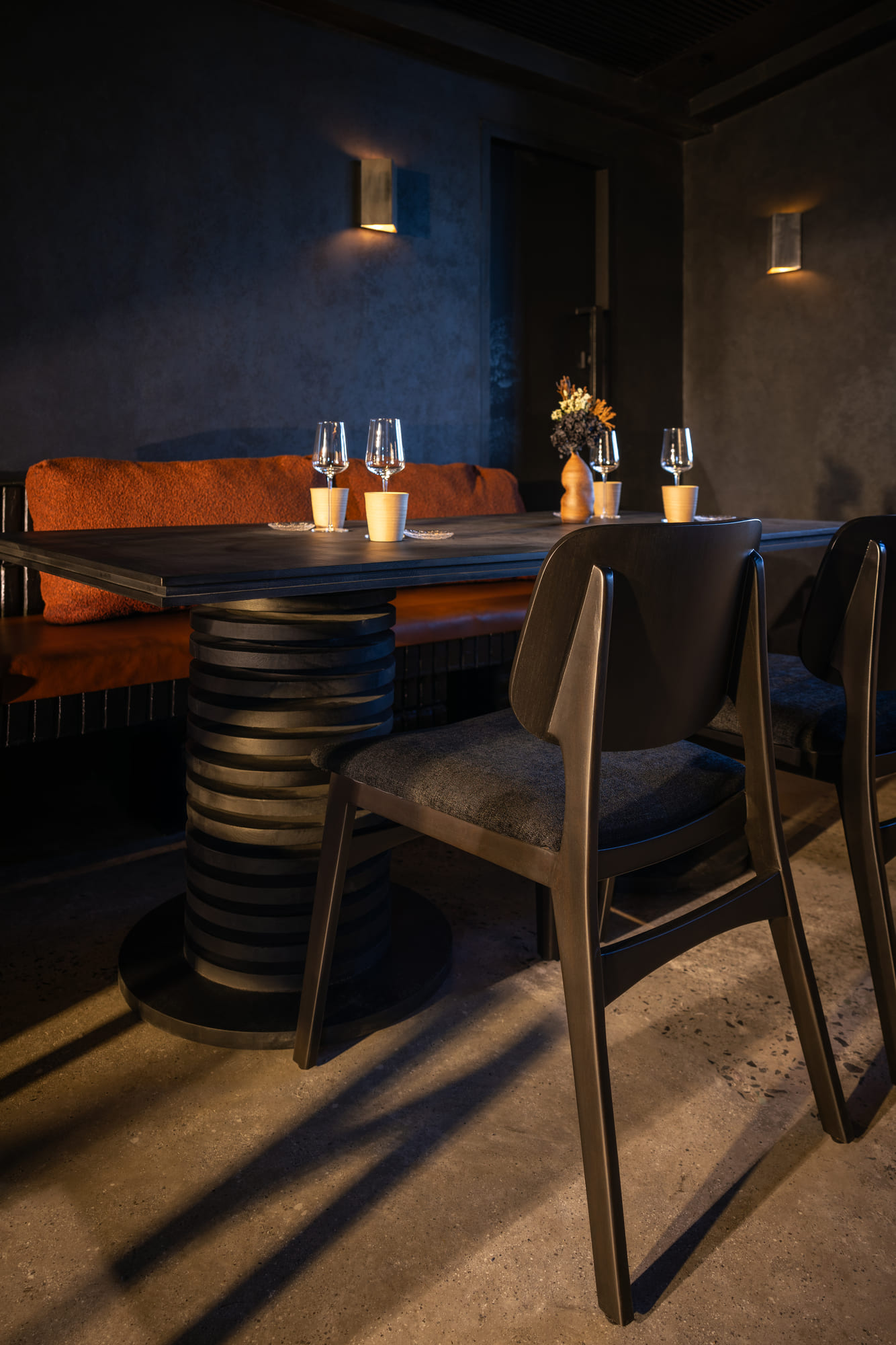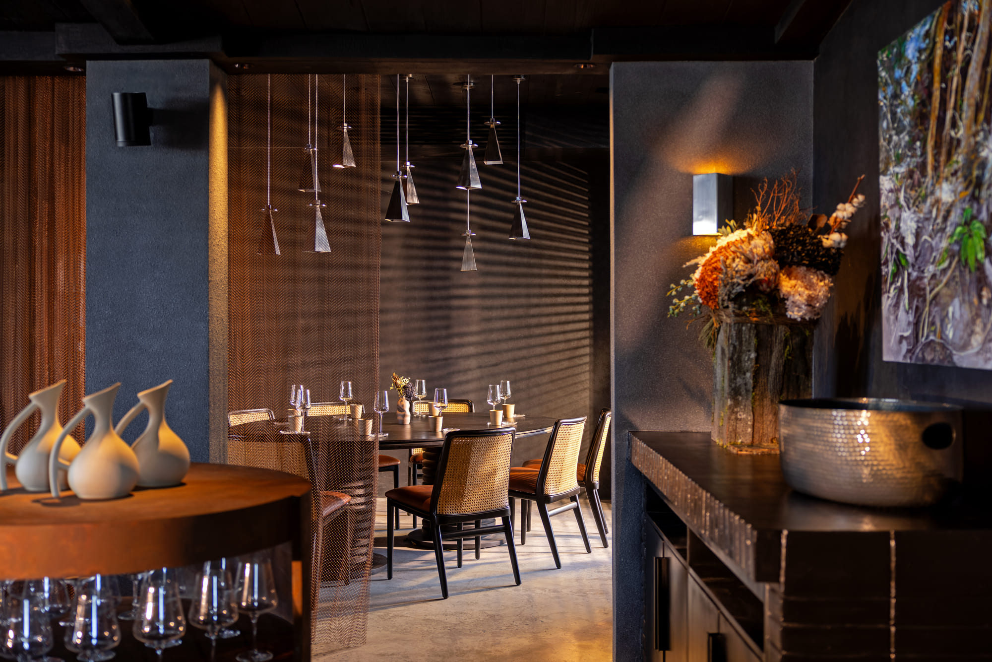 material elements, enhancing the atmosphere with a warm, dynamic glow. Features like the community table and intimate seating reinforce the sense of openness and warmth, making Celera an approachable yet distinctive and worldly dining experience in Manila.