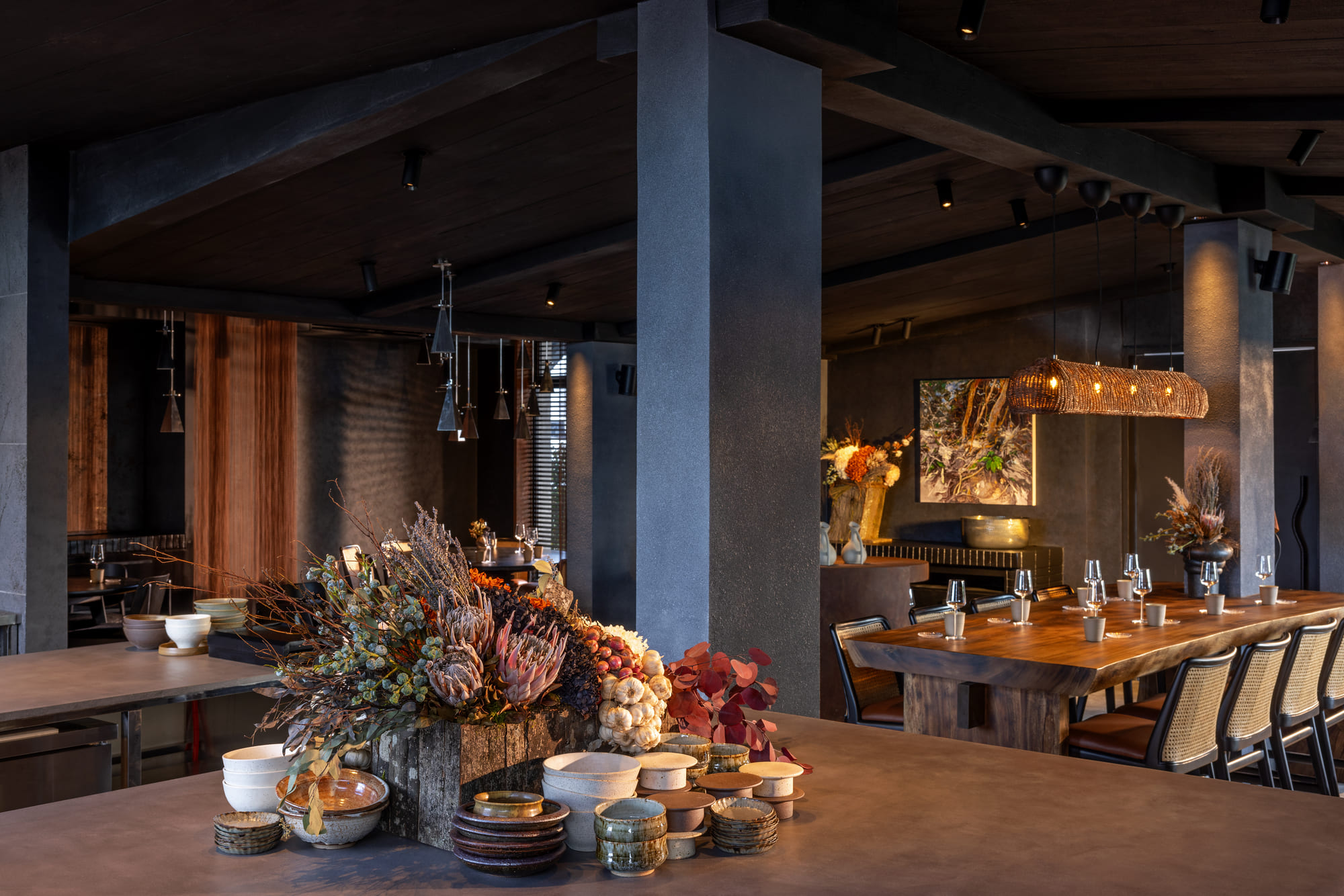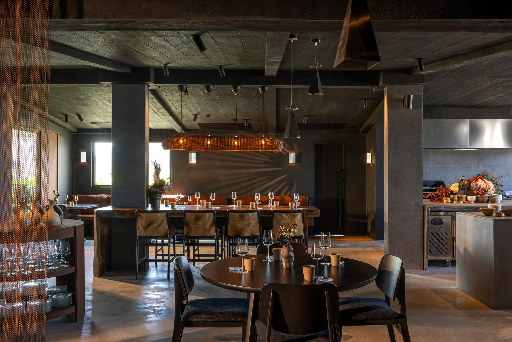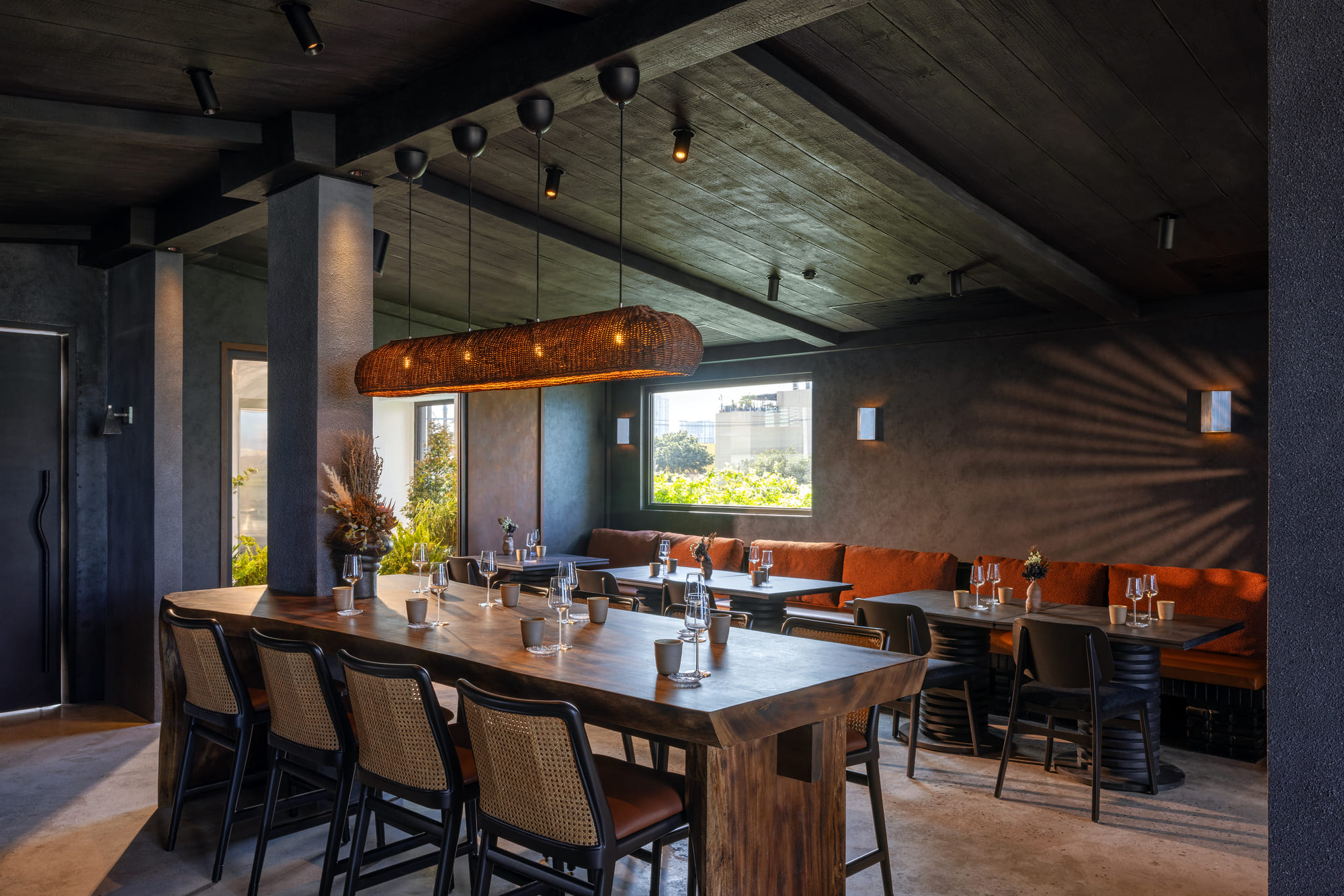 The restaurant’s interior, by JJ Acuna / Bespoke Studio, showcases natural materials— charred timber, exposed brick, and corten steel—layered with aged features and rustic