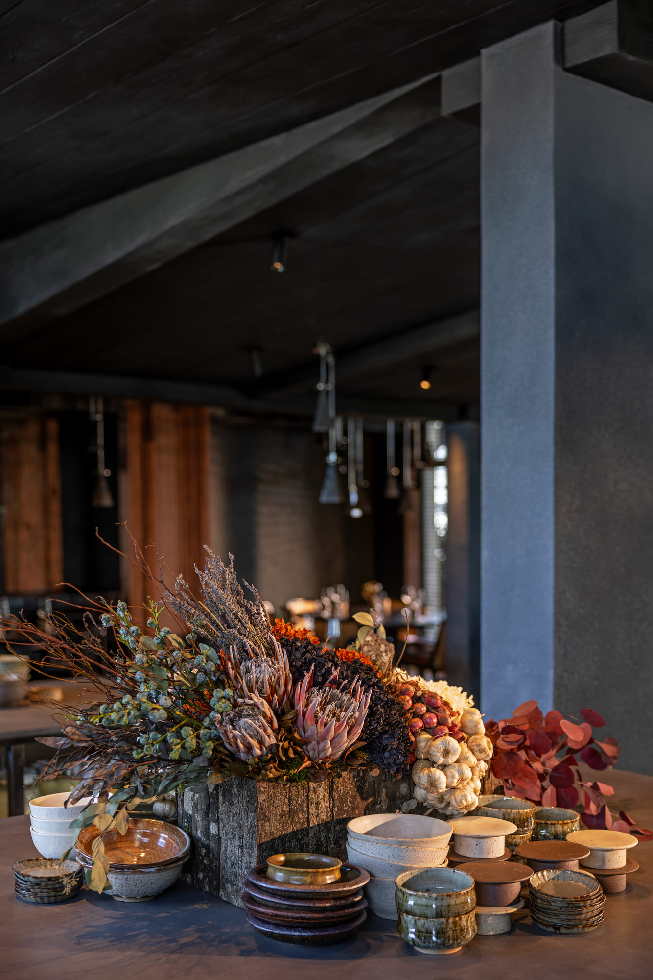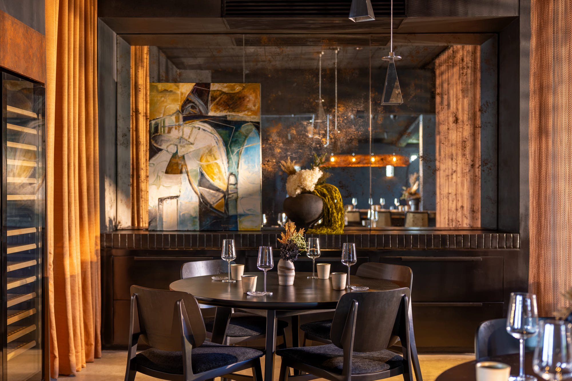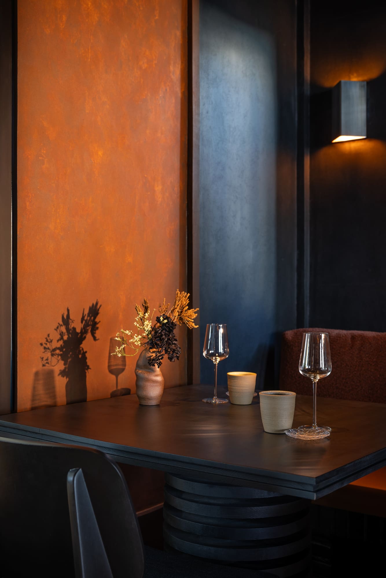 The restaurant’s interior, by JJ Acuna / Bespoke Studio, showcases natural materials— charred timber, exposed brick, and corten steel—layered with aged features and rustic