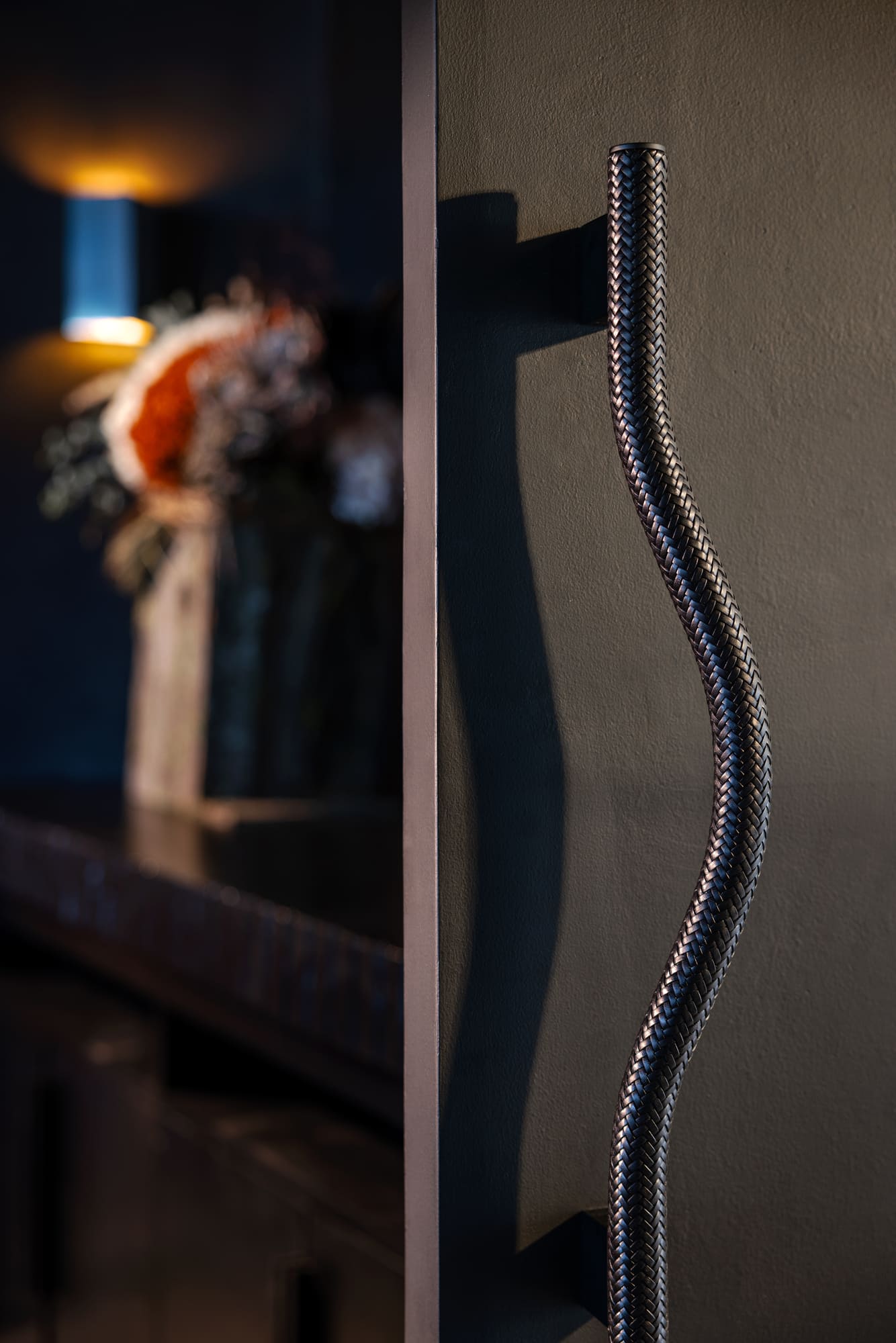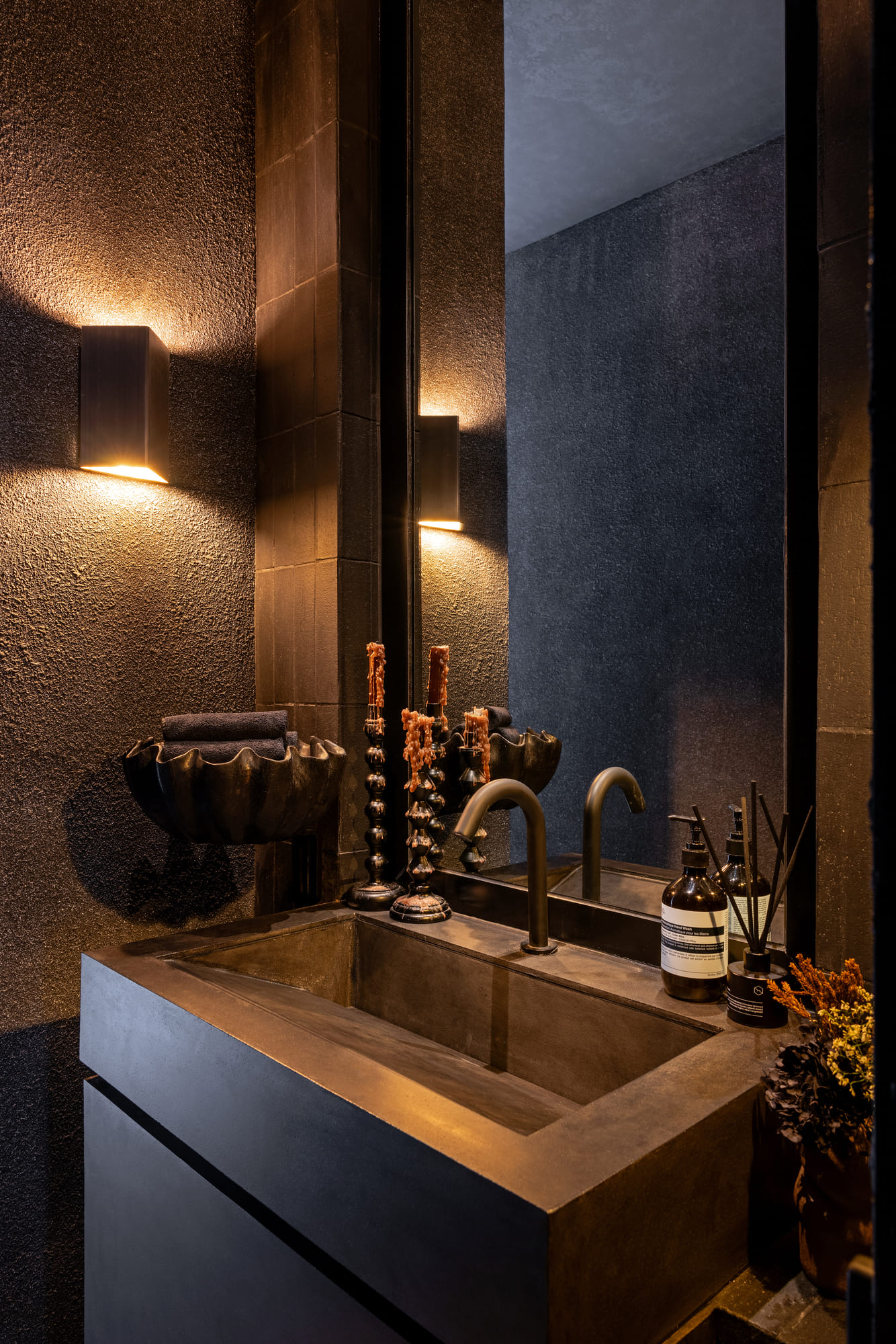 textures. These elements create a deliberate balance between rugged and refined aesthetics, while large windows and pockets of natural light soften the darker finishes.