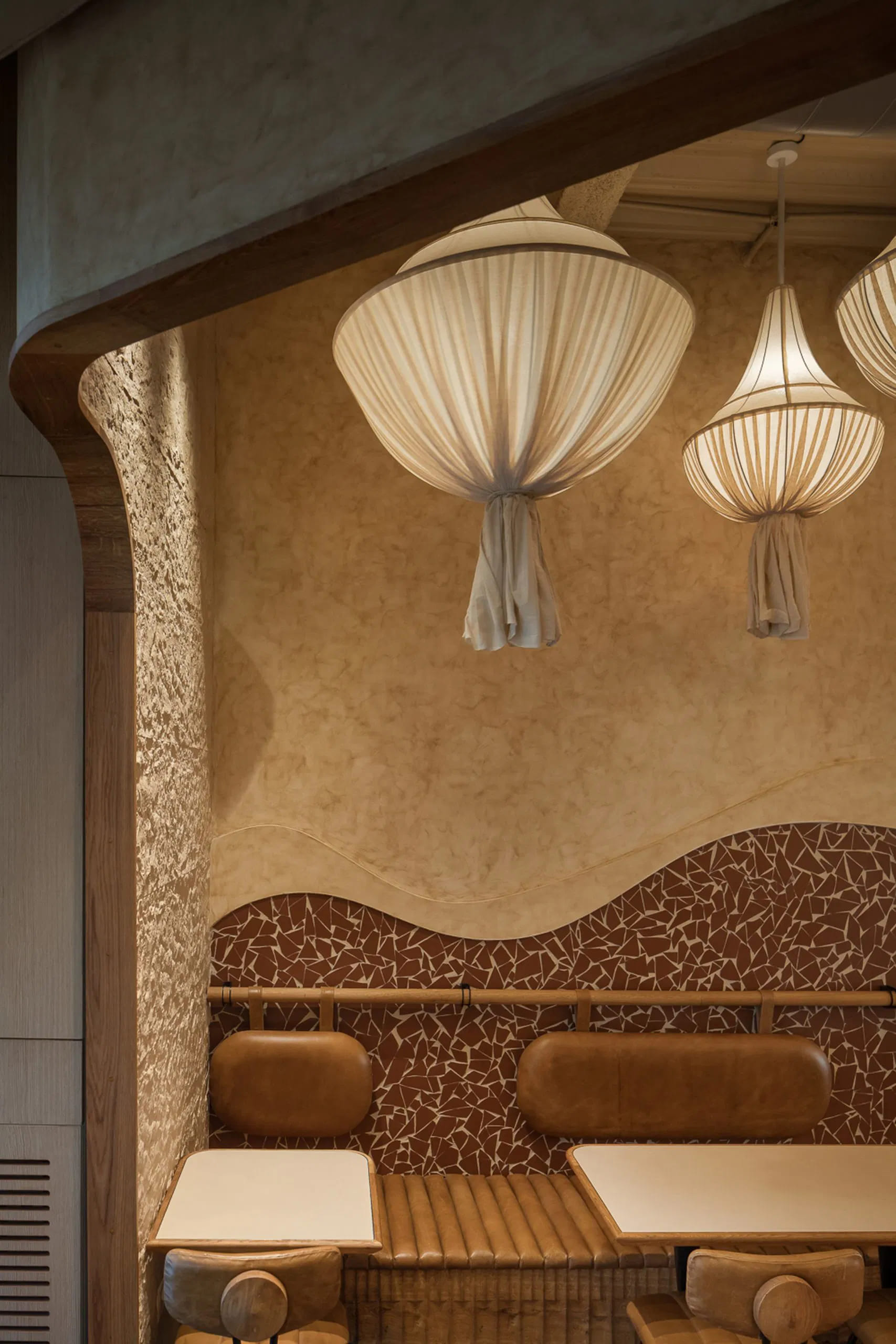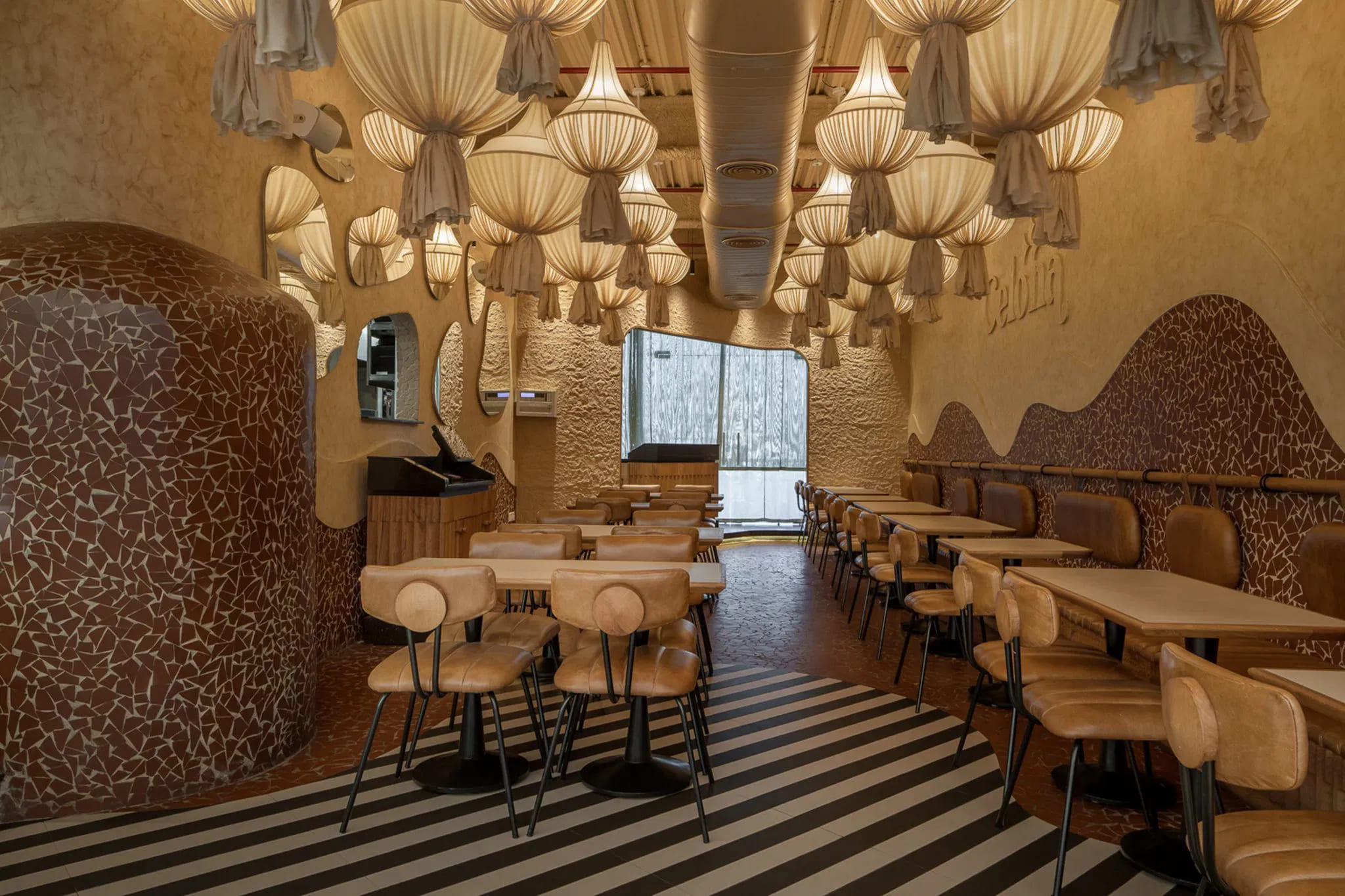 Upon entering Celona, the guests are greeted by a bold façade done in off-white and black stripes strategically accentuated by architectural lighting. The stripes are carried forward to the interiors in the form of flooring. The geometry of the stripped lines are broken by curves organically flowing throughout the space in the form of broken tile mosaic. The mosaic in terracotta colour makes for an integral design element in flooring as well as wall treatment and makes the design language firm.