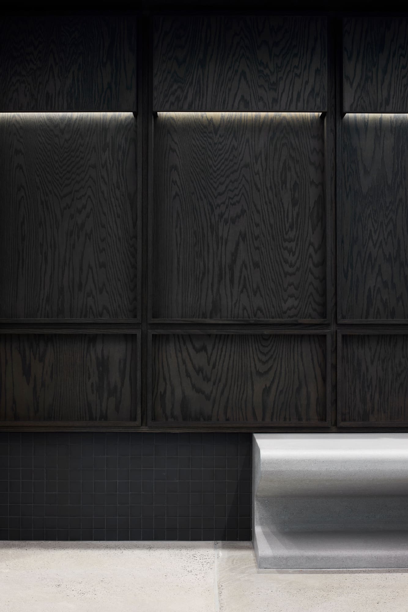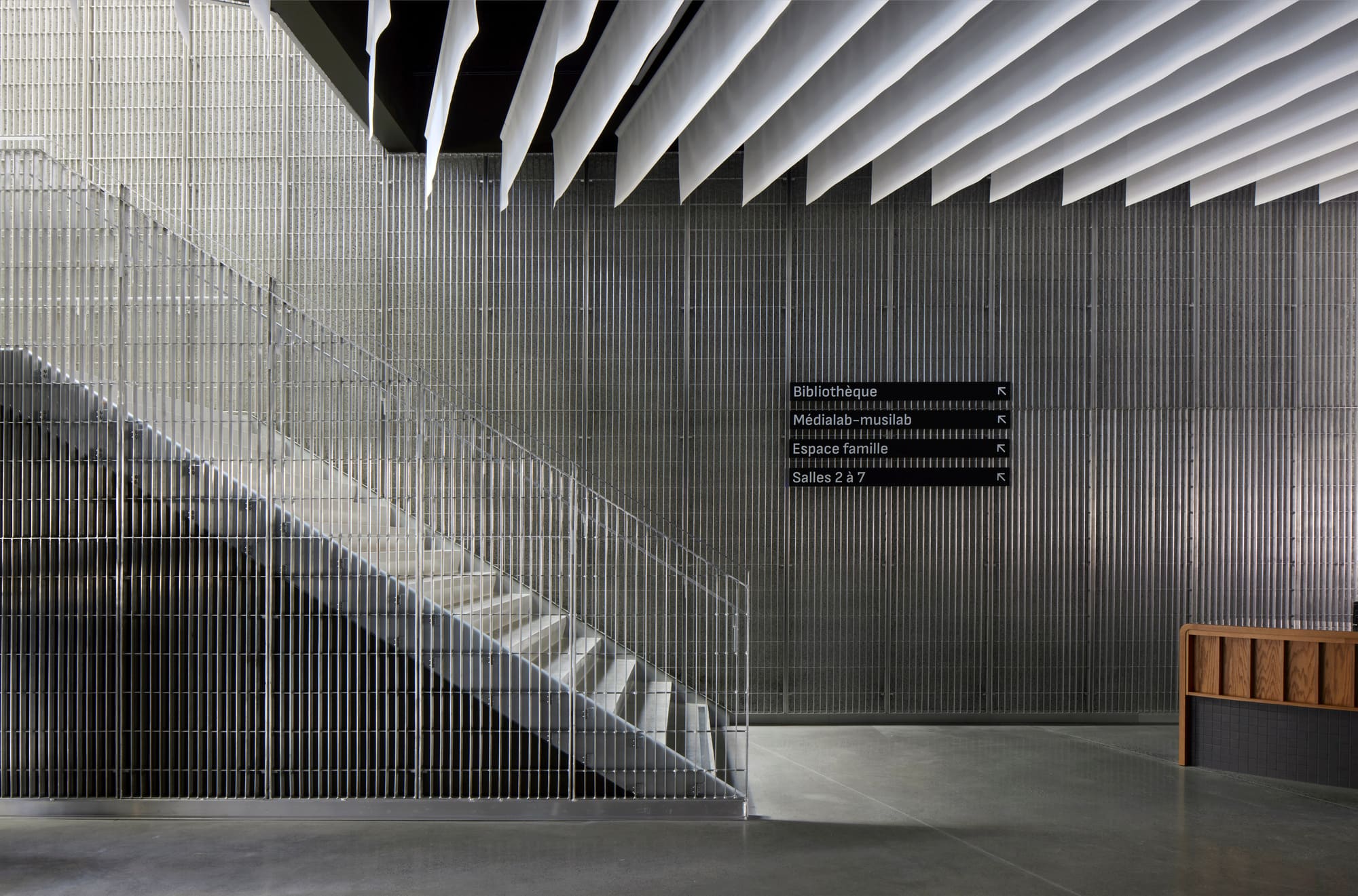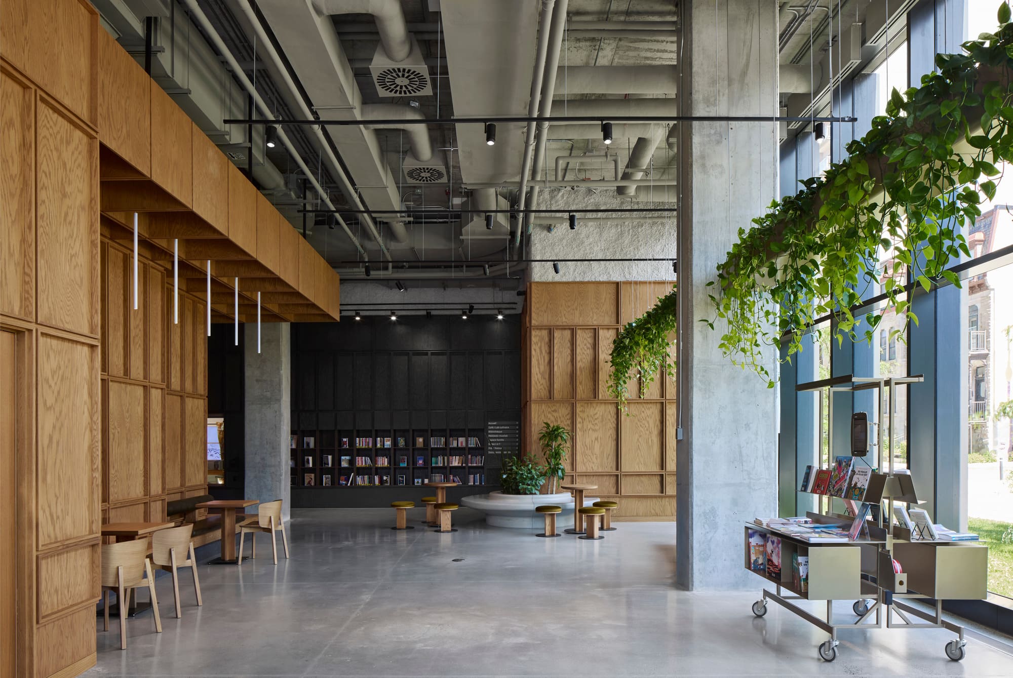The Centre adopts collage as an architectural language, allowing diverse textures and tones to coexist in harmony. Aluminium grating, glass, wood paneling, polished concrete, sprayed cellulose, and soft textiles compose the project’s material concept. This layered palette captures the Centre’s spirit as a mosaic of voices, uses, and identities, a built reflection of Montreal’s social and cultural diversity.