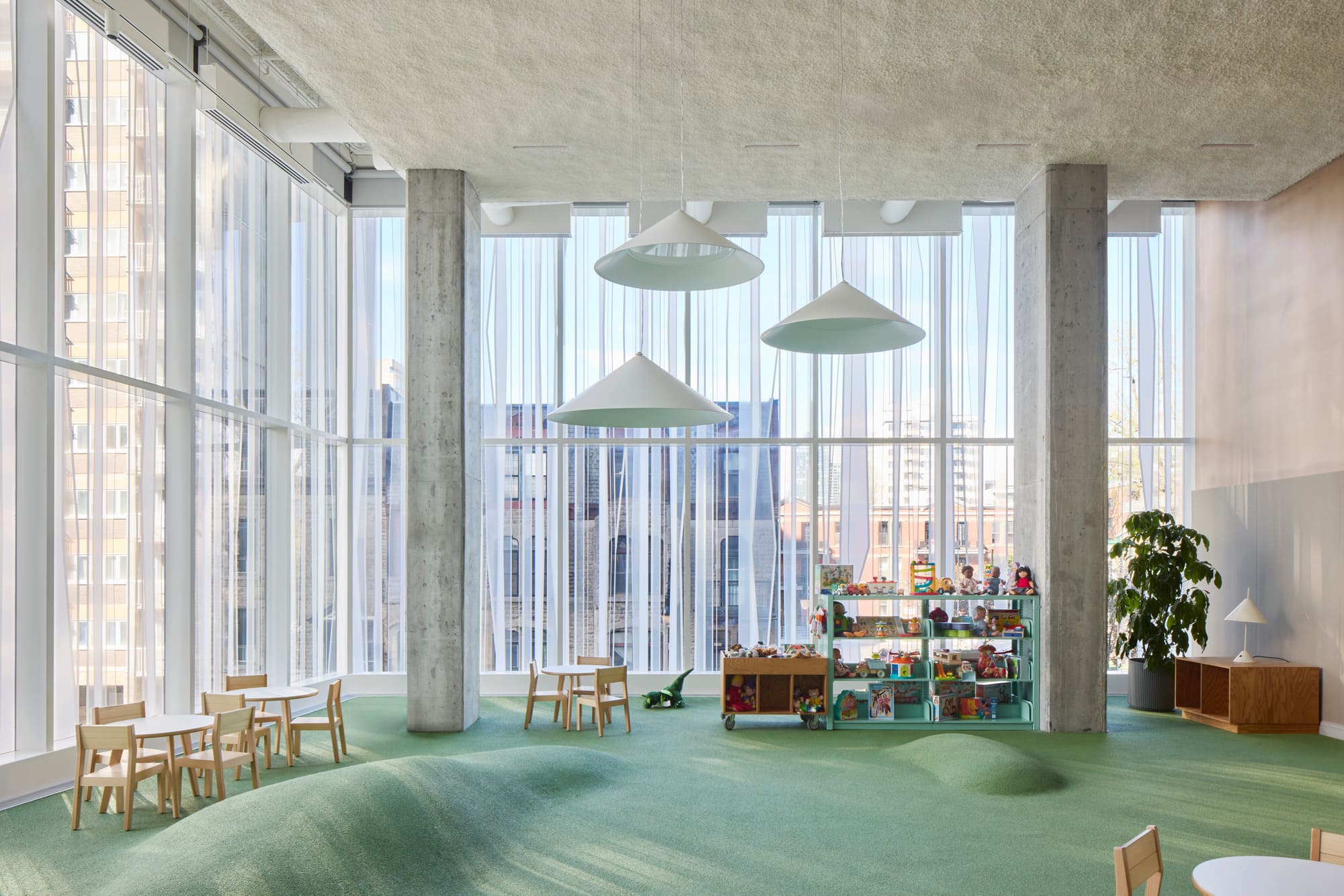 Occupying the podium of a new residential development on the former site of the Montreal Children’s Hospital, the Centre leverages its inherited structure, at once generous and complex to its fullest potential. The interiors unfold like an urban landscape, conceived as an extension of the surrounding city. Fluid circulation, transparency, and accessibility shape every gesture, reinforcing the Centre’s civic vocation as an open and participatory fabric. More than a traditional community facility, Centre SANAAQ is a living space, and a setting for learning, exchange, and experimentation.