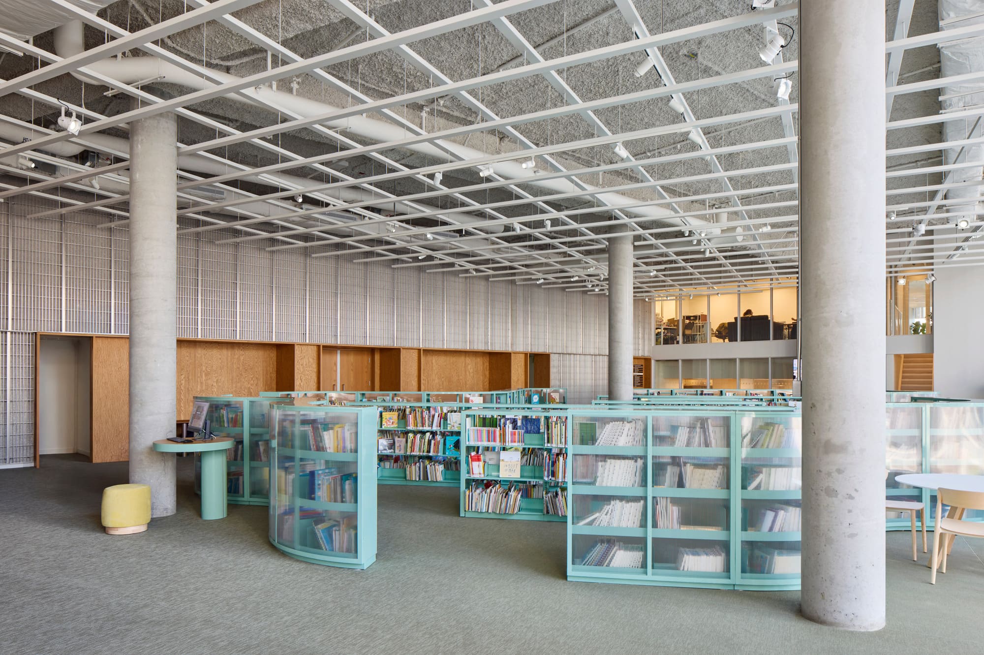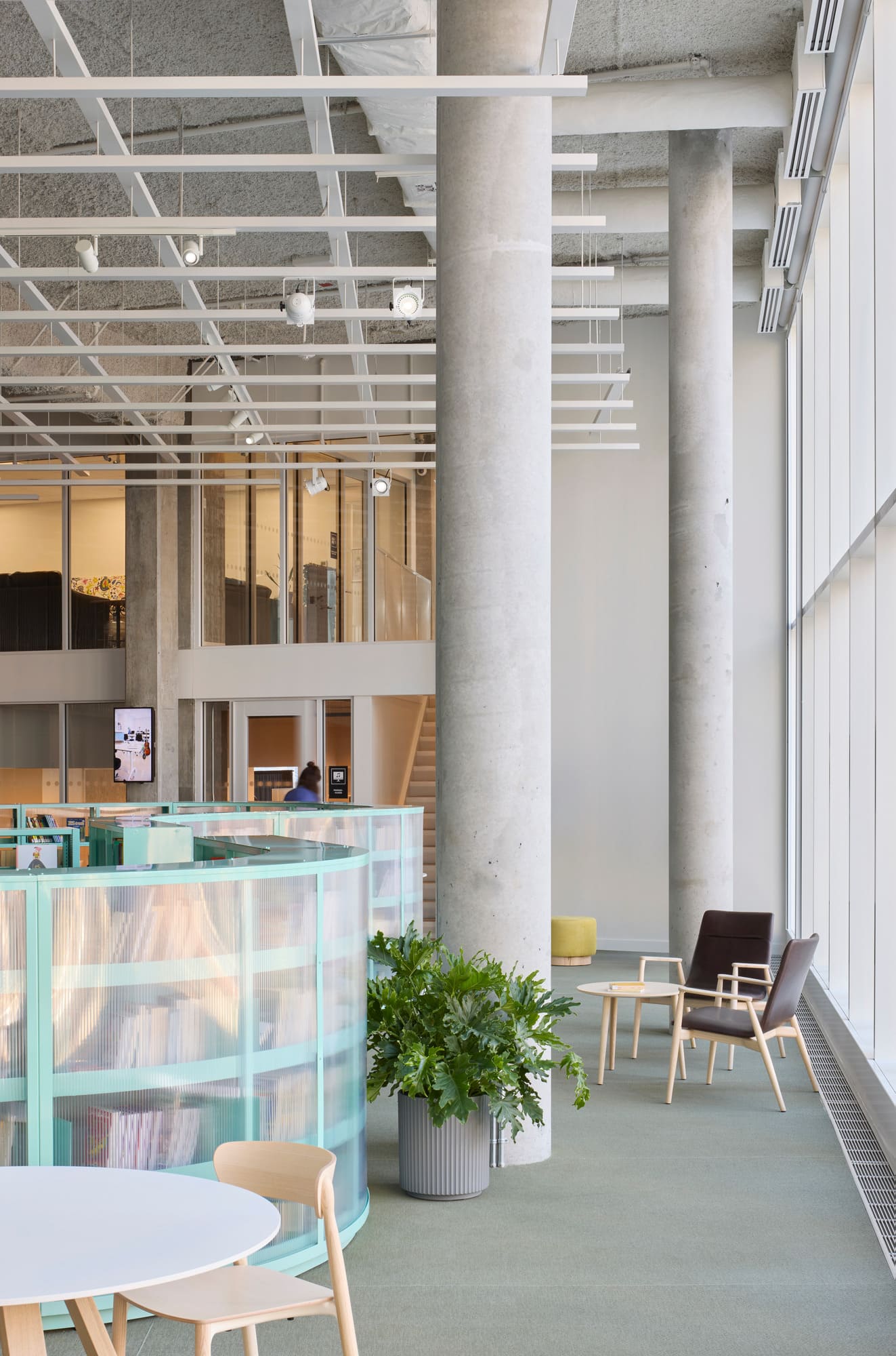 Its spatial organization unfolds like an archipelago, a constellation of distinct yet interconnected “islands”, each with its own mood and function. From open, animated common spaces to quieter reading zones, every space invites discovery and movement. A central agora anchors the ground floor, surrounded by a café, performance hall, multi-purpose room, and an express-library, fostering encounters and casual exchange. A generous light-filled staircase links this sequence of spaces to the upper level, where the library wraps around a central mezzanine. Collections for adults and youth, reading and study areas, multipurpose rooms, and a children’s play area create a balanced rhythm of openness and retreat.