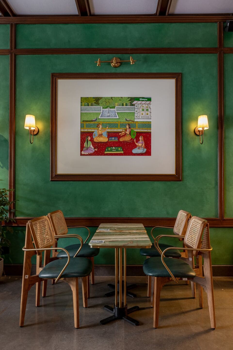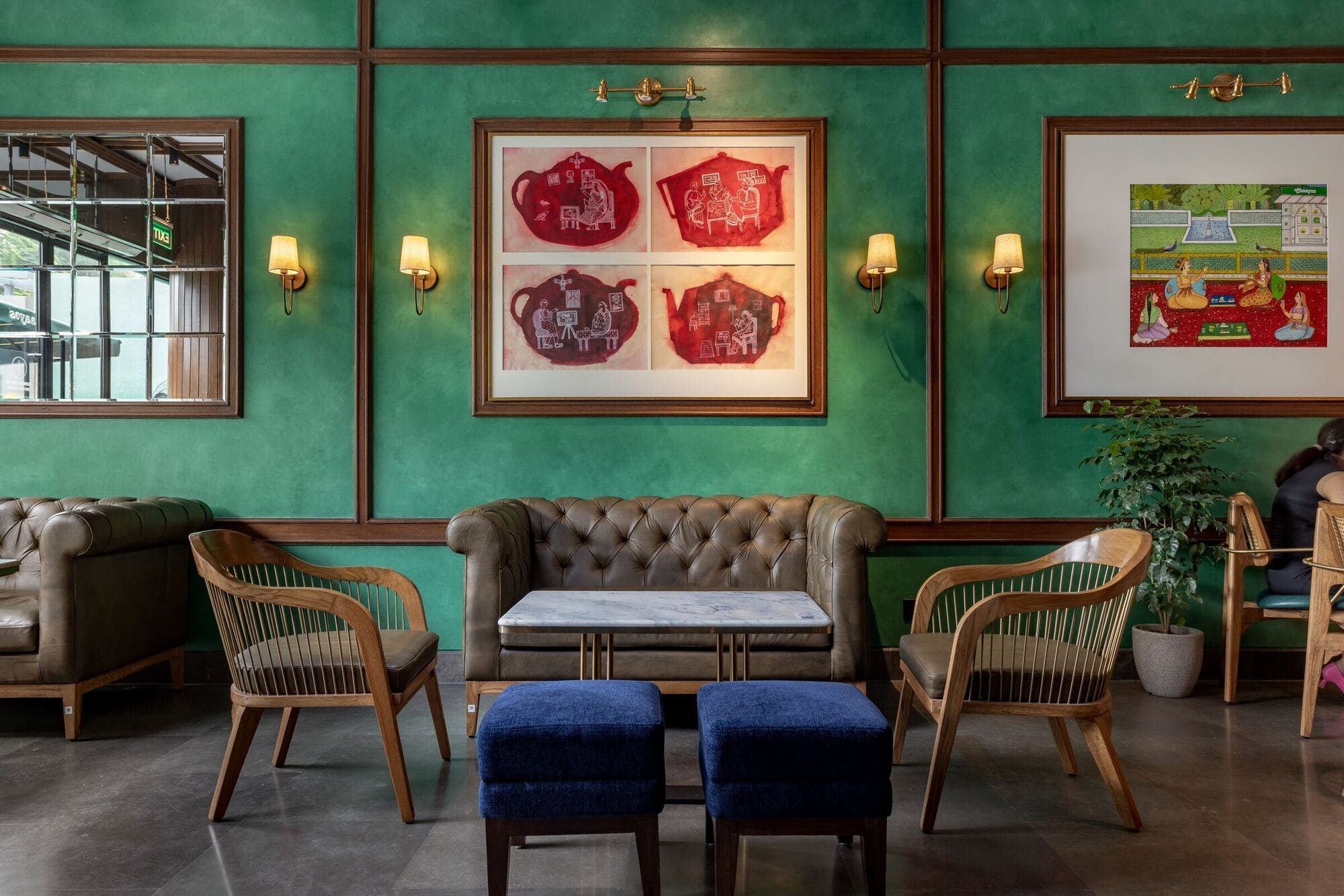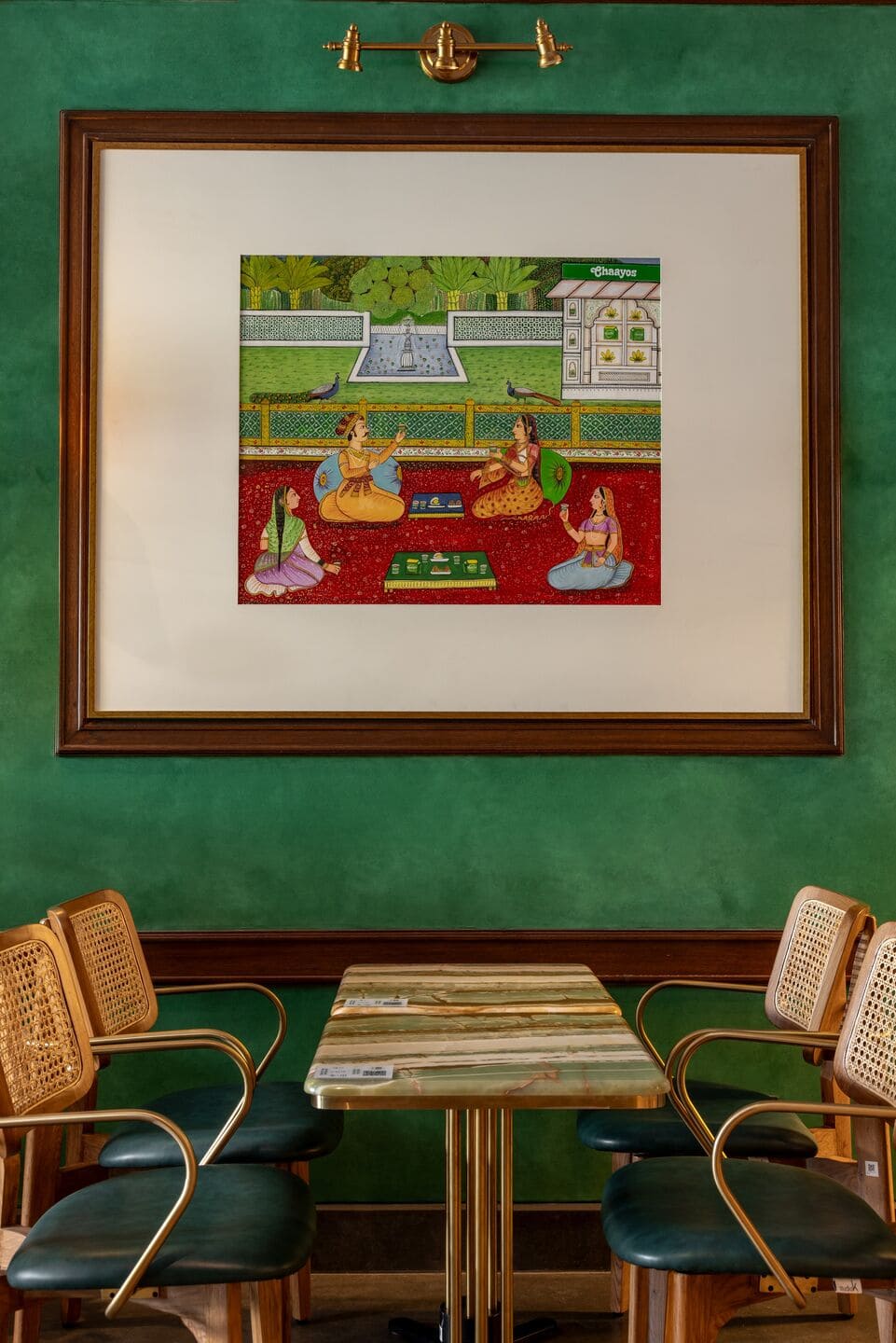 Across Chaayos outlets, Indian arts and crafts take centre stage, reflecting a commitment to local artisanship and cultural heritage. In the Aerocity café, this vision comes alive through contemporary, tea-themed versions of traditional art forms done in collaboration with local artists. A simplified rendition of Phulkari weaves from Punjab, in vibrant greens, evoke the tea plantations on the hills of Darjeeling and Munnar. An artform from Rajasthan, a three-part Warli art offers an abstract depiction of tea collection and processing. In a Mughal miniature painting, royal subjects are imagined indulging in tea within palace courtyards. Chai thus becomes a unifying identity that celebrates the diversity of India and its culture.