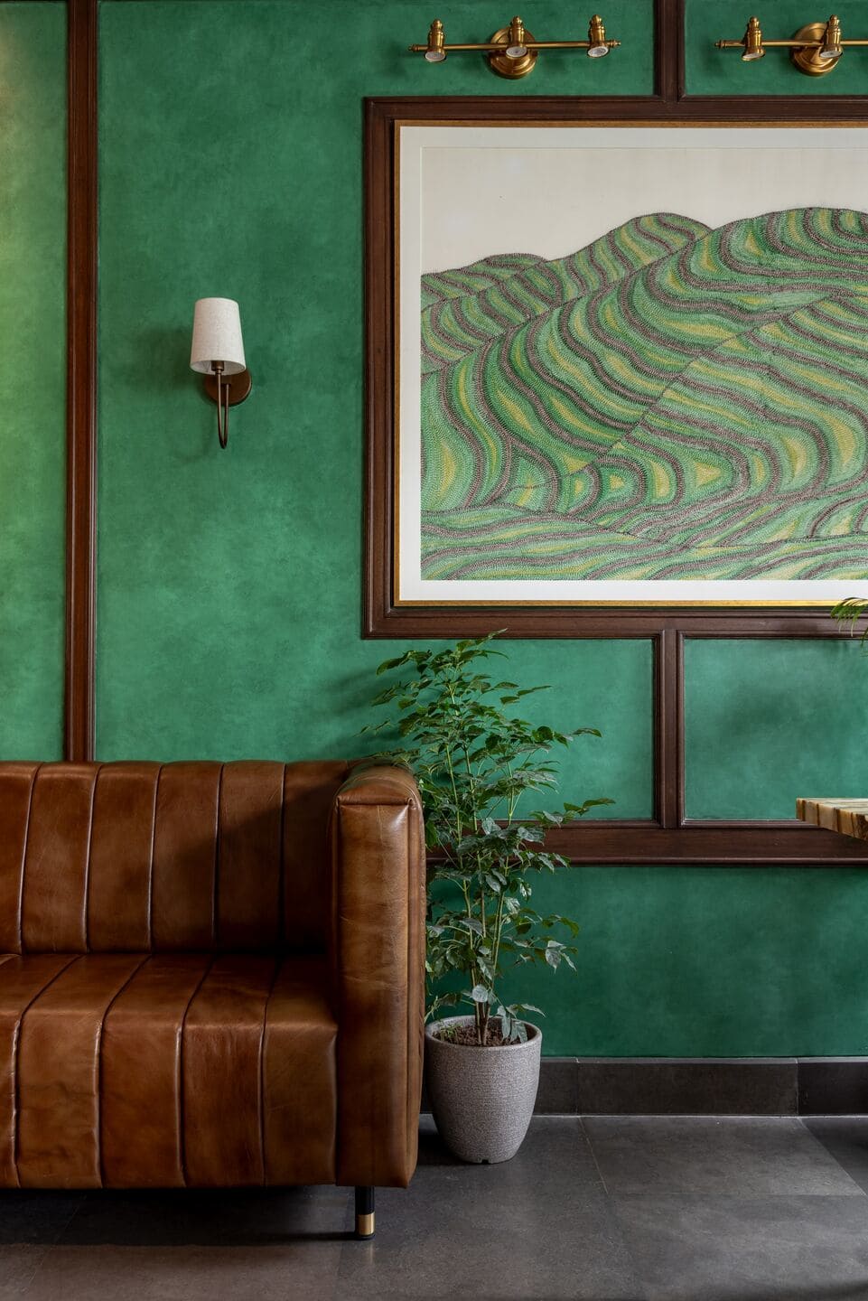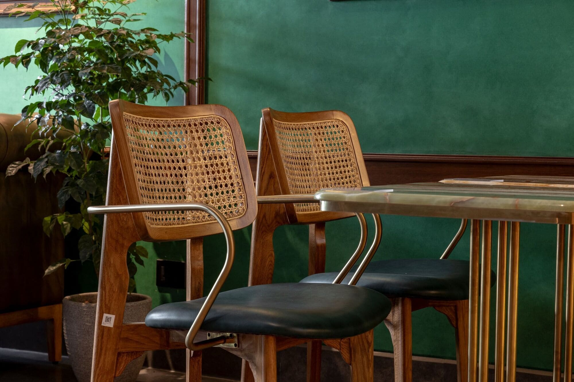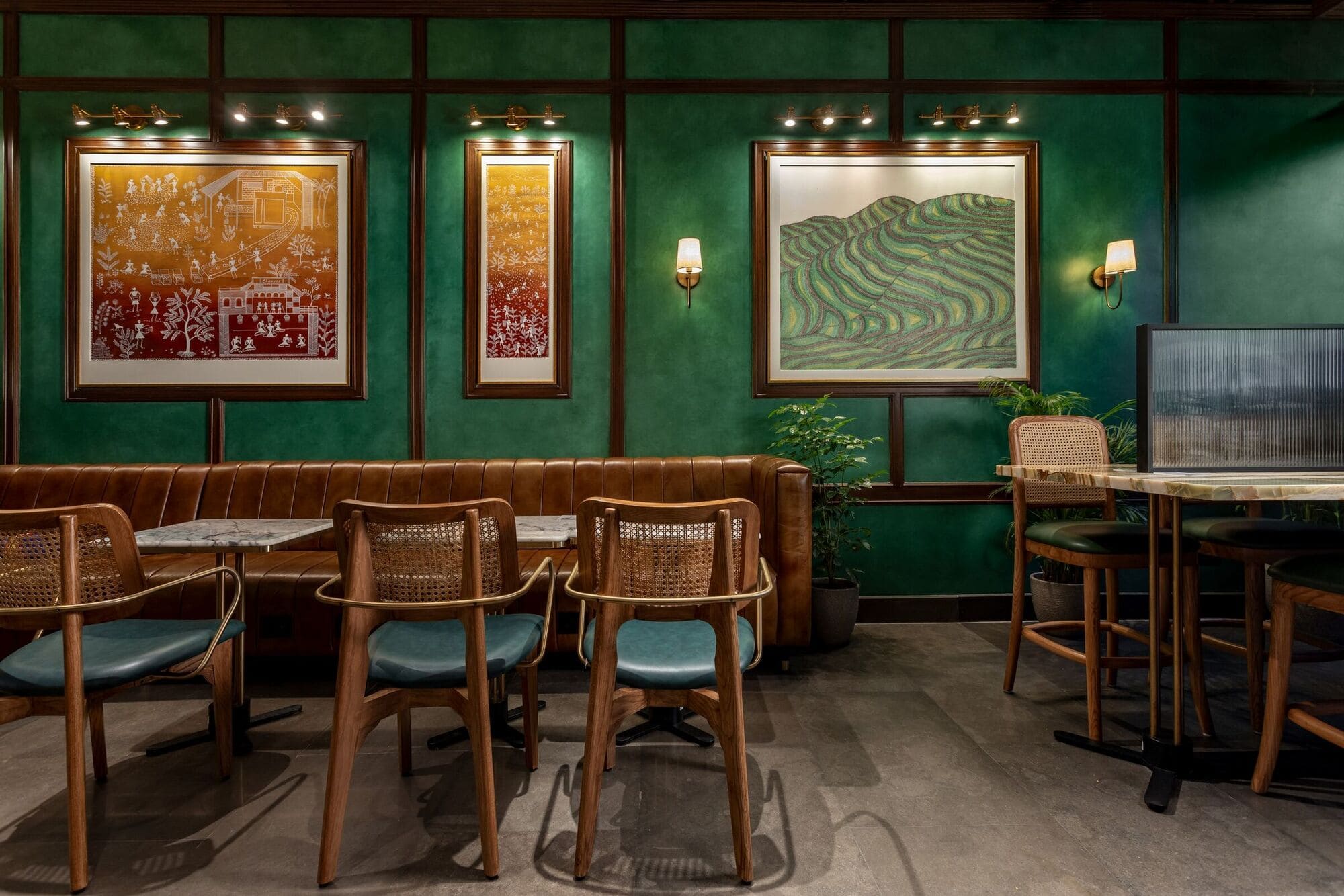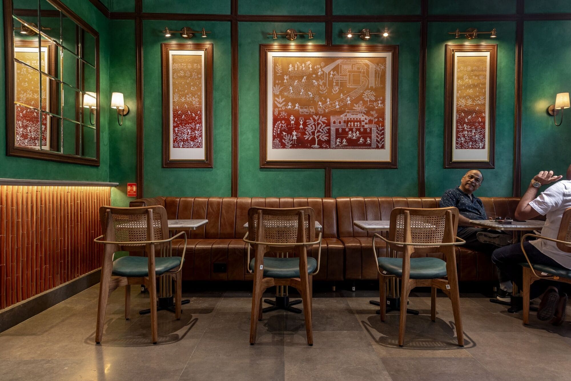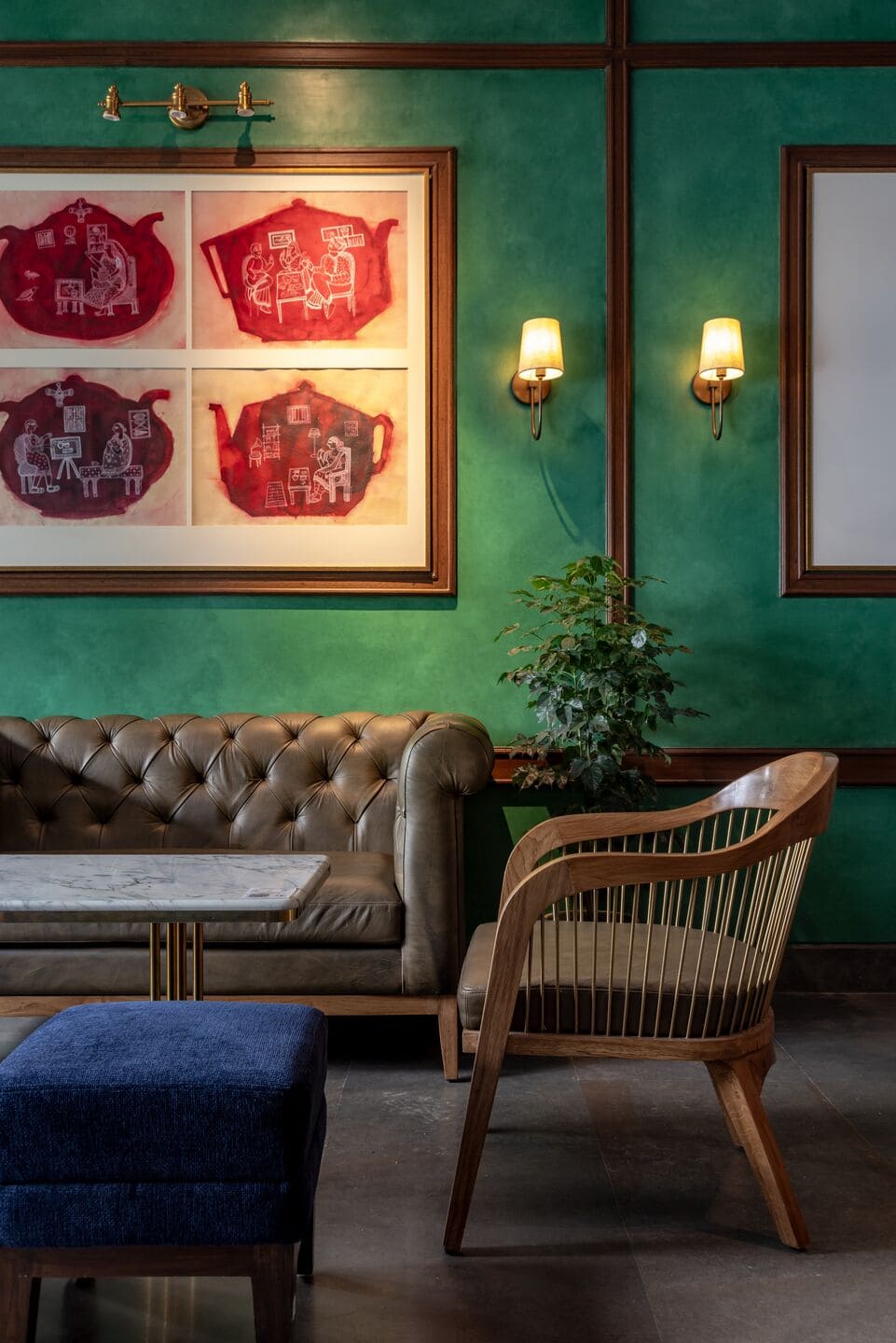 Like many typical Indian homes which are often mixes of various styles, patterns, and textures, the Aerocity outlet adopts an eclectic interior while maintaining cohesion through its earthy colour palette of browns and greens. Diverse furnishings—leather sofas, spline chairs, and Chandigarh chair-inspired dining seats—bring a distinct flavour to the space. These handcrafted chairs, reminiscent of old rattan cane-woven office seats, along with the earthy scent of brewing chai infused with the warmth of ginger and cardamom evoke memories of home.