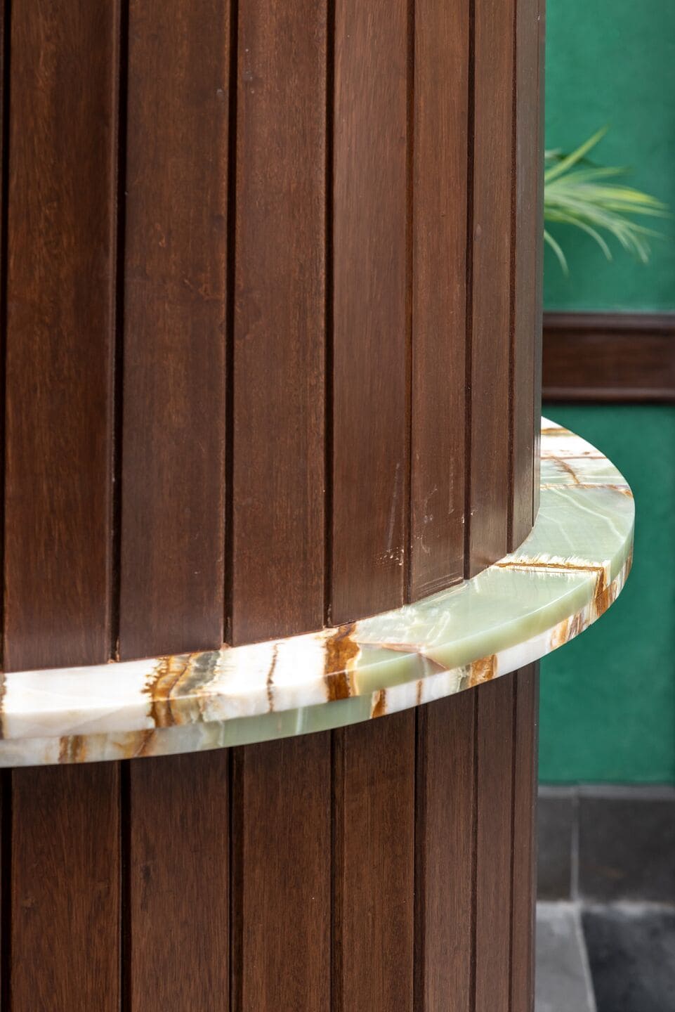 The materials and labour used in the café were also locally sourced, reinforcing authenticity. The walls, textured with lime plaster in Chaayos’ signature green, feature acacia wood frames that stretch across the walls and ceilings, echoing the wood-paneled vernacular homes. The ceiling’s linear framing also serves to elongate the space, creating a seamless flow.