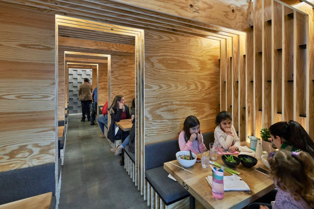 The design for CO-OP Ramen evolved from the productive dissonance of the new and the old, the highly crafted and happenstance.The space, constructed of simple and un-refined materials, prominently concrete masonry units and plywood, exudes a richness through the carefully composed textures of the space.The view of the restaurant from the exterior storefront windows is filtered through a continuous length of steel beaded curtain, which reflects and softens the light, and defers the full experience of the space until one enters. Embracing the Japanese notion of wabi sabi, which celebrates the asymmetries and imperfections in rough and natural objects, it was created a “cave” containing booths from simple construction quality plywood, elevated by careful joinery and edge detailing, highlighted by concealed light fixtures.Passing through the compressed articulated space of the Cave, the guest is released in to a spacious communal seating area, spatially connected by under a deeply coffered plywood ceiling.Light travels through the depth of the plywood, causing light and shadow to become caught up in the recesses and in-between.Surrounded by carefully laid concrete block walls softened by a 12 ft tall living green wall, guests can watch the chefs at work in the open kitchen, creating refined versions of simple food, itself a celebration of the same spirit of wabi-sabi.