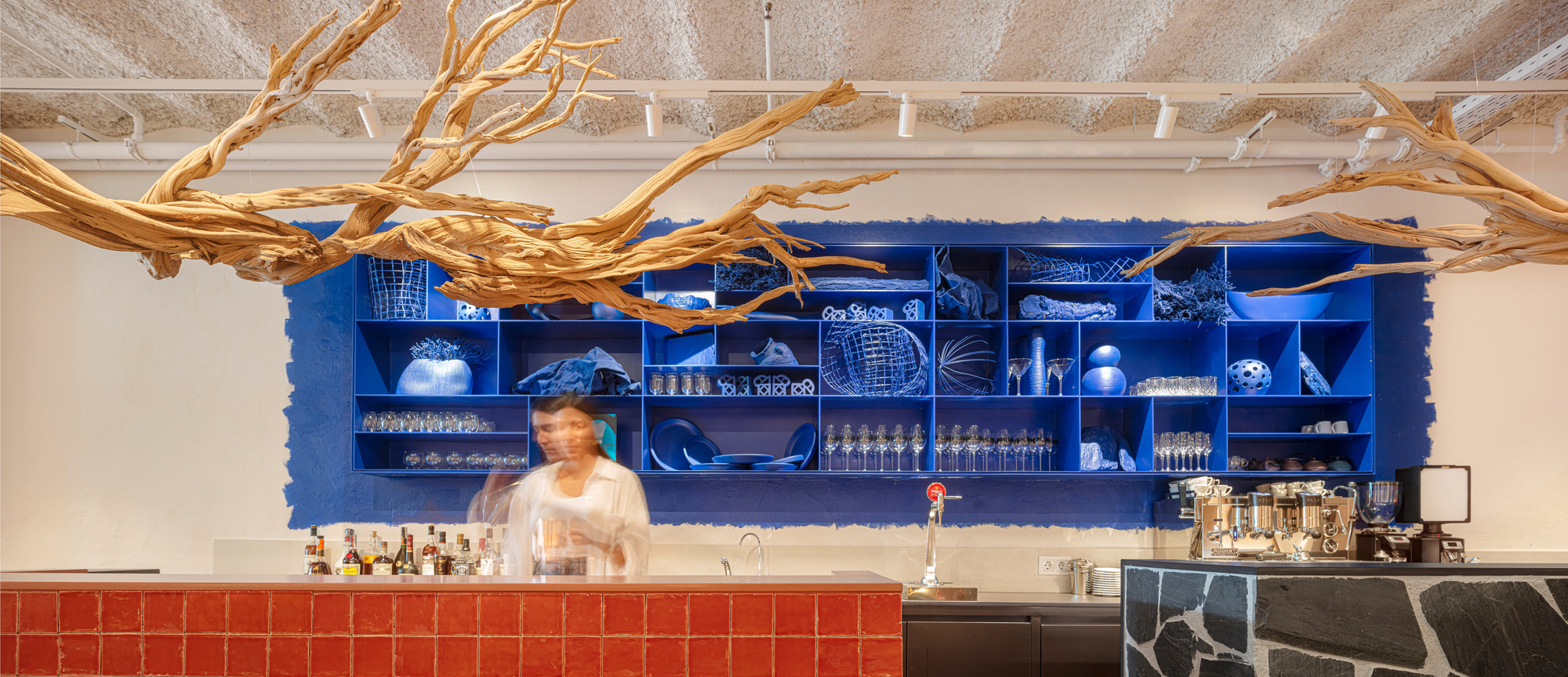 The chefs of Compartir aimed to bring the essence of the Mediterranean town of Cadaques, home of their first restaurant, to their new gastronomic concept in Barcelona. Slate roads, blue windows to the Sea, vessels rocking on the bay, and wicker craftsmanship invading its streets are part of the artsy spirit of Dali’s town. El Equipo Creativo’s design aims to recreate this picturesque spirit, but is reinterpreted from a contemporary urban perspective.
