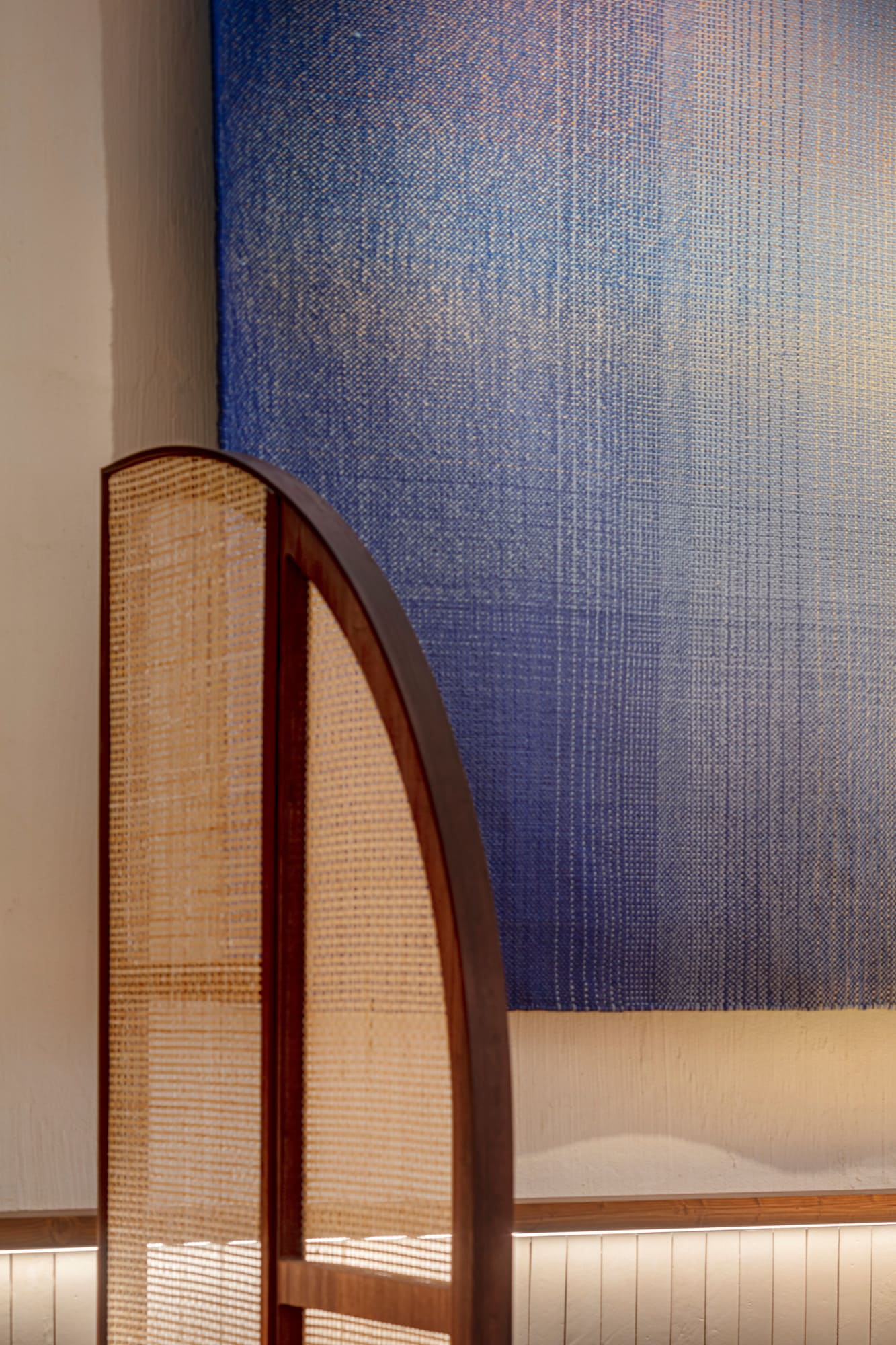 And so it is that the designers imagined the design: an ample white space presided by three blue abstract “windows” towards the Mediterranean Sea: a sculptural, a pictorial, and a textile window. Each of these “windows” became an opportunity to collaborate with a different local artist, with whom custom-made pieces were created for the restaurant.