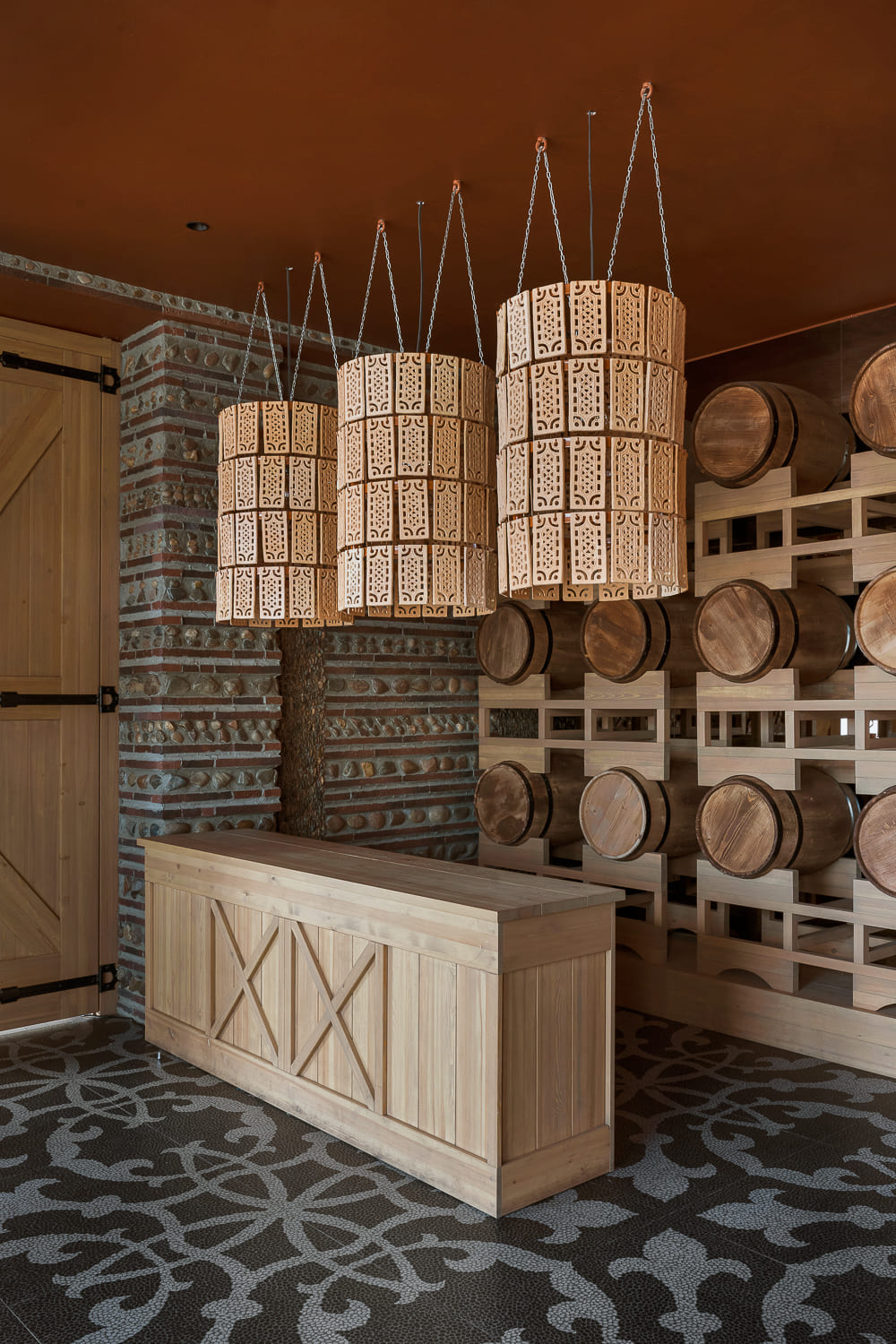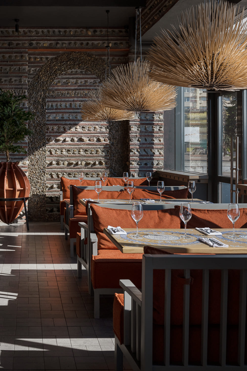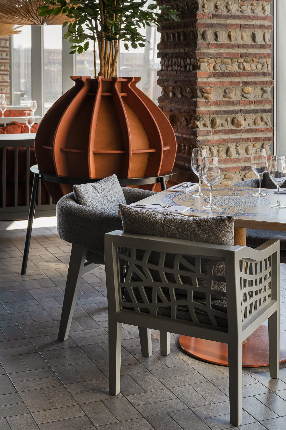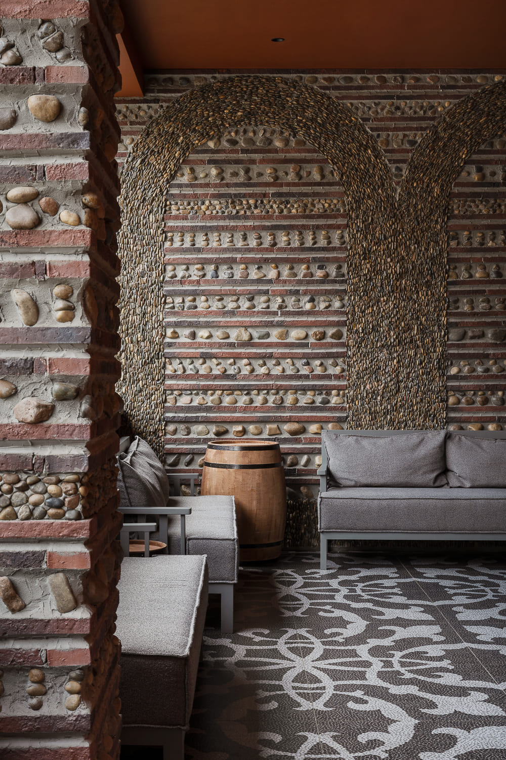 The interior is decorated mainly in gray and terracotta shades, which, along with papakha-lamps, qvevri, and the pattern of the traditional supra tablecloth refer to recognizable symbols of Georgian identity.