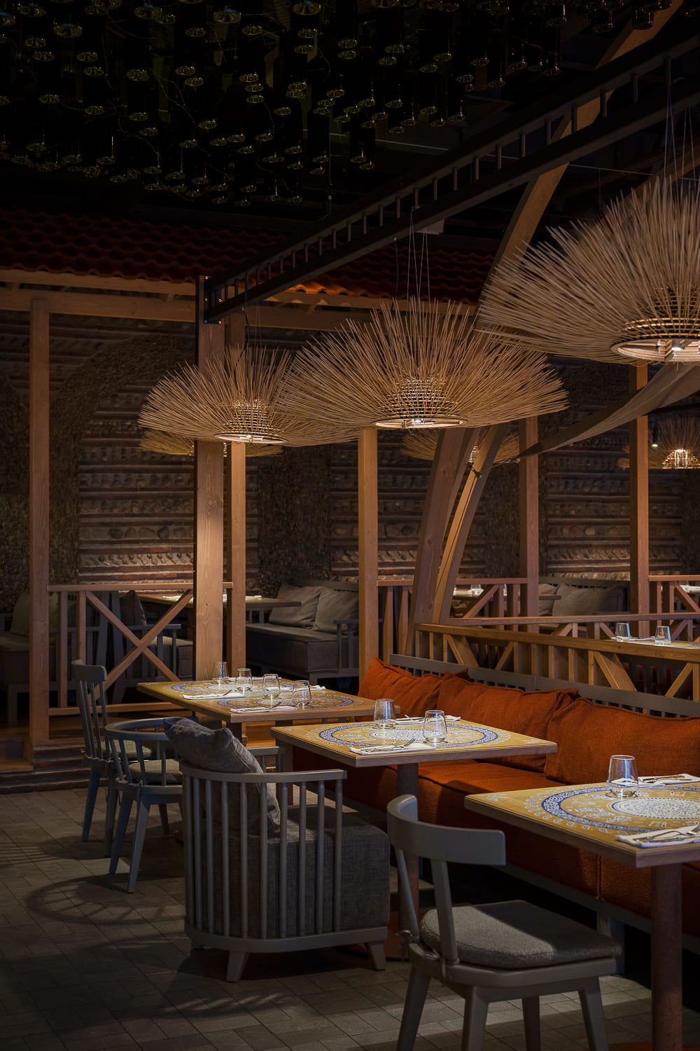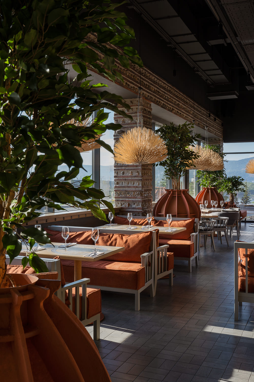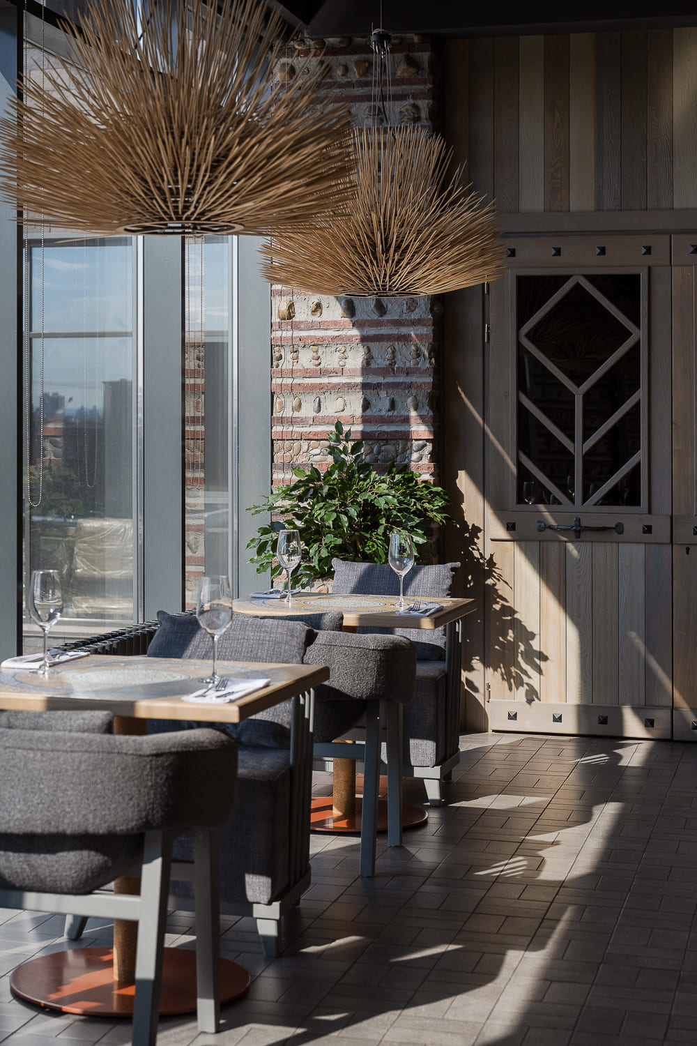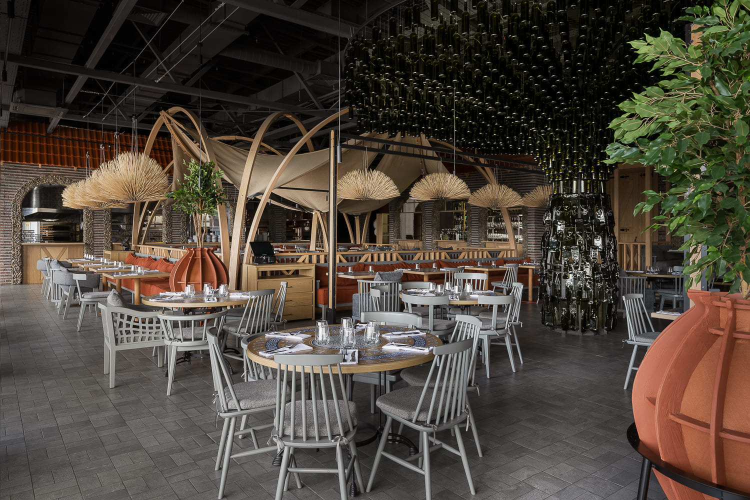 The interior is decorated mainly in gray and terracotta shades, which, along with papakha-lamps, qvevri, and the pattern of the traditional supra tablecloth refer to recognizable symbols of Georgian identity.