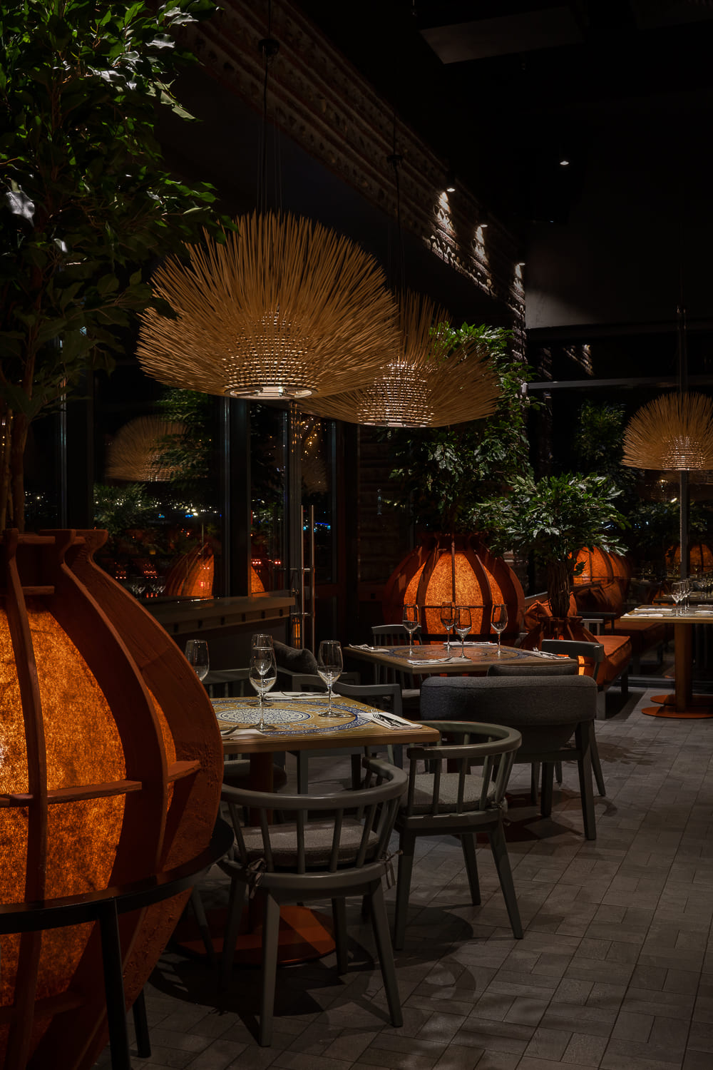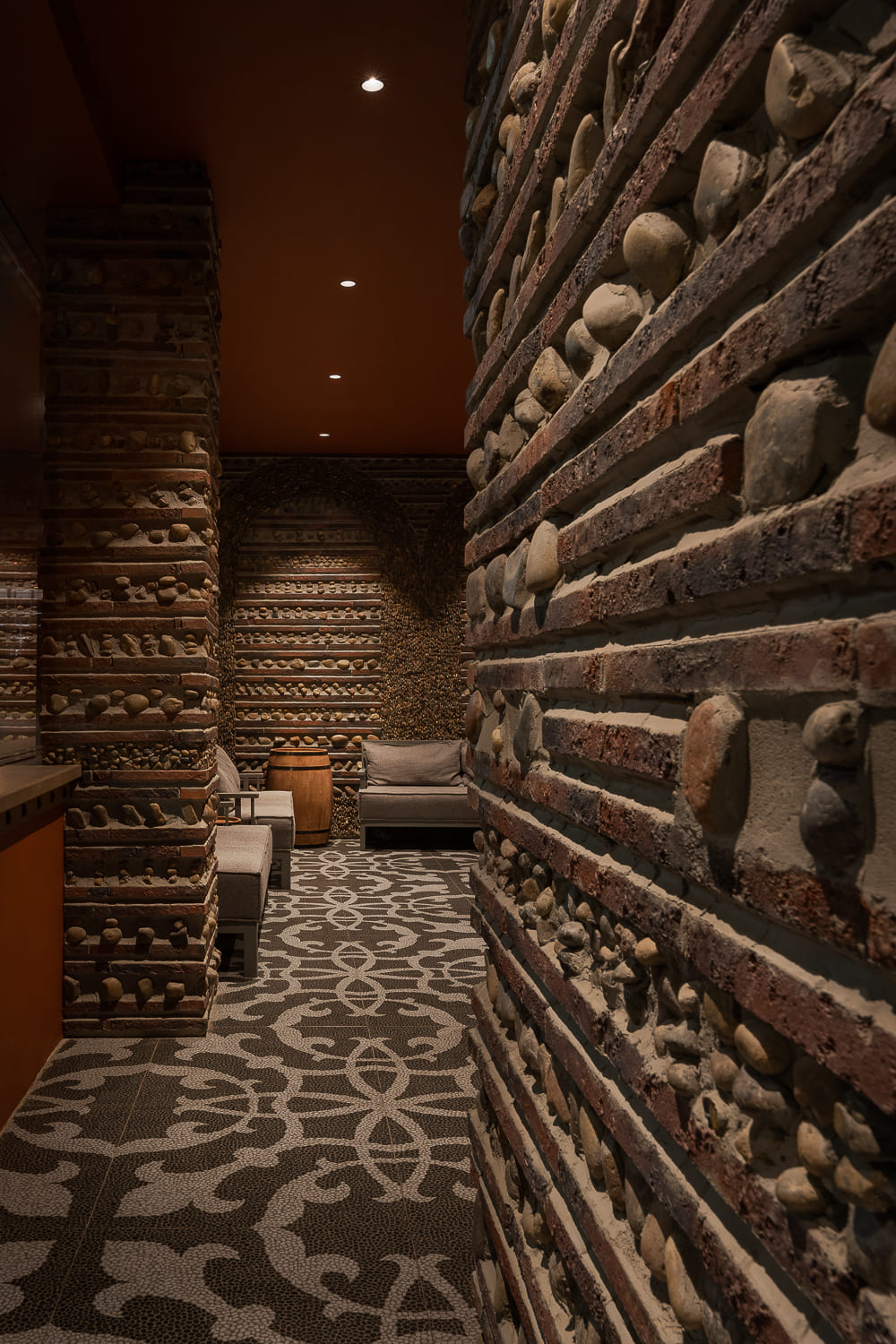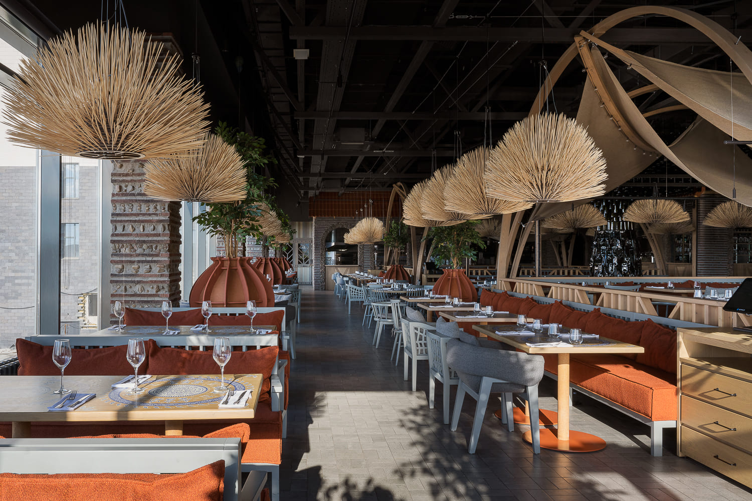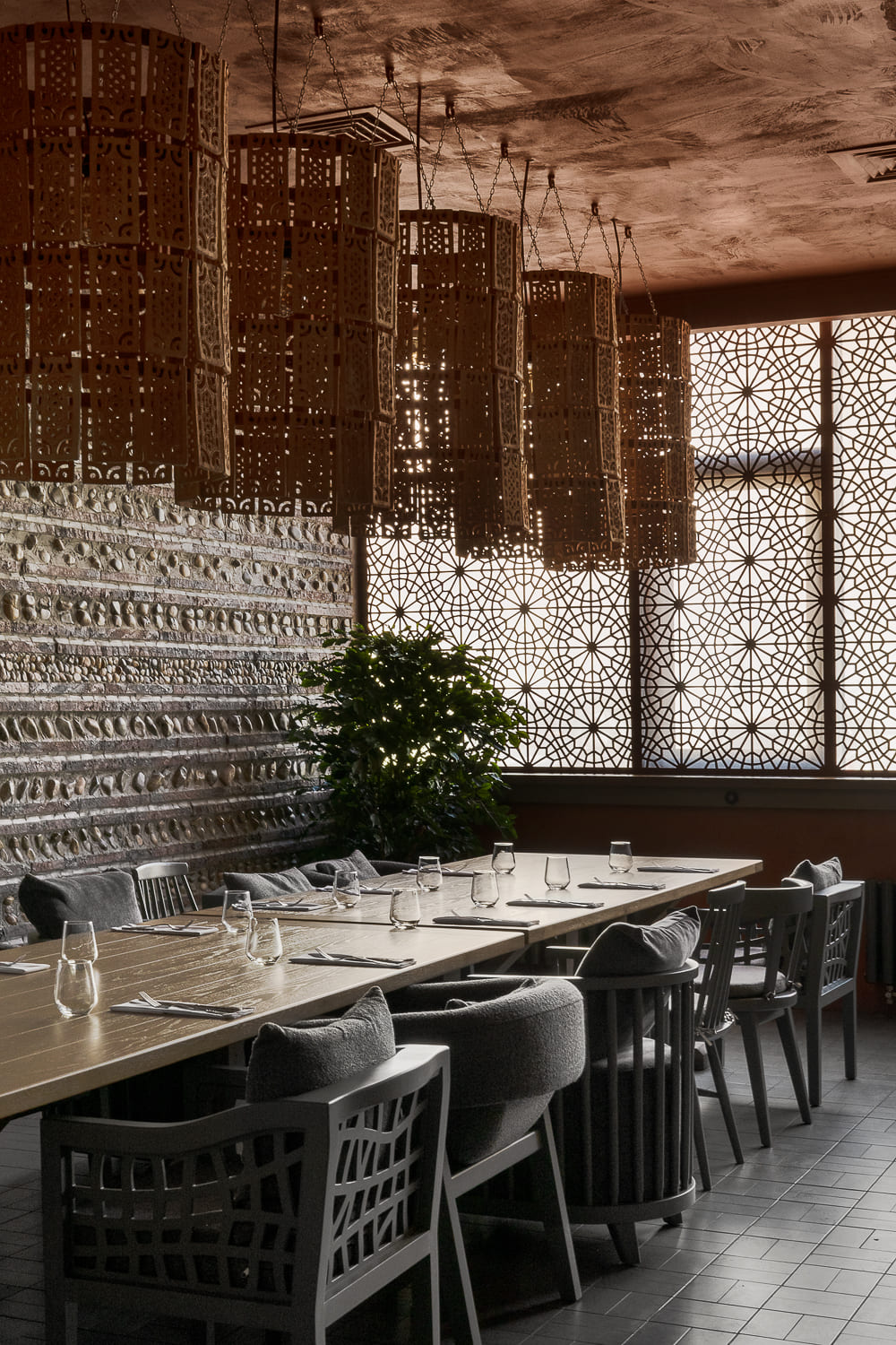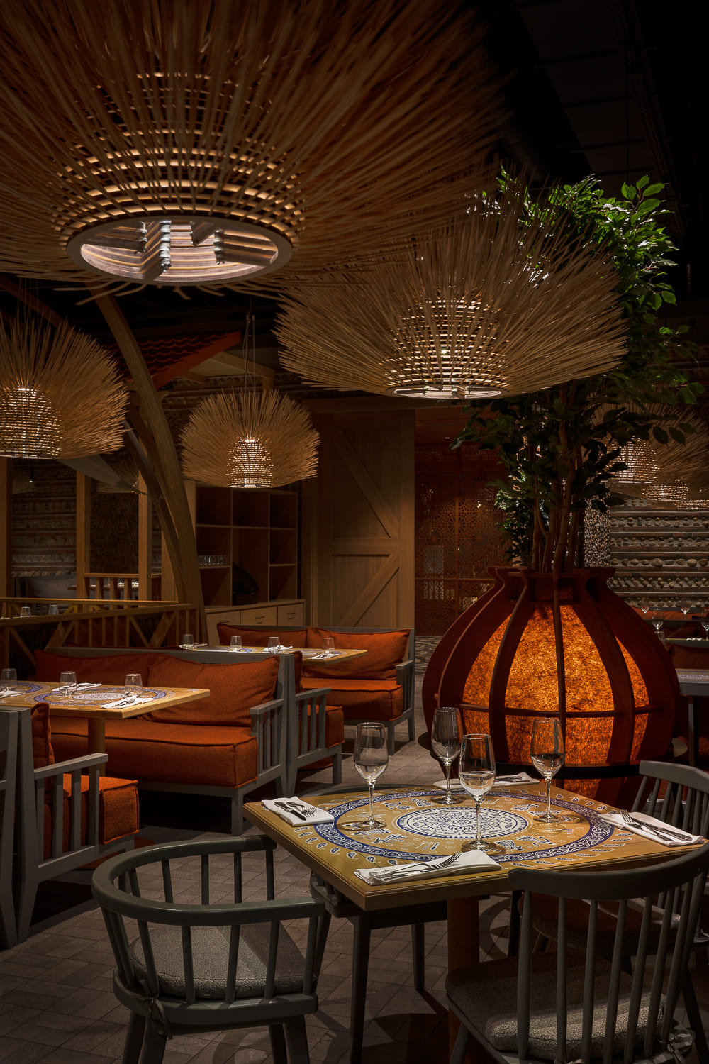 The interior is decorated mainly in gray and terracotta shades, which, along with papakha-lamps, qvevri, and the pattern of the traditional supra tablecloth refer to recognizable symbols of Georgian identity.