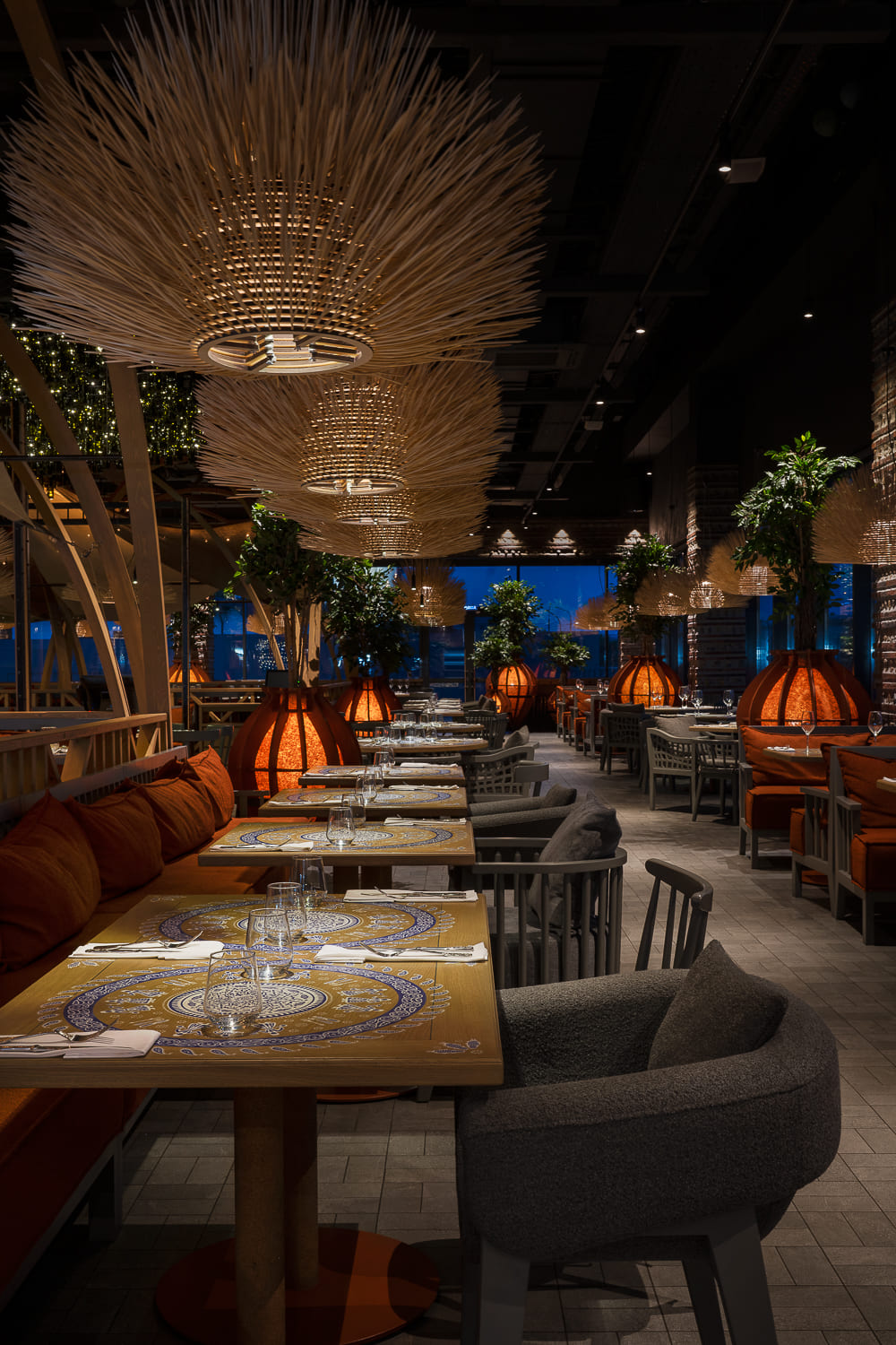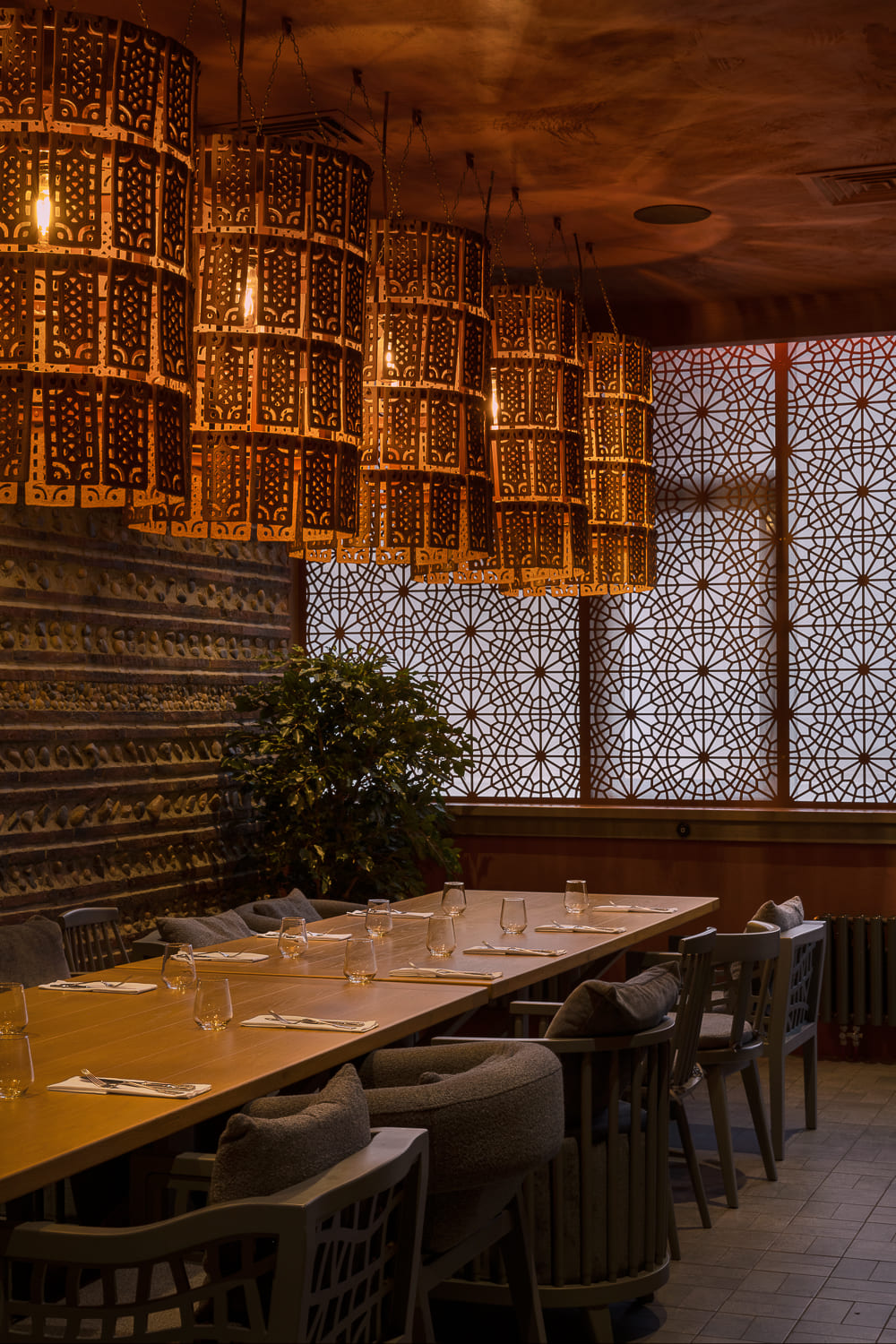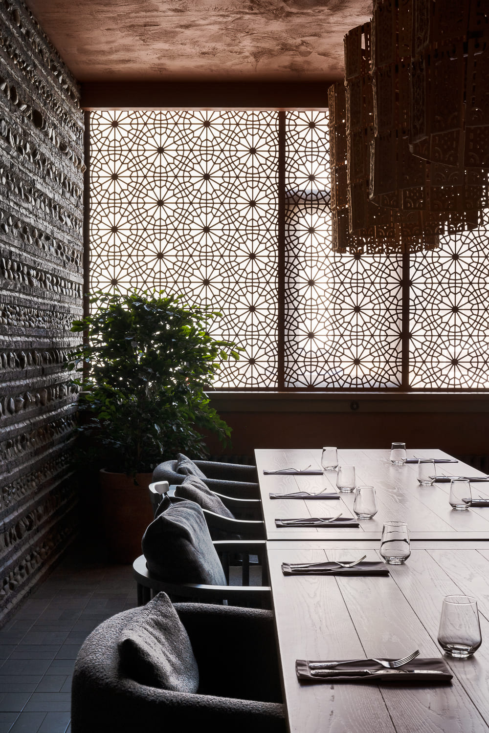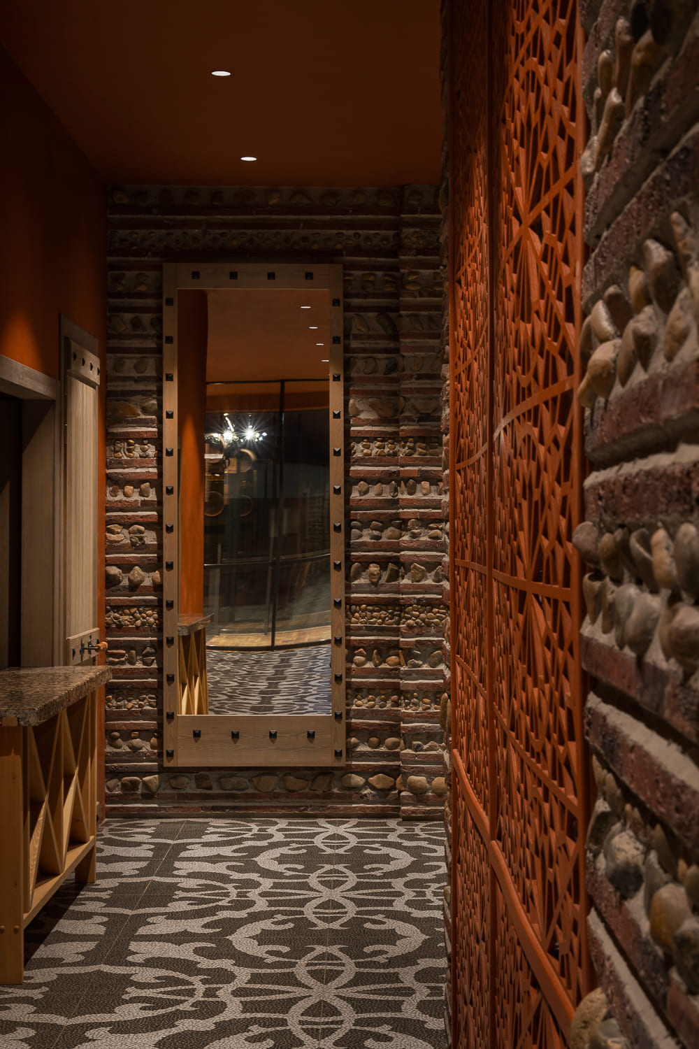 The interior is decorated mainly in gray and terracotta shades, which, along with papakha-lamps, qvevri, and the pattern of the traditional supra tablecloth refer to recognizable symbols of Georgian identity.