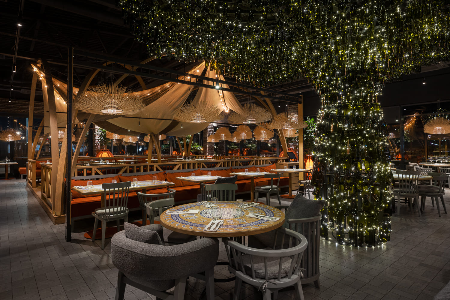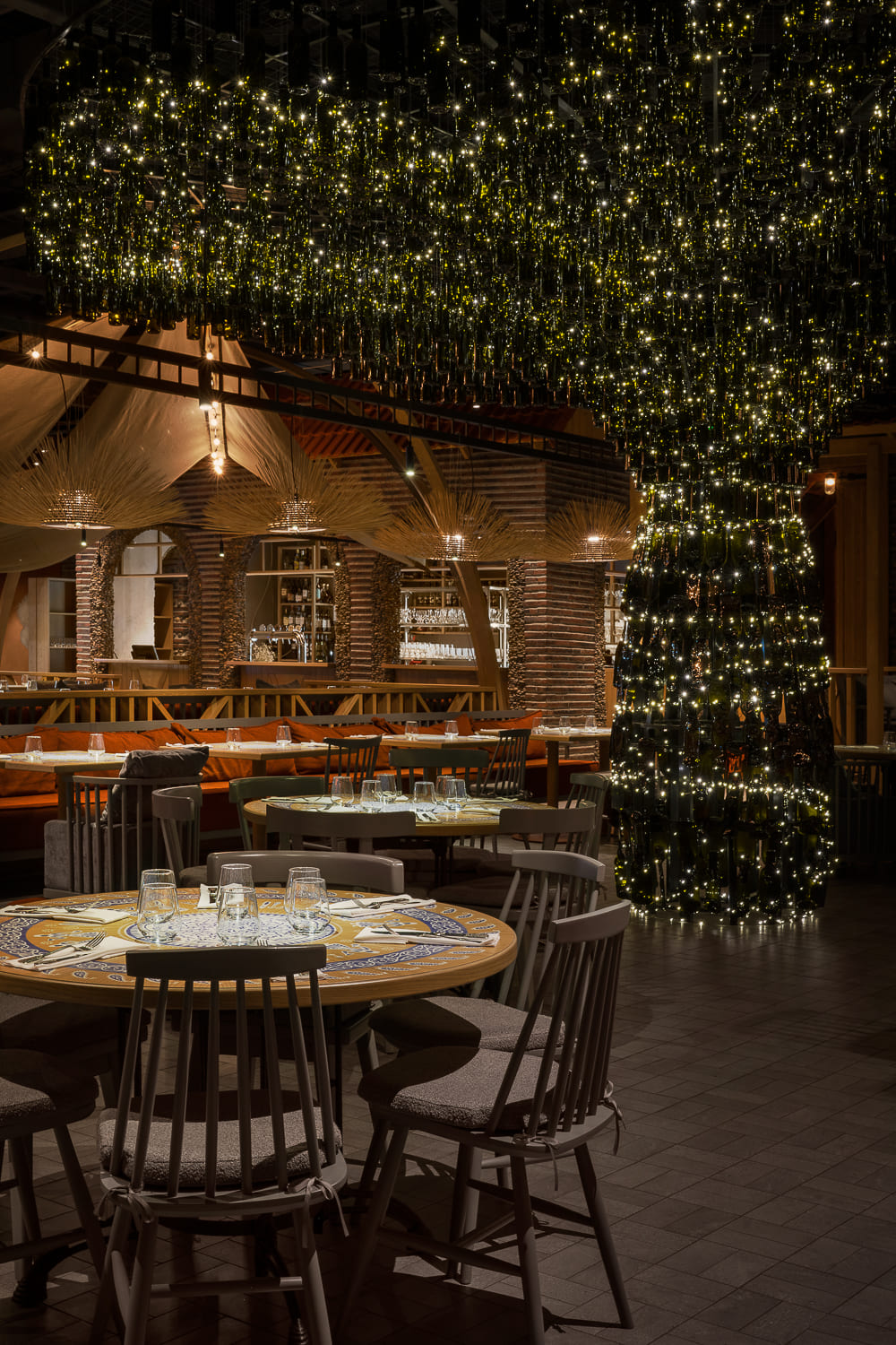 The heart of the project – the art object “Wine Tree” – is both designers’ interpretation of the famous Plane Tree, the oldest tree in Georgia, and refers to the Rtveli grape harvest festival. The crown is made of classic wine bottles, whereas to form the trunk the decorators used kiln-fired bottles, which became flat-shaped after processing – perfectly as needed for the project.