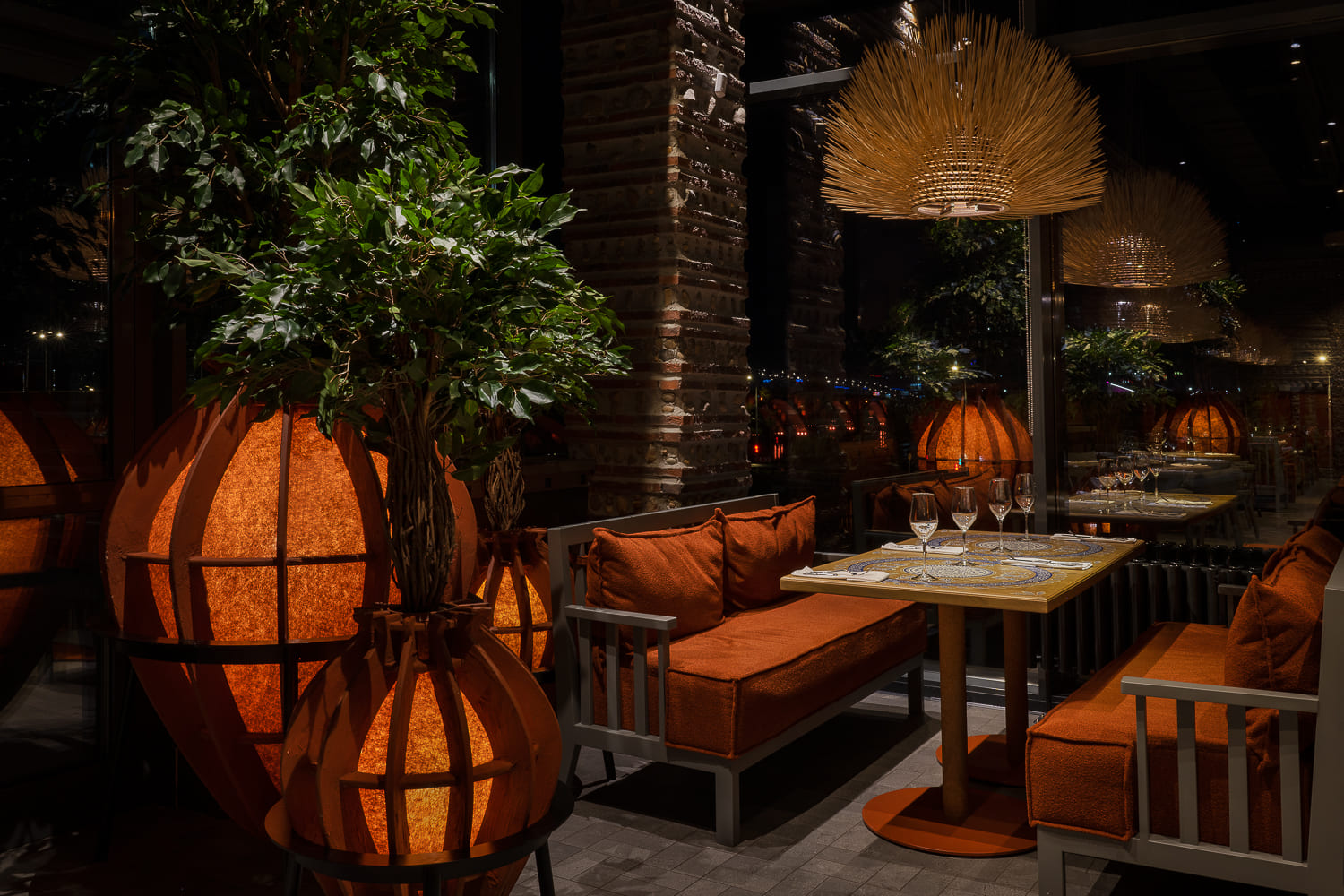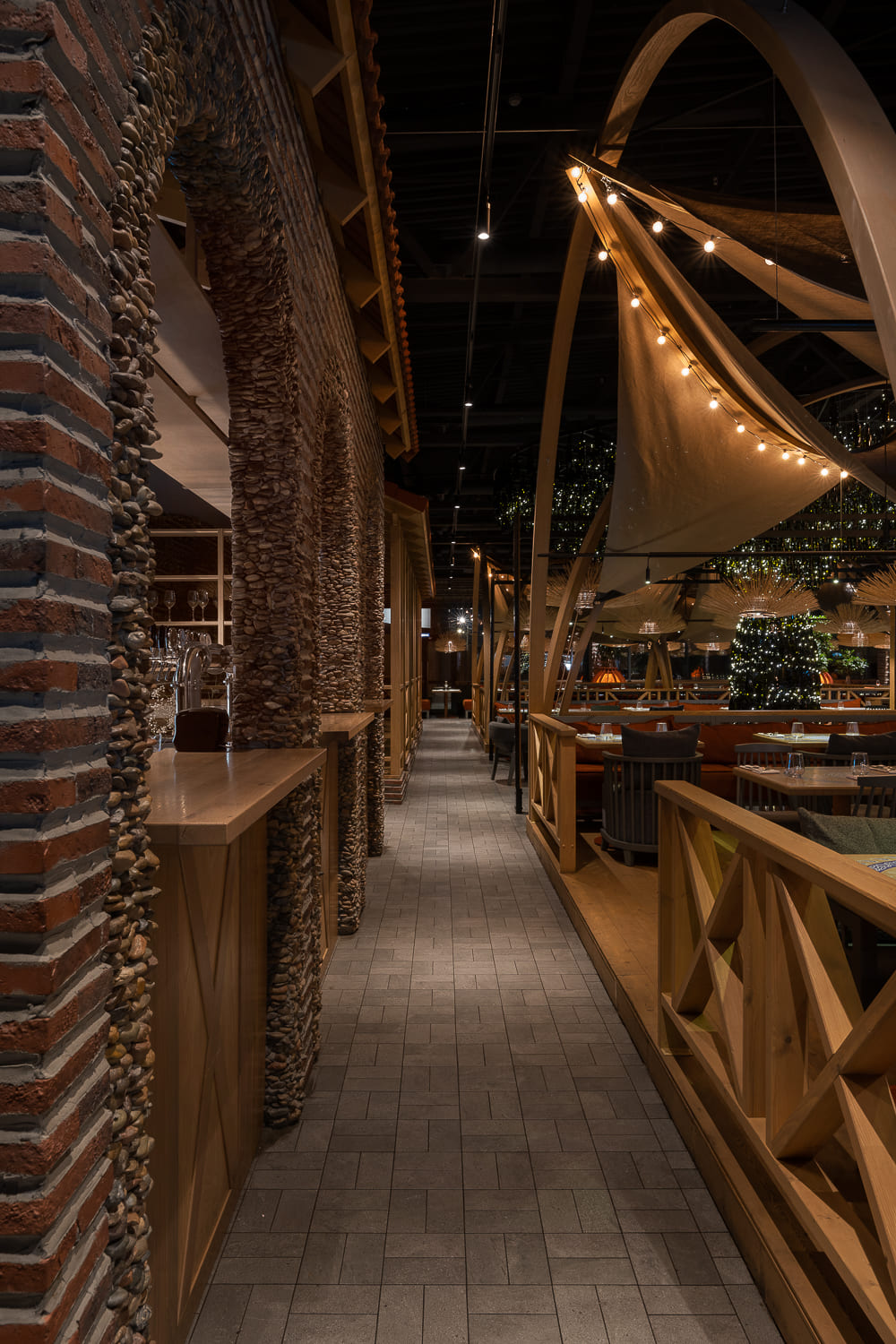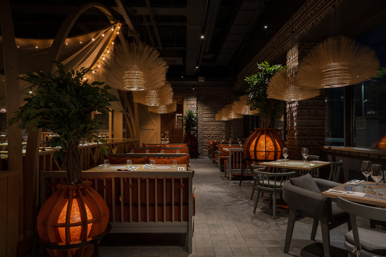 This is a recognizable stonework, canopies, tents decorated with garlands similar to summer festive pavilions, and restrooms alike to wine cellars, where young wine matures in barrels. Felt lamps, which are also tree pots, are designed based on Georgian qvevri.