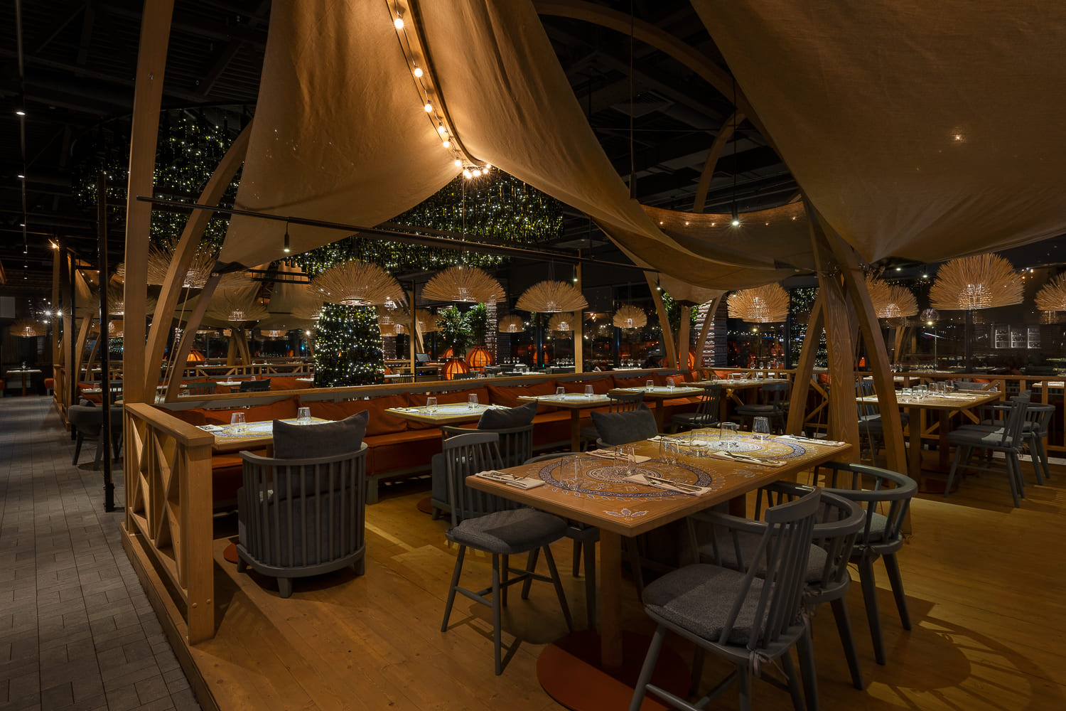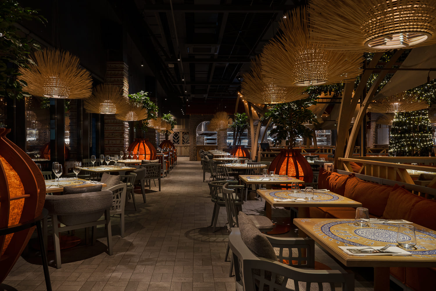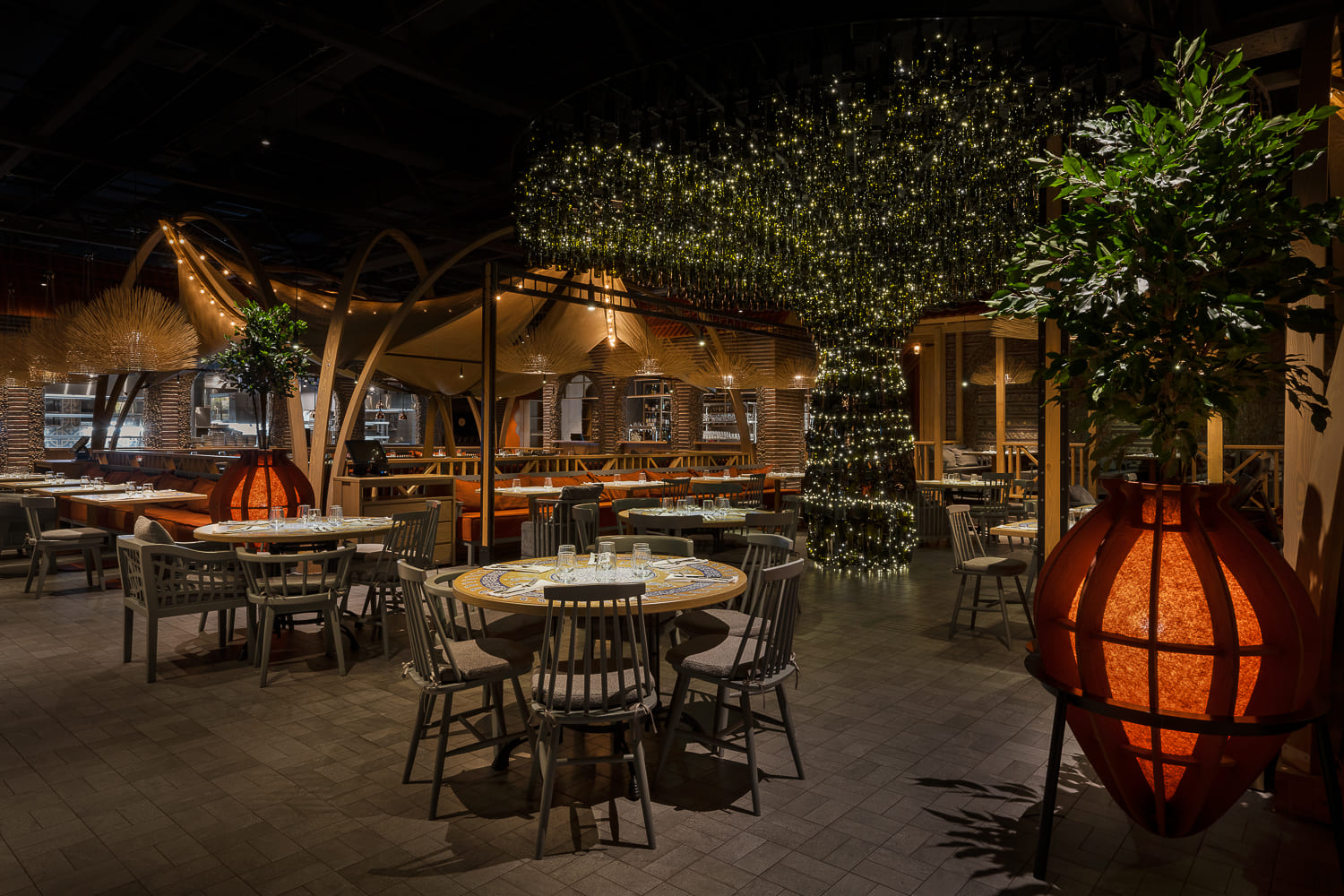 This is a recognizable stonework, canopies, tents decorated with garlands similar to summer festive pavilions, and restrooms alike to wine cellars, where young wine matures in barrels. Felt lamps, which are also tree pots, are designed based on Georgian qvevri.