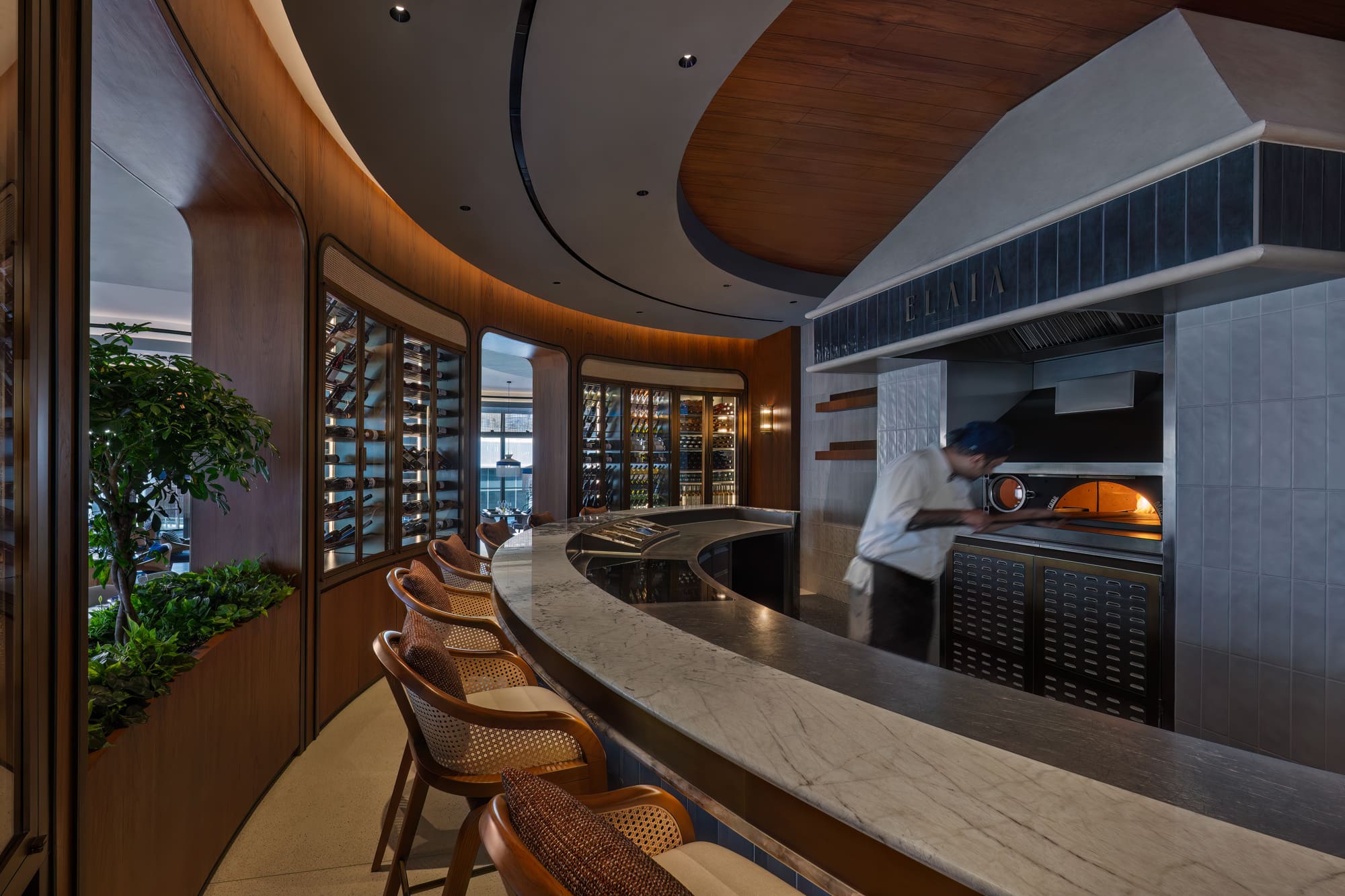 The showstopper of the space, however, is the wine cellar. It is designed as a belt to the pizza oven within, which is as an open bar counter encouraging guests to interact and become immersed in the restaurant’s lively theatrics.