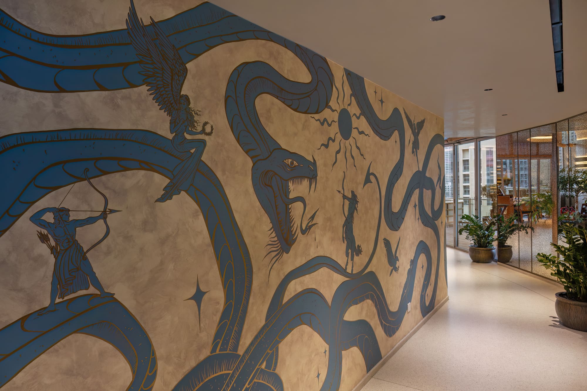 Dubai-based artist Maria Kova is behind the captivating murals across space, taking guests on a magical journey through Greek culture and mythology. From early sketches and mood boards to the final brushstroke, this journey took several months – a process that brought our vision to life in an authentic, artistic way. Drawing inspiration from Greek mythology, Maria’s narrative features mythical figures such as Triton, Poseidon, Apollo, Nike, and the Cretan Bull. Her interpretation is both whimsical and poetic, adding depth and imagination to every corner of the venue.