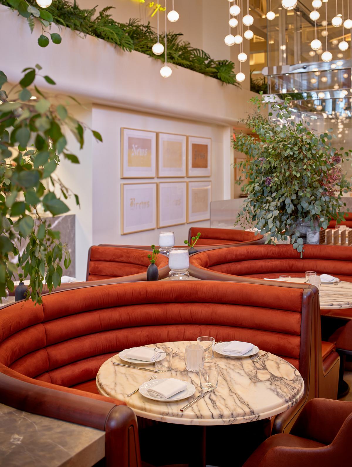 Given Funke’s Italian expertise, it’s only fitting that silhouettes, materials, and textures reference and pay homage to Italy. “I lived in Lake Como for a few years, and they have a rich history of Modernism, so there is a lot of that essence in here,” Brunn says, pointing to a carefully fabricated wood and leather detail on a curved profile banquette. Influences from seminal designers such as Carlo Scarpa, Gio Ponti, and Marco Zanuso “are in the back of my mind,” so part of the challenge was “how to put that together.” Imported stones including Crema Del Monte and Verde Imperiale marbles and Loro Piana linen wall coverings add to the quality and richness of the palette that honors and mirrors the quality of the culinary and beverage program.