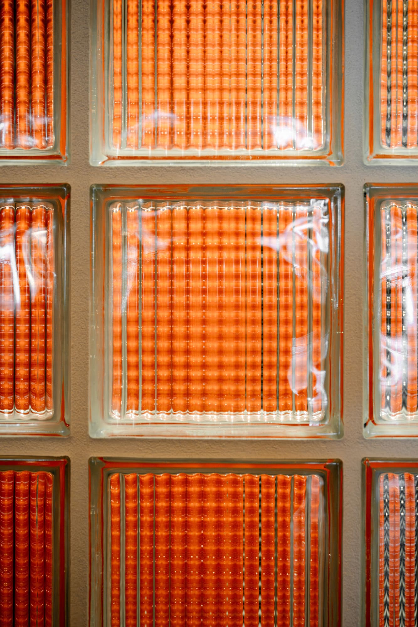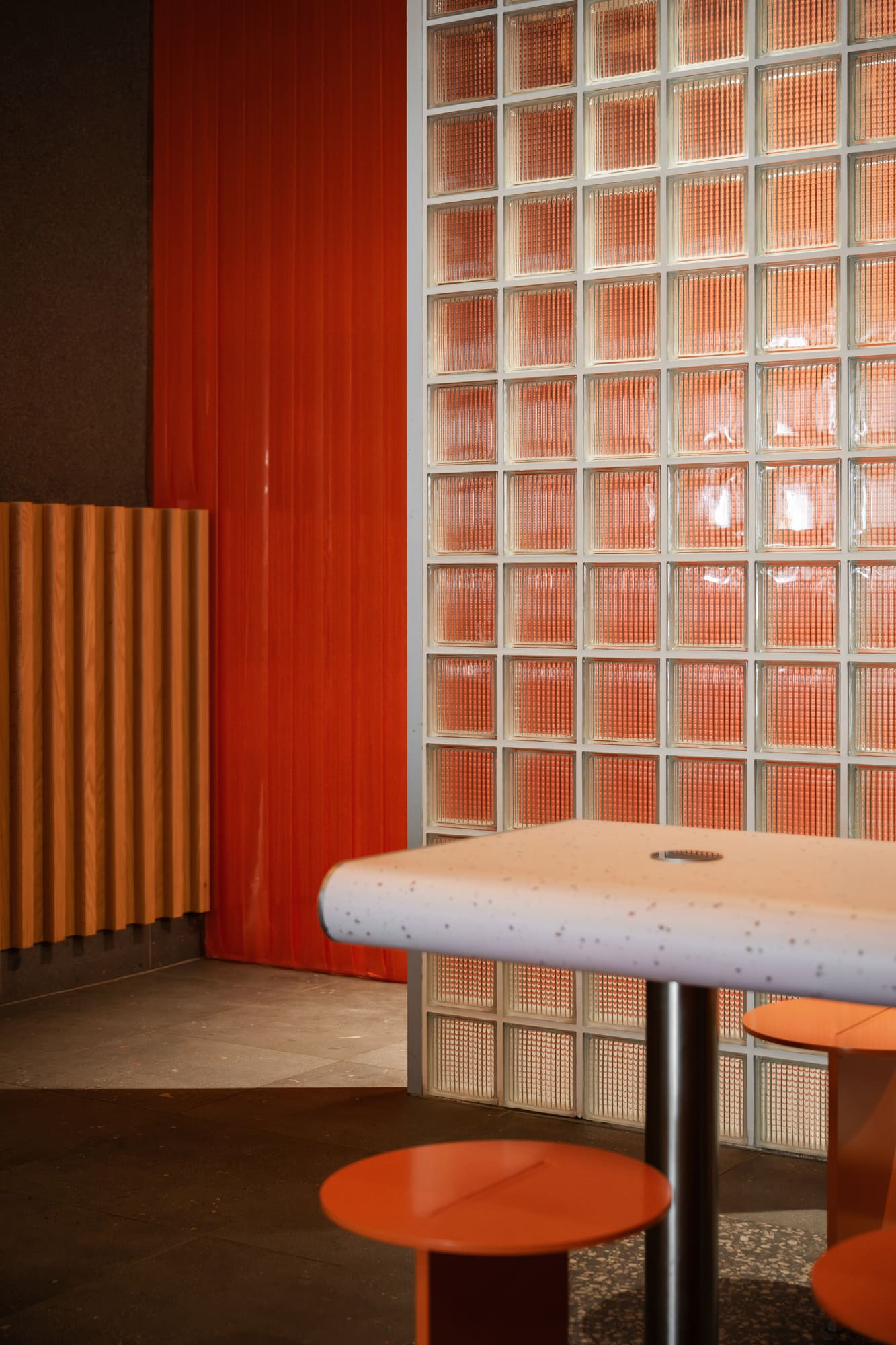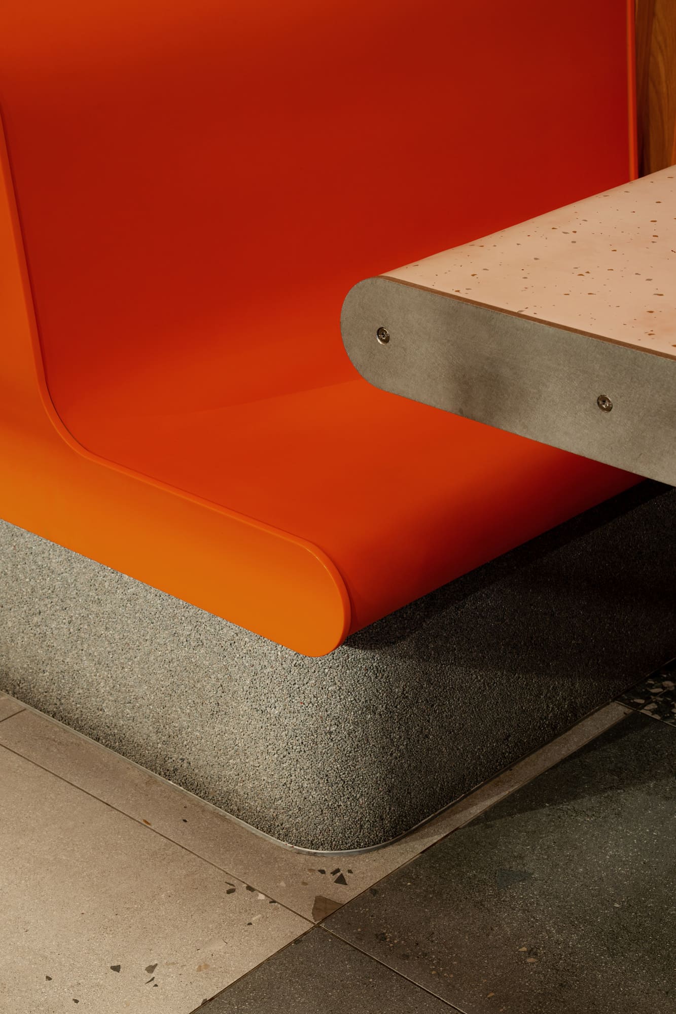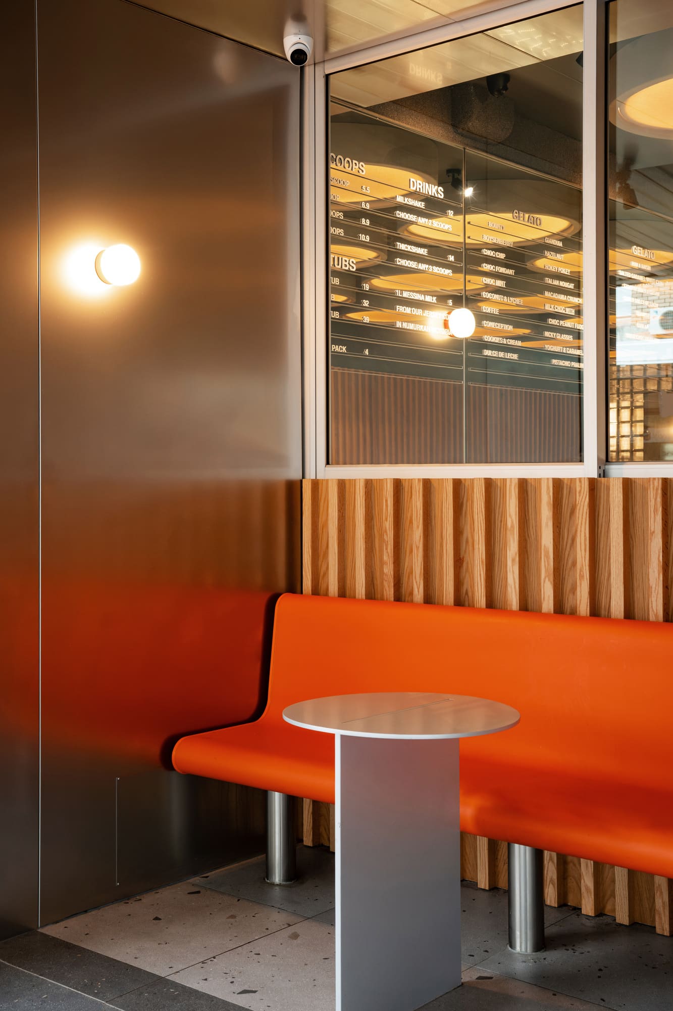 Design innovation is evident in the material approach and detailing. Combining robust, textural and unusual materials throughout the space; marmoleum wrapped tables with aluminium plate end caps, custom-made orange vinyl booth seating, bendy-ply texture coated feature ceiling lights, a ‘pixellated’ R10 porcelain tile floor pattern, quartz carpet texture coating, glass block contrasting with an orange PVC strip curtain and stainless steel counters, cabinetry and (custom) cabinetry handles.