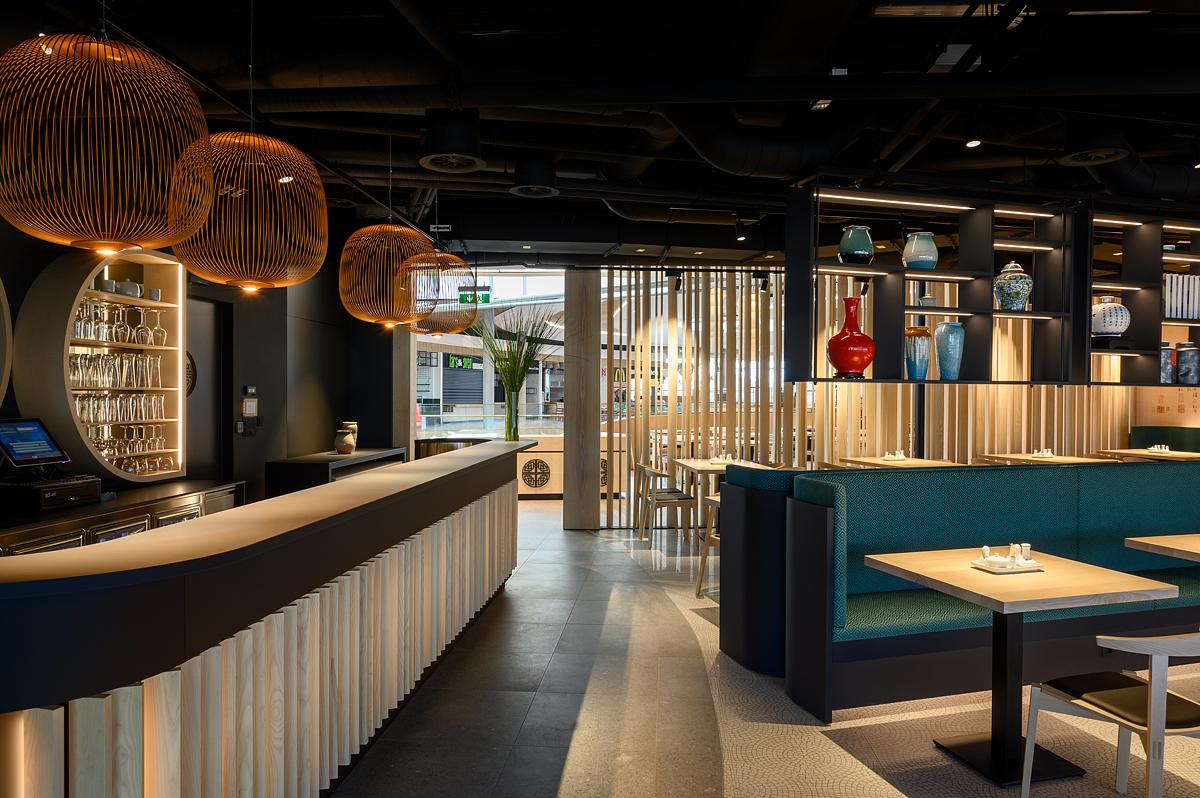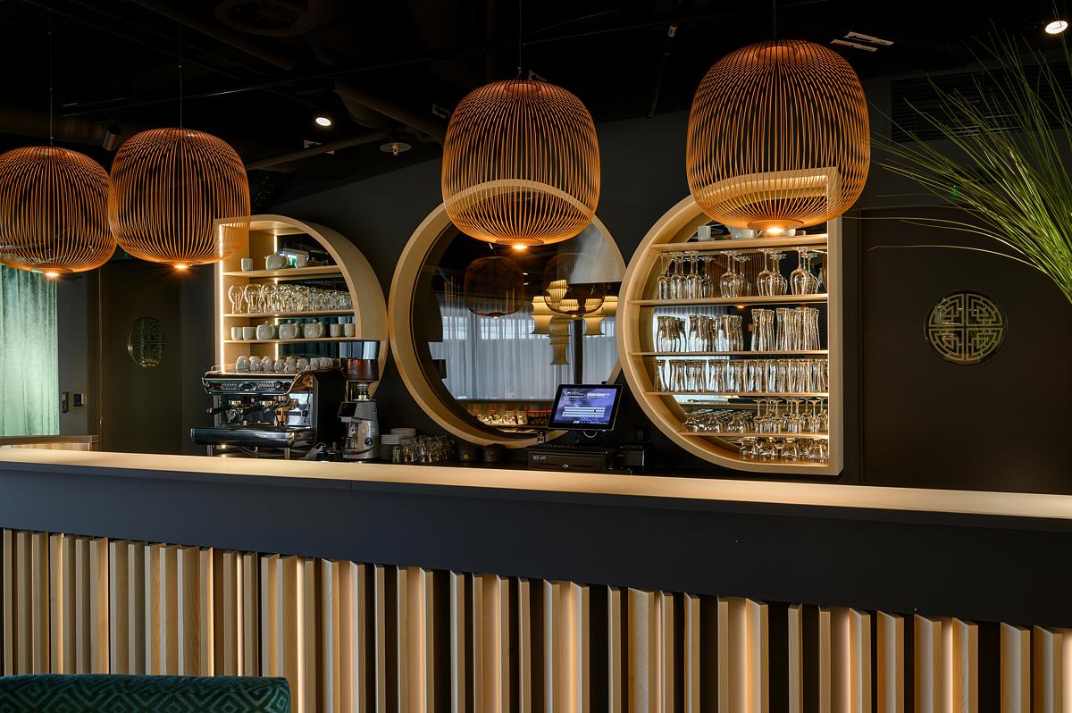 Our fundamental goal was to create an interior that gently entices onlookers and potential clients while at the same time hiding them from the noisy, illuminated area of the shopping center. This transition was made possible by the contrast and rhythm of the façade with its interchanging elements. We drew inspiration from the philosophical approach of Kengo Kuma, a master of Japanese architecture. Both the dim lighting and a balanced design of all special elements serve as a nod to Asian design and its fundamental elements.