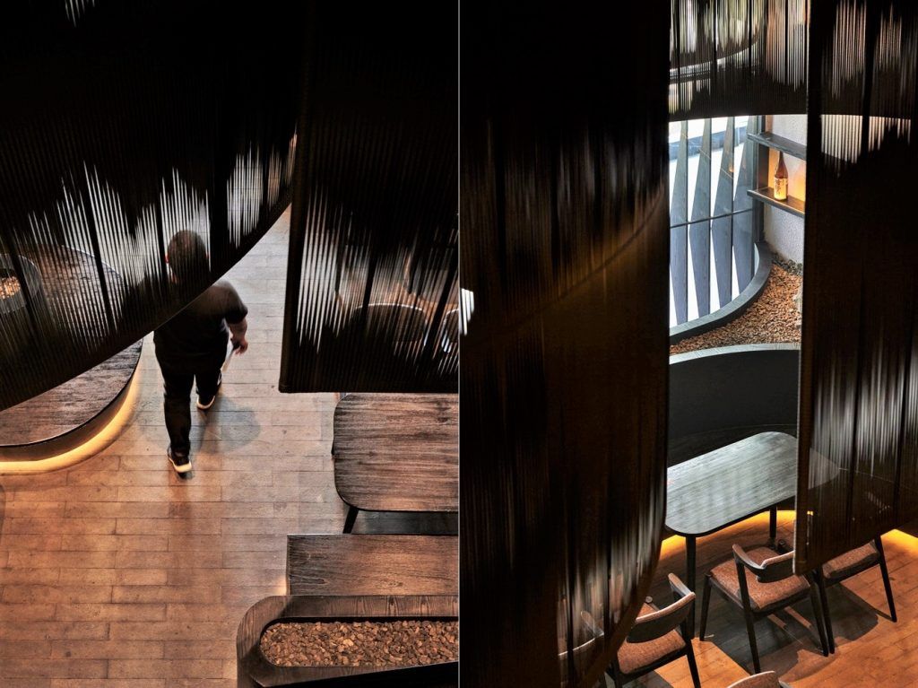 Located in the heart of Jakarta’s Central Business District Issei is a casual Japanese restaurant by day and sake bar by night. The design is inspired by organic pattern of natural landscape. This idea is translated into free flow curvatures that are applied into the geometry of the seatings and hanging screens. The main dining area is characterized by its double height ceiling space filled with large curvy hanging screens. These semi transparent screens are coordinated with the geometry of the seating layout below to give a consistent visual experience.The dark dominated color palette combined with warm illumination gives an enigmatic yet warm interior atmosphere. Locally dan naturally sourced materials such as dark stained wood, natural stone and gravel are combined to simulate an experience of being outdoor in the nature.At the back of the main dining area there is smaller, more intimate dining space with direct access to the main bar. This space has different seating arrangement to cater to smaller group patrons who is seeking for more quiet space. Additional mezzanine floor was added in the restaurant to give extra space for a private meeting room. To contrast the dining area, the private room has different wood finish to give a brighter, warmer and cozy ambiance.Vertical wooden fins are introduced on the facade of this restaurant to reduce sun fenestration from the west. In addition to its function to filter the sunlight the fins also contribute to the aesthetic of the facade. Each of the fins has its particular shape which collectively they construct an undulation form on the facade representing natural form.
